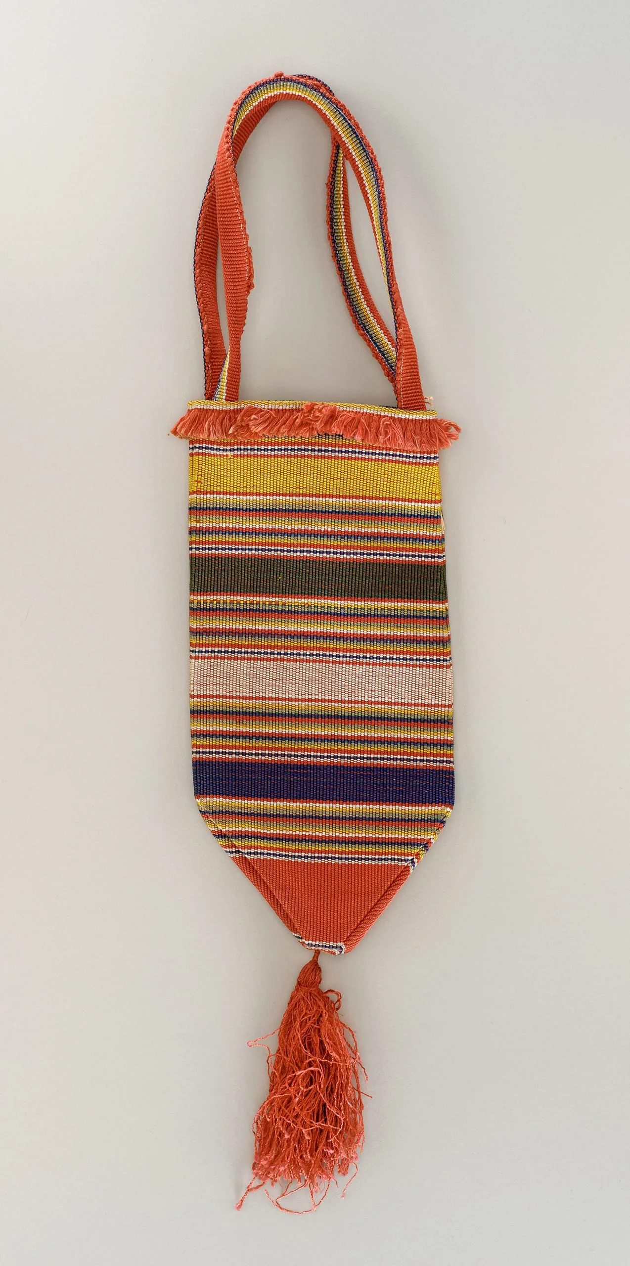 Woven textile bag with horizontal multicolor stripes, tapering to a pointed bottom with a rust-orange tassel, and a long woven shoulder strap