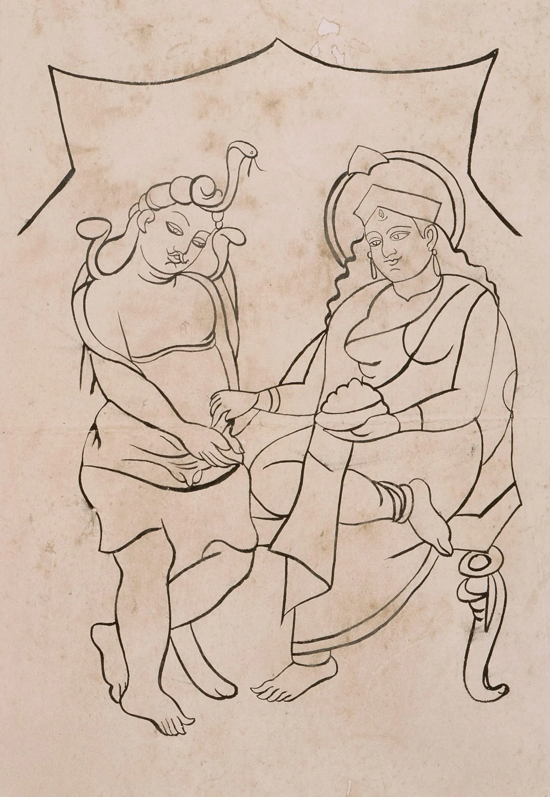 Dramatically and quickly rendered Kalighat paintings and ink drawings were sold in the bazaars near the revered temple of the goddess Kali in the Kalighat area of southern Kolkata (formerly Calcutta). Of all the painterly styles and techniques current in cosmopolitan 19th- and early 20th-century Calcutta, including Western oil paintings, graphics, and watercolors by British and Continental artists; Western-style works by classically trained Indian artists; and traditional Hindu and Indo-Islamic works of art, Kalighat paintings and drawings were the most innovative and had the strongest influence on later generations of early modern and contemporary South Asian artists. See also M.86.118.1 and M.86.118.2.