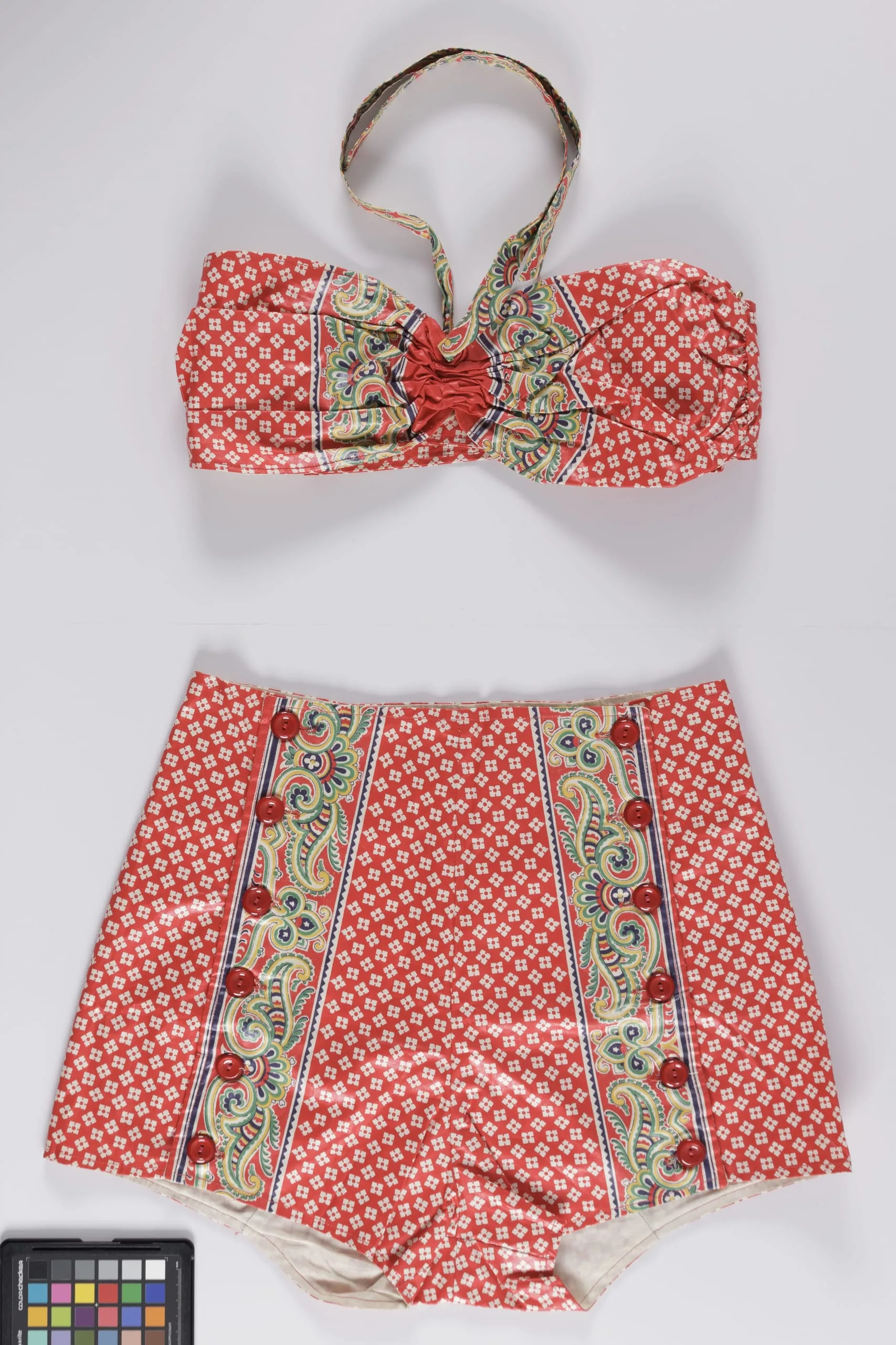 - Top: Cotton plain weave, printed and glazed. Shorts: Cotton plain weave, printed and glazed, with plastic buttons.