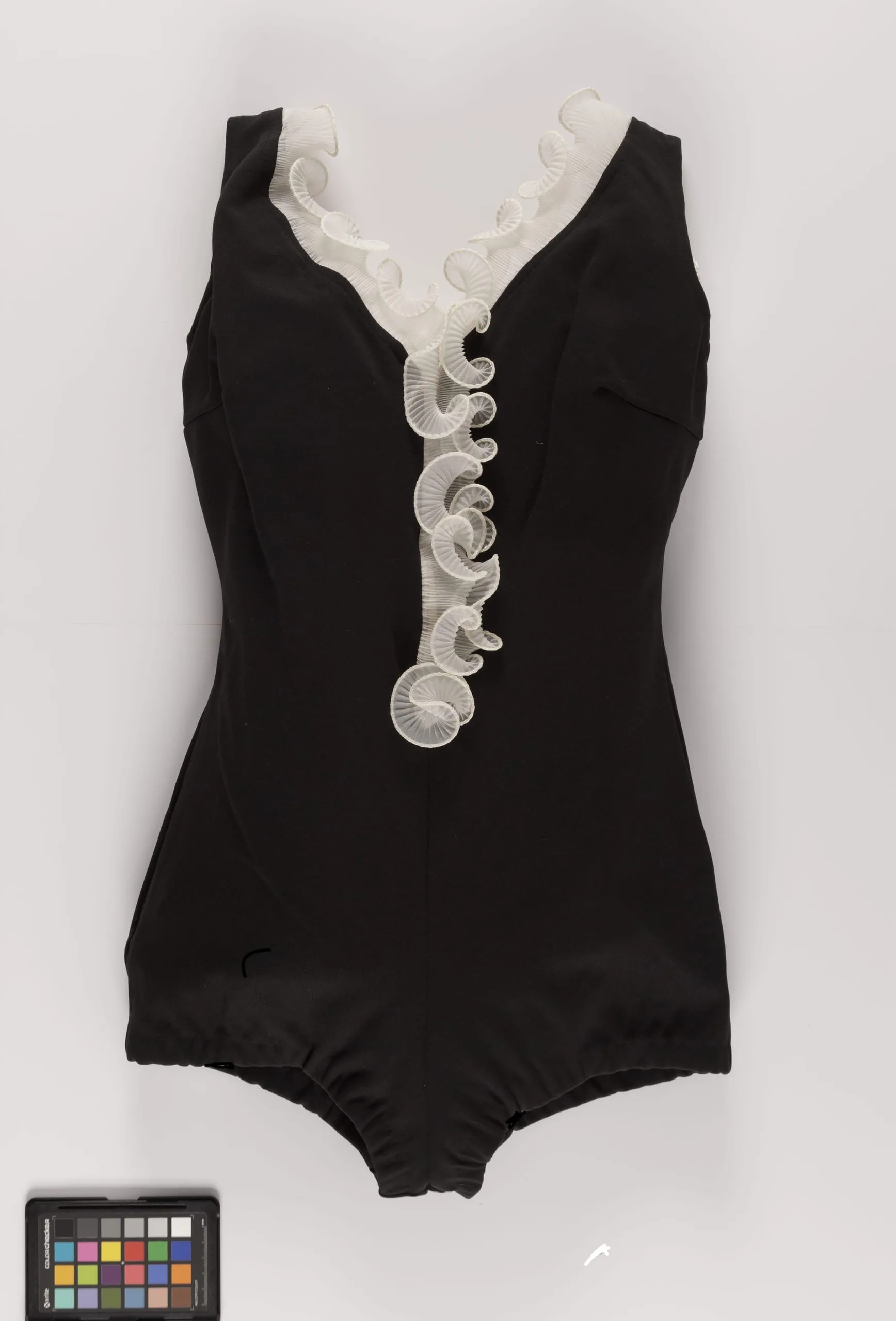 - .Jacket: nylon knit, nylon plain weave (chiffon), with heat set pleats; Swimsuit: nylon knit, nylon plain weave (chiffon) with heat set pleats