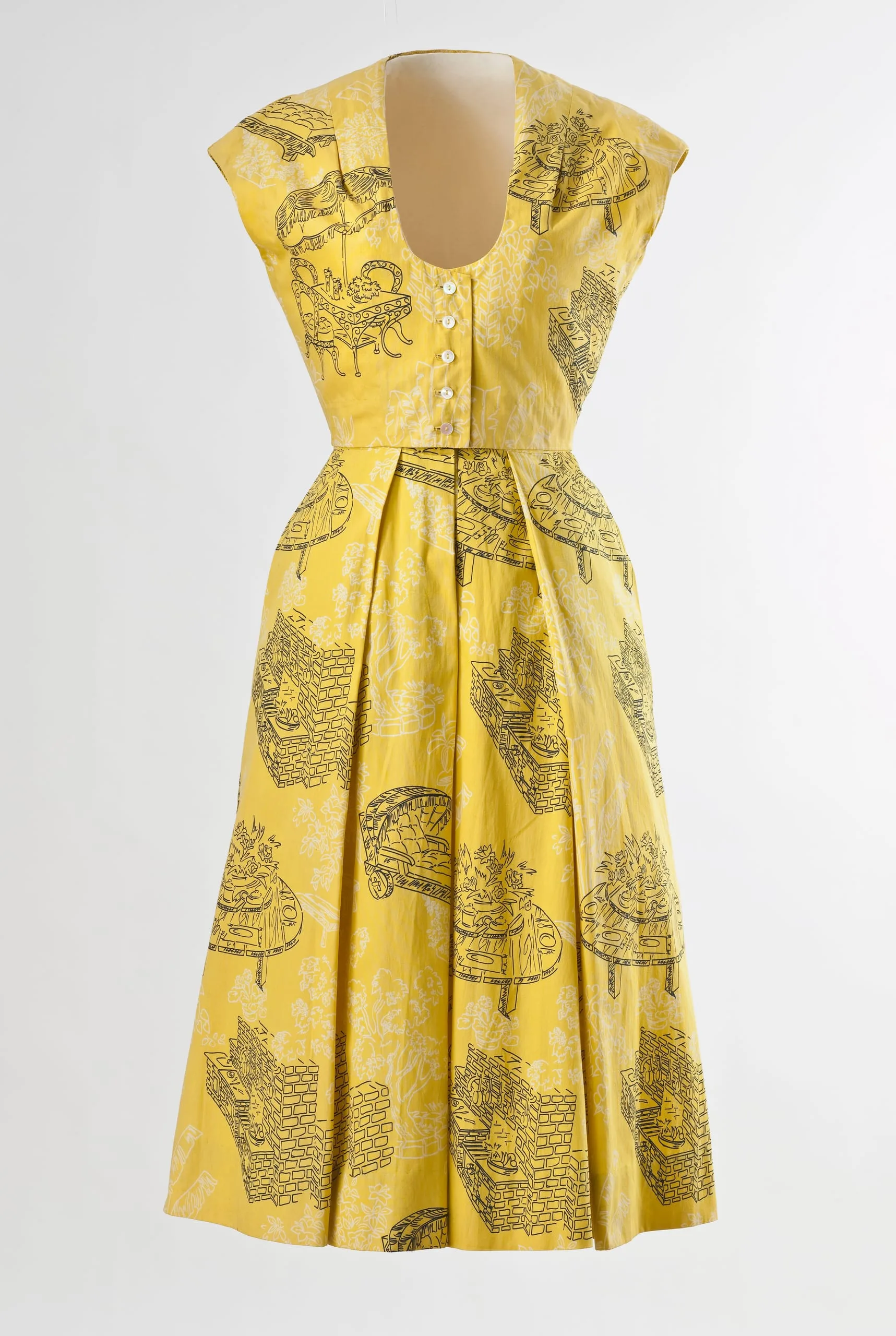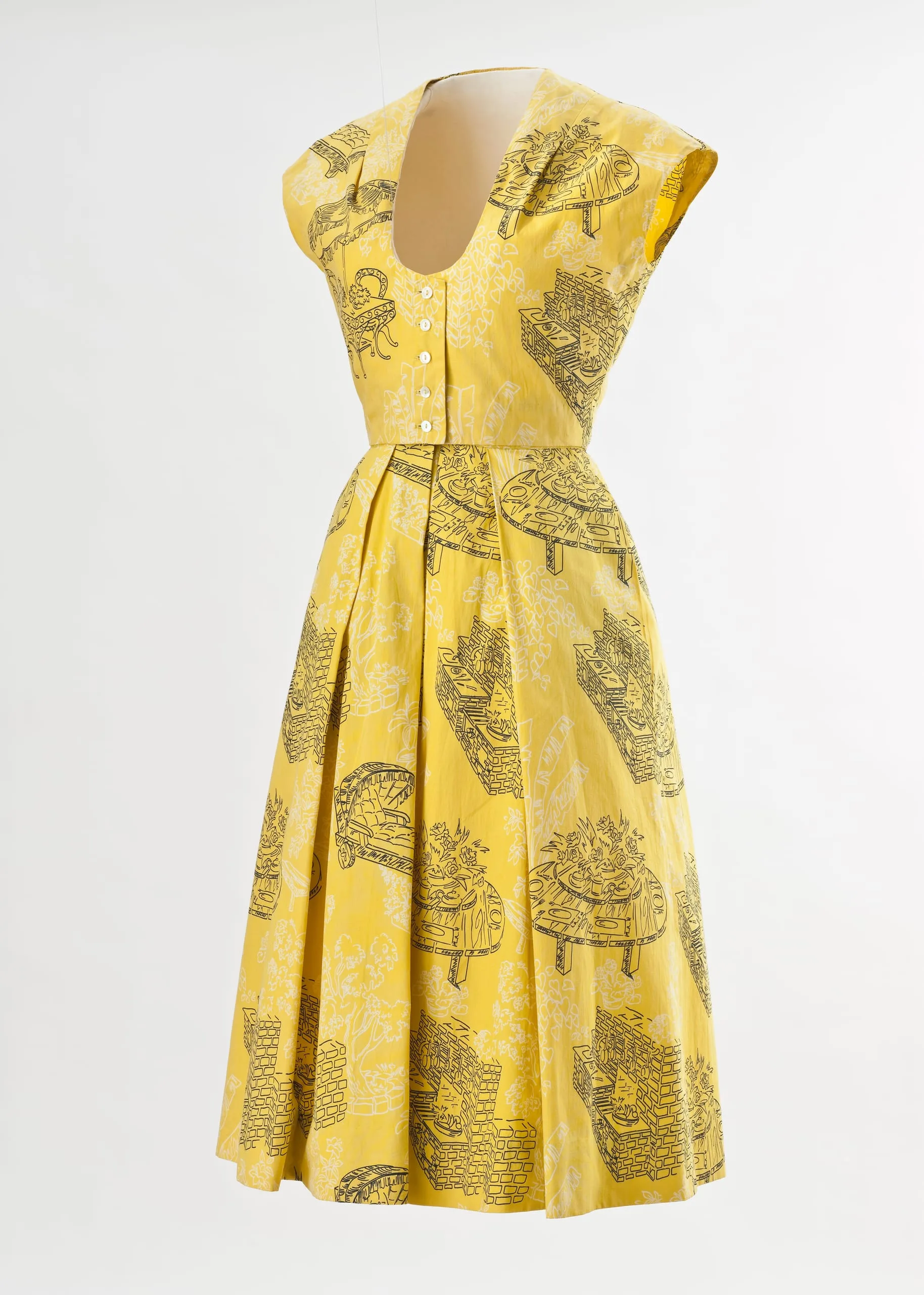 One of California’s most influential contributions to American fashion was the bathing suit ensemble—consisting of any combination of bathing suit, skirt, shorts, pants, and top of the same fabric to mix and match to fit the occasion. Colorful prints reflected California’s indoor/outdoor lifestyle; DeDe Johnson’s skirt, shorts, and top feature picnic tables and barbecue grills.
