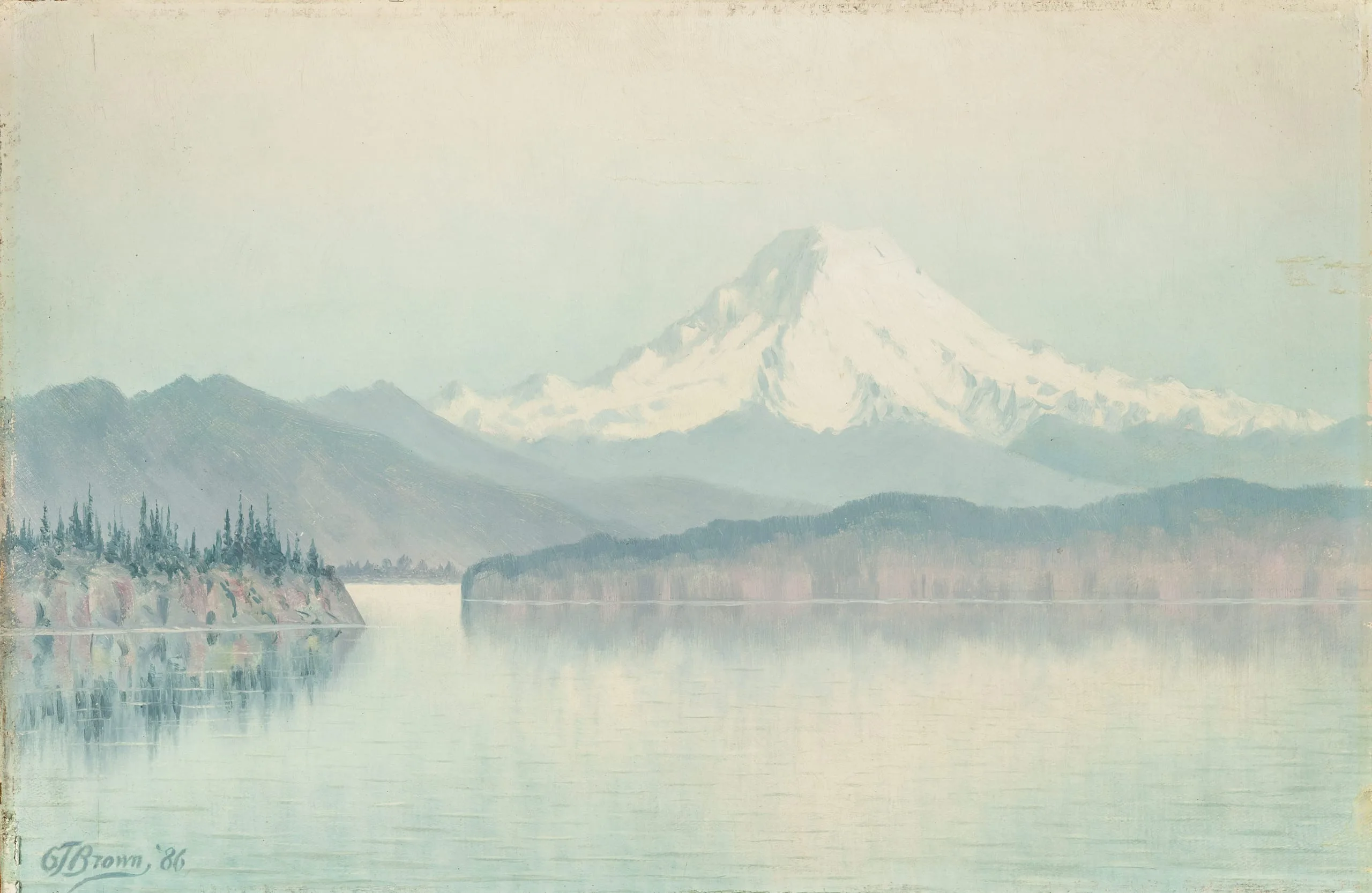 Brown’s View of Mount Rainier comes from this particular time in the artist’s career. Like his French contemporaries, the Impressionists, Brown was fascinated by the effect of light and atmospheric changes on a single, outdoor subject. He repeatedly returned to the same natural settings to capture them at different angles, and in different weather and seasons. LACMA’s painting is one of several documenting the artist’s studies of Washington’s MountTacoma (now Mount Rainier). However, unlike the loose, gestural style of the Impressionists, Brown’s paintings maintain the meticulous realist perspective and line of his lithographs.