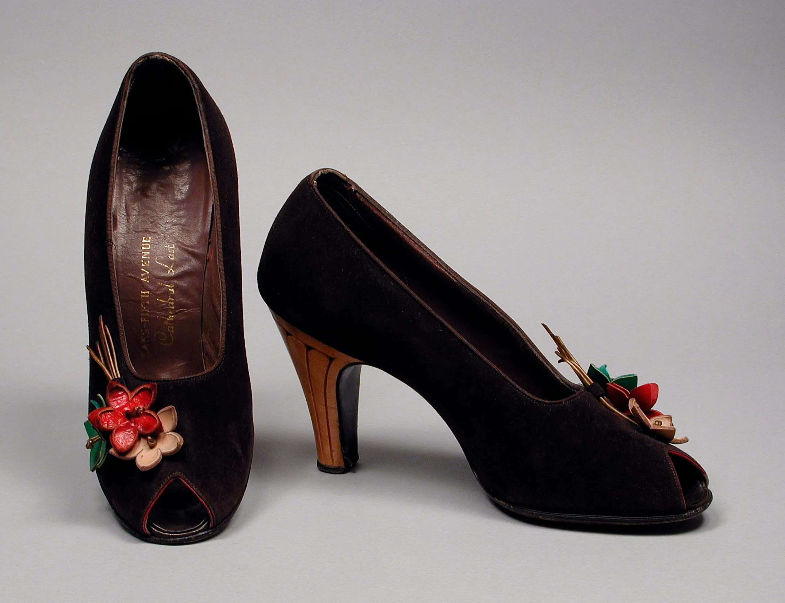 - Leather (suede), with leather and plastic-coated wire appliqué and wood