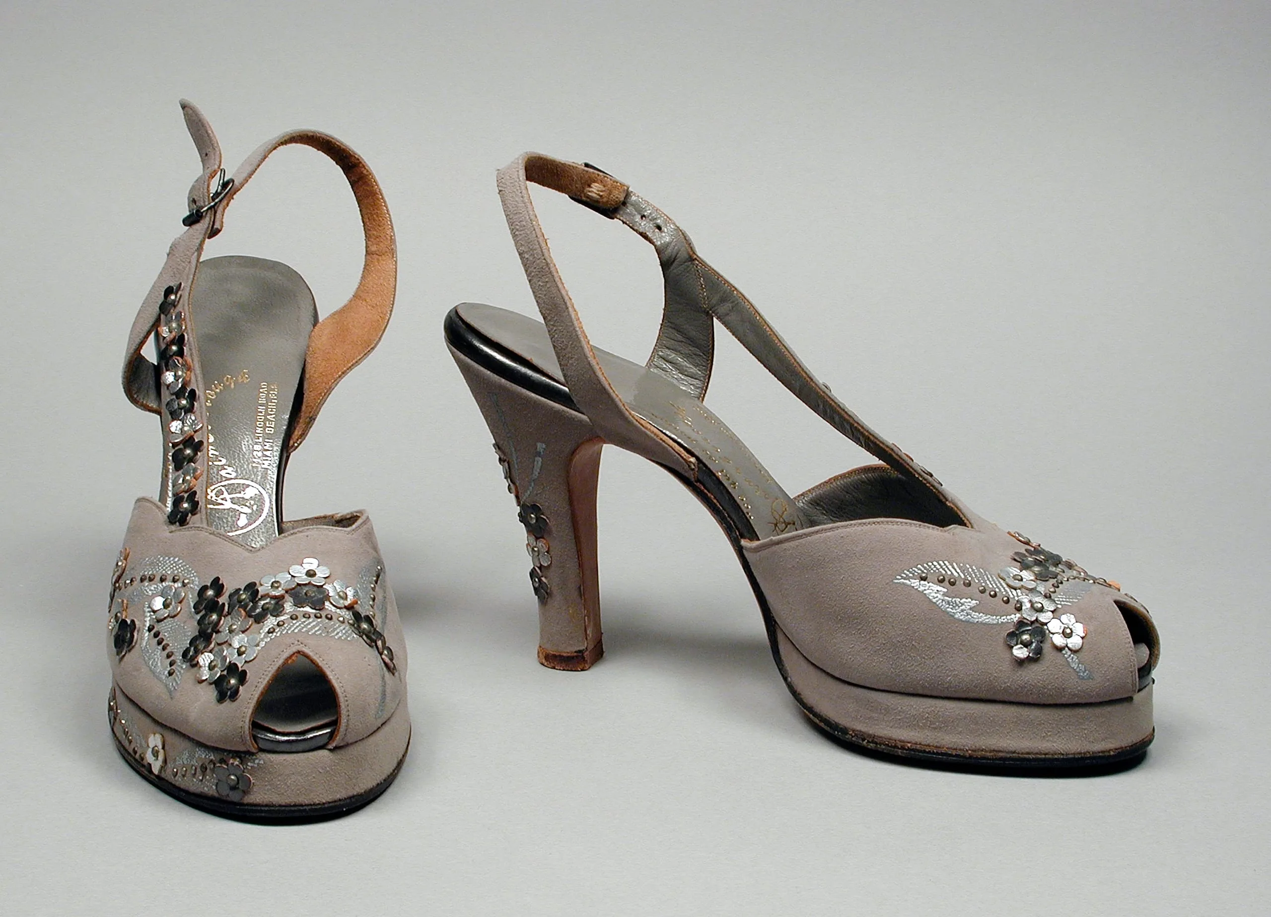 - Leather (suede), with leather appliques, metal studs, and metallic paint