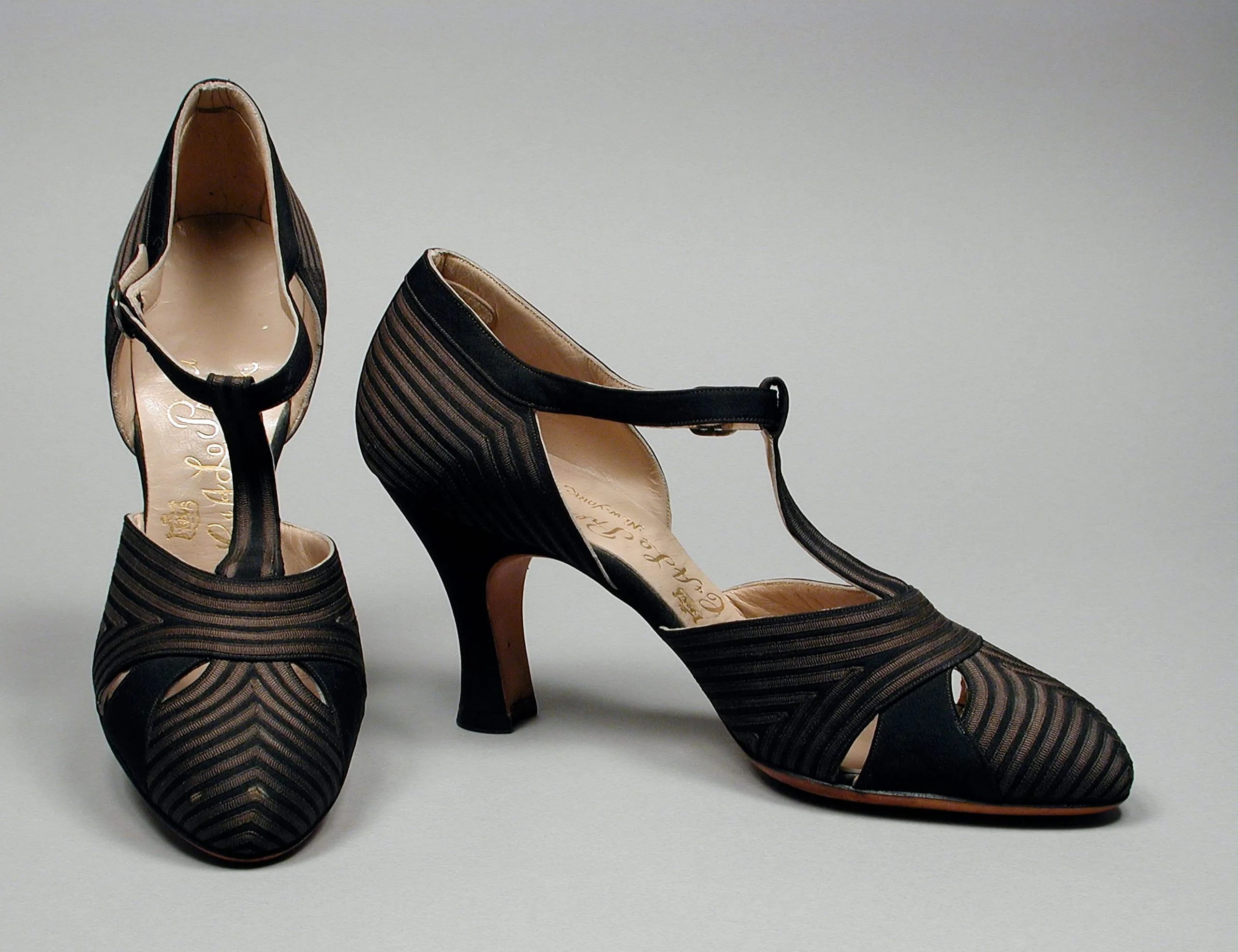 - Silk plain weave (faille) with silk grosgrain ribbon appliqué, and leather