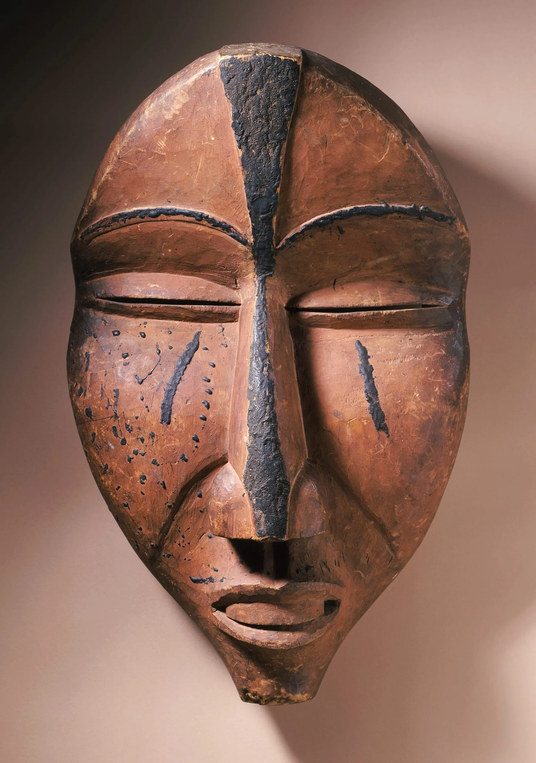Carved wooden face mask with chestnut-brown surface, bold vertical black pigment stripe from forehead through nose, and slit-like carved eyes