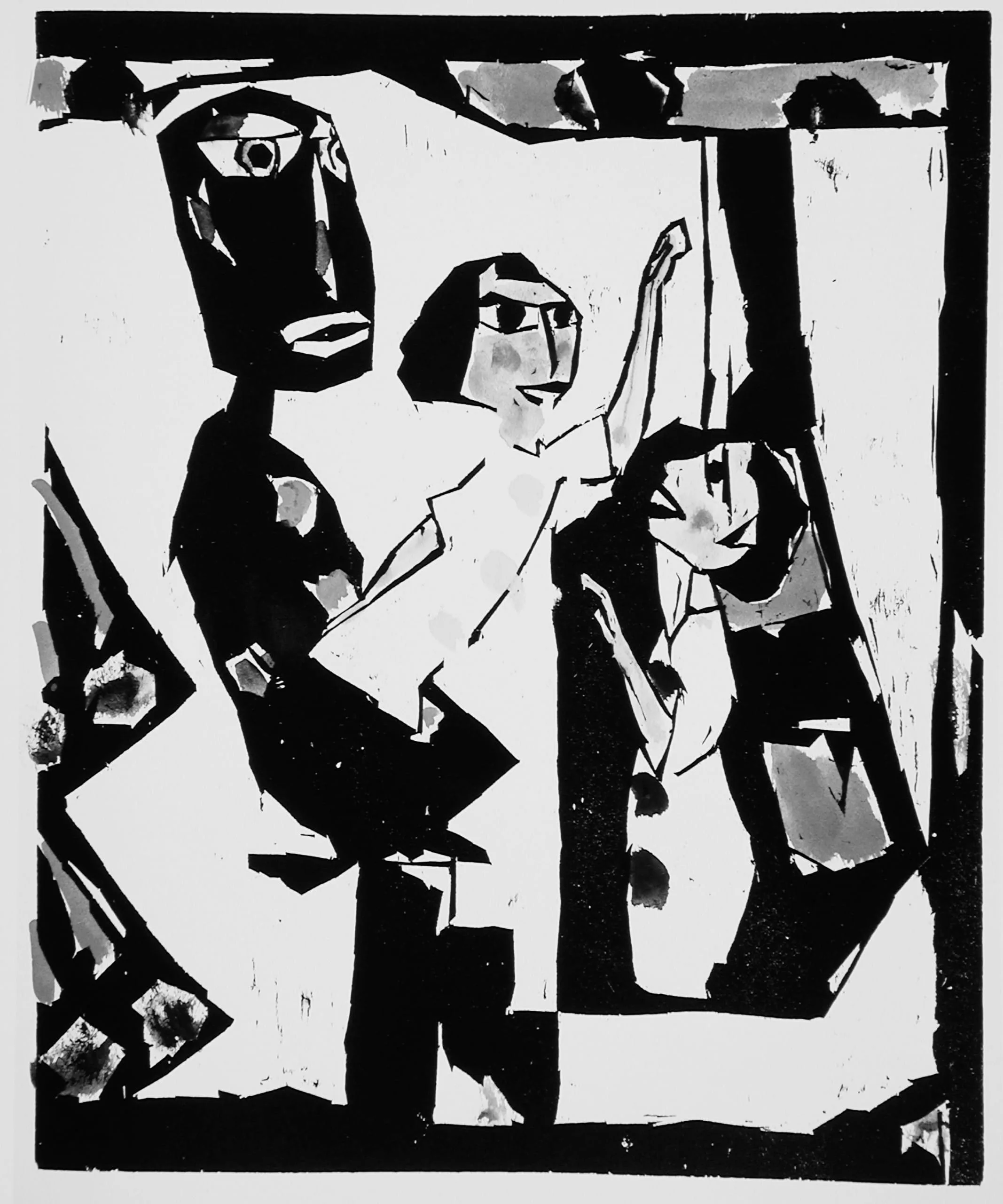 - Woodcut with vermillion, yellow, blue and red watercolor on wove paper