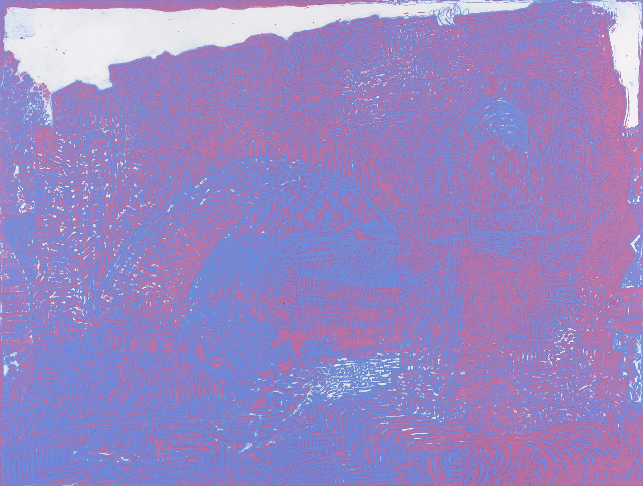 Horizontal abstract work in cornflower blue and raspberry pink-red, with dense all-over curving marks and soft irregular color zones, white areas at upper corners