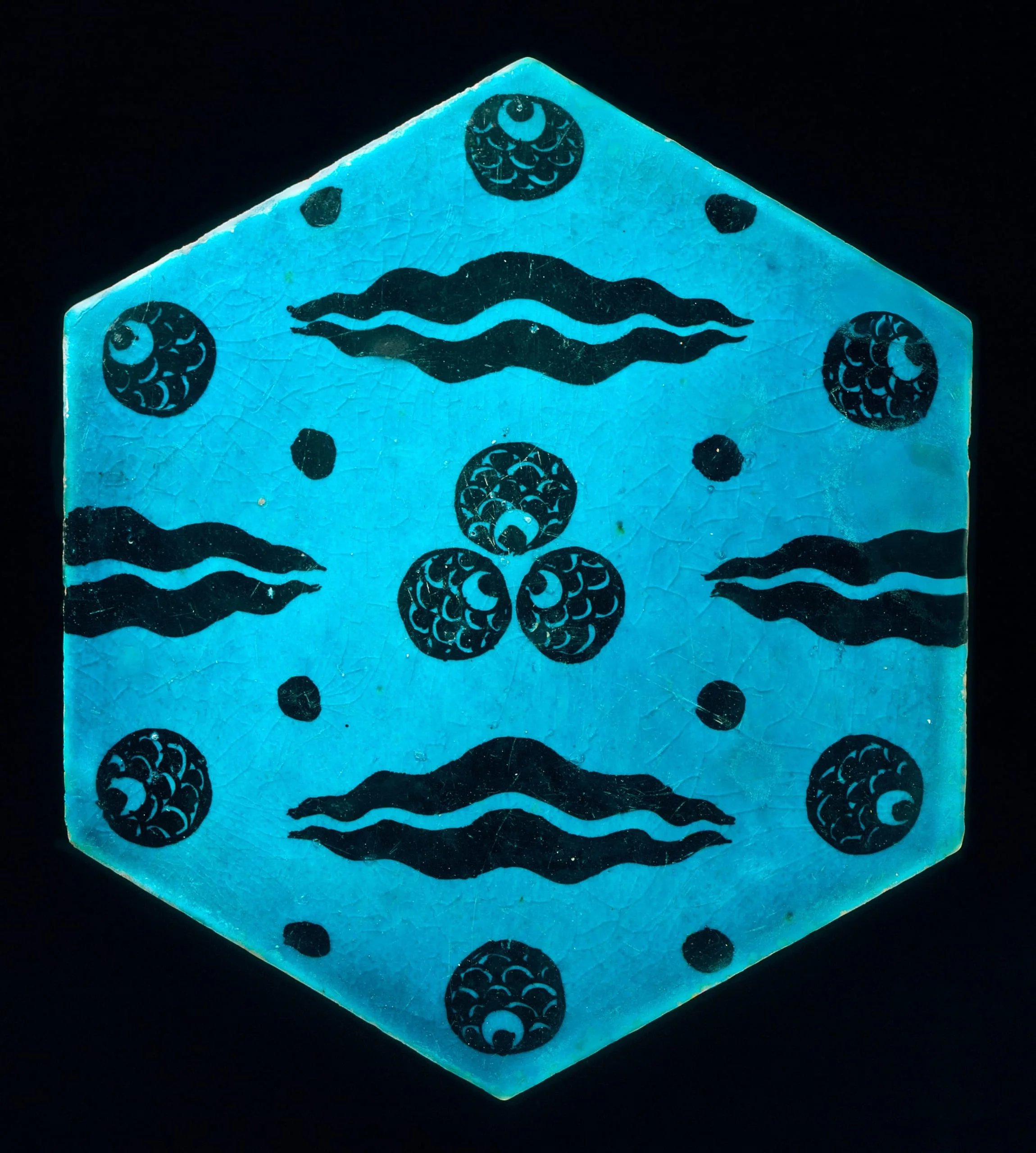 The motif of three circles combined with paired wavy lines (possibly a much abstracted version of leopard spots and tiger stripes) was repeated in a variety of Ottoman mediums, whether made for the court in Istanbul or produced in provincial centers such as Damascus. In this hexagonal tile, the Syrian artist has replicated the design but not the color scheme of red and blue on a white ground associated with classic Iznik ware. Instead the tile is boldly decorated in turquoise and black, a color combination that typifies Syrian tiles in the Ottoman period.