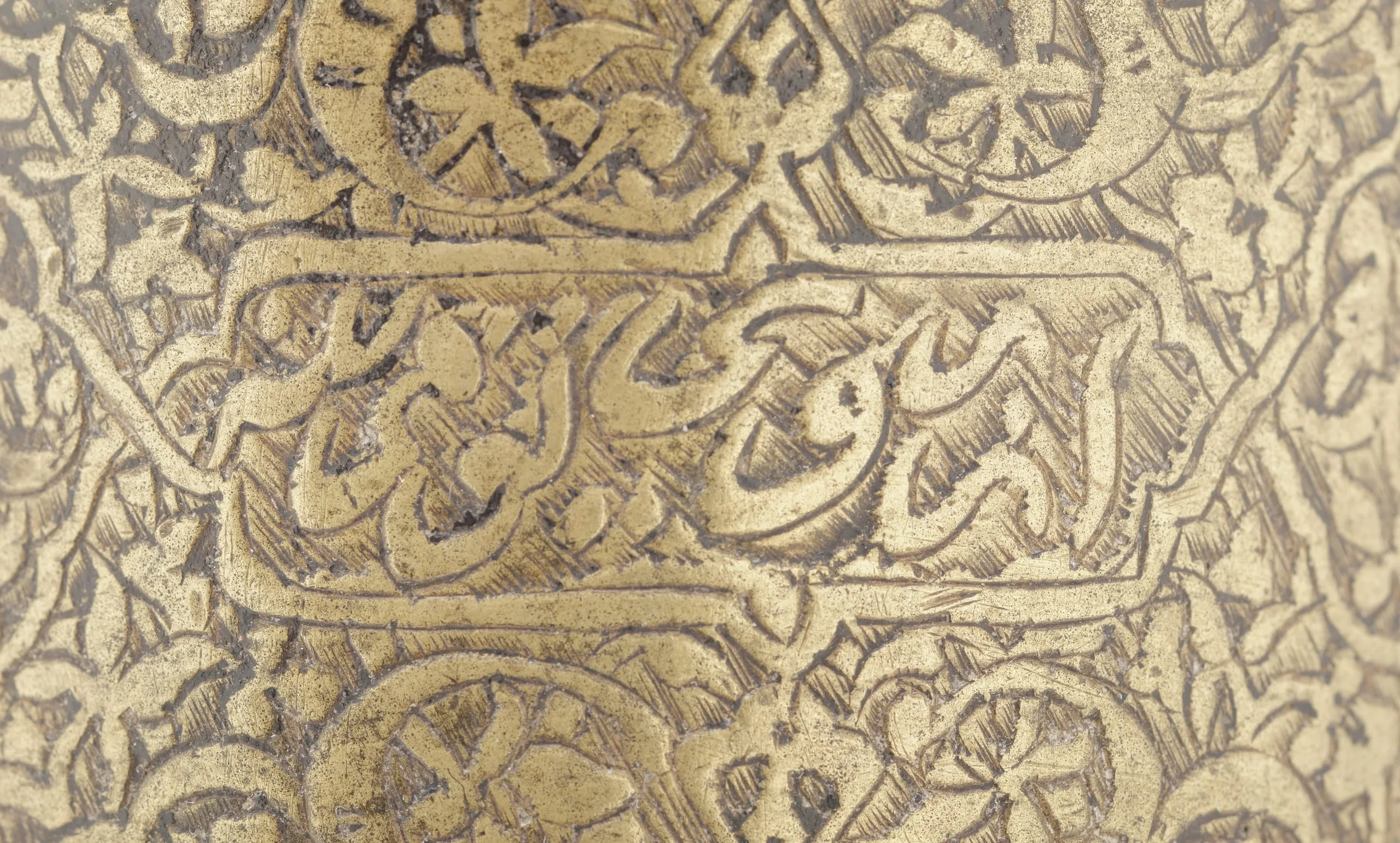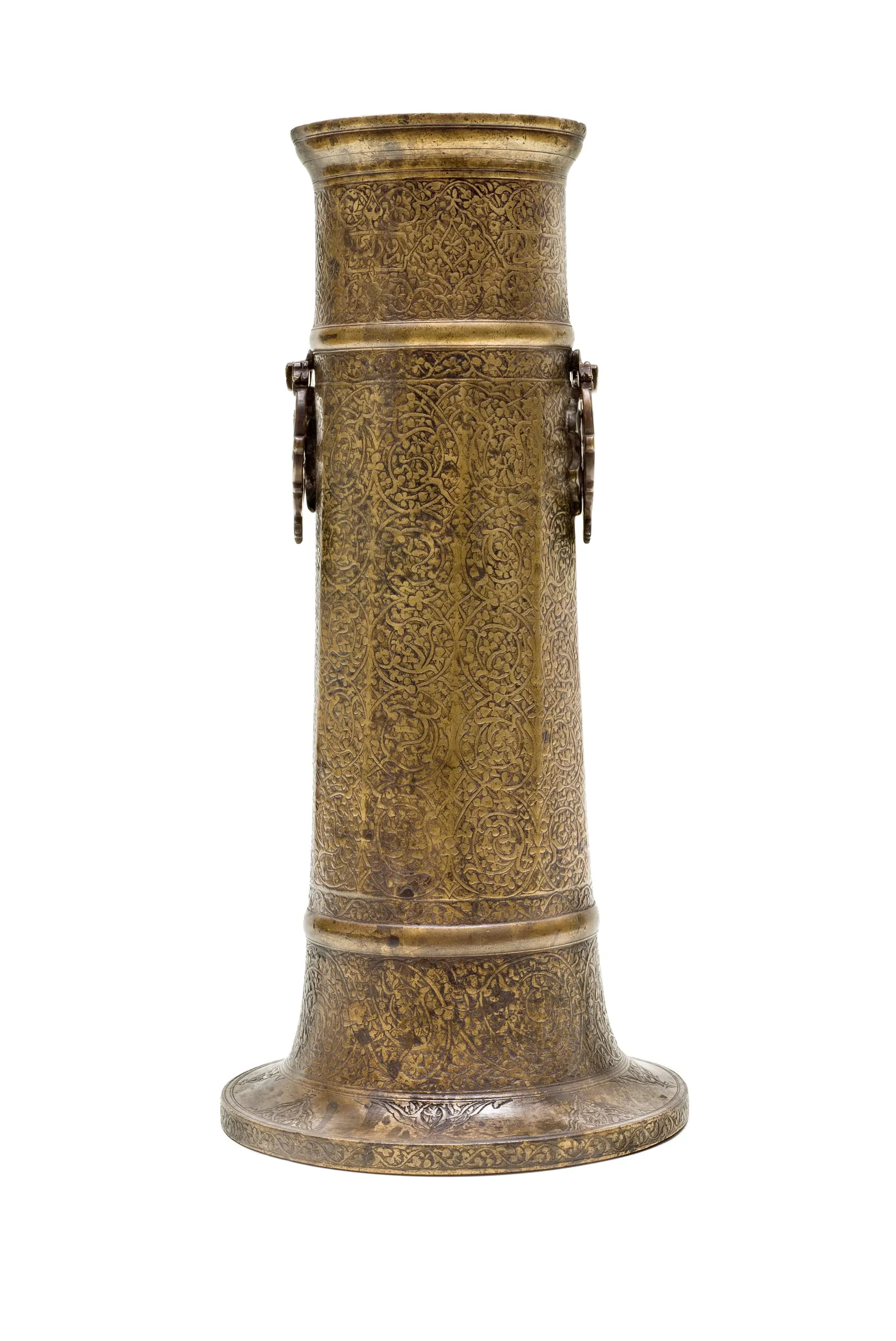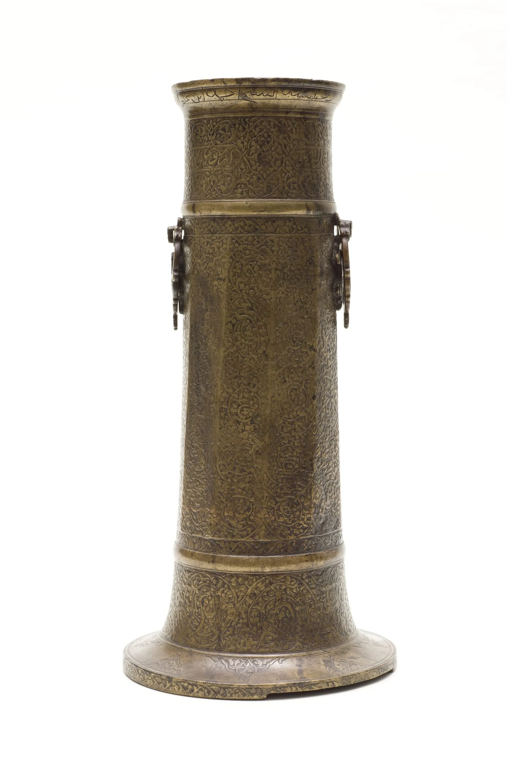 The tall lampstand, which once supported a smaller oil lamp, is one of several types of lighting devices in the Iranian world. This large and heavy columnar example is a quintessential metal form of the sixteenth and seventeenth centuries. Its surface is covered in floral and vegetal patterns, and the upper section includes verses of Persian poetry in cartouches. These verses concern illumination and include the word for lamp (chiragh), thereby perfectly complementing the object itself. This combination of functionality and literary sophistication was common for utilitarian objects produced in Iran.