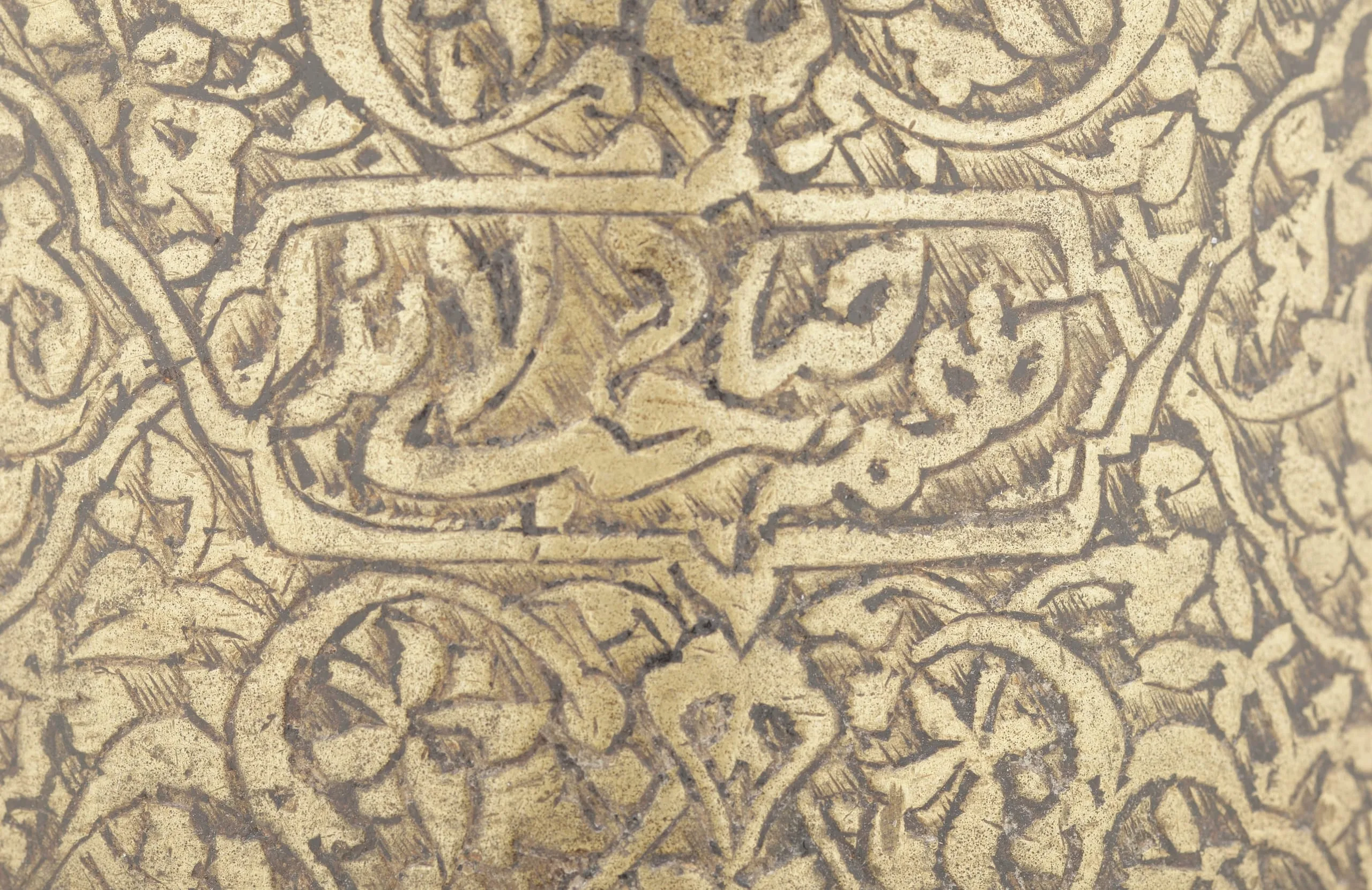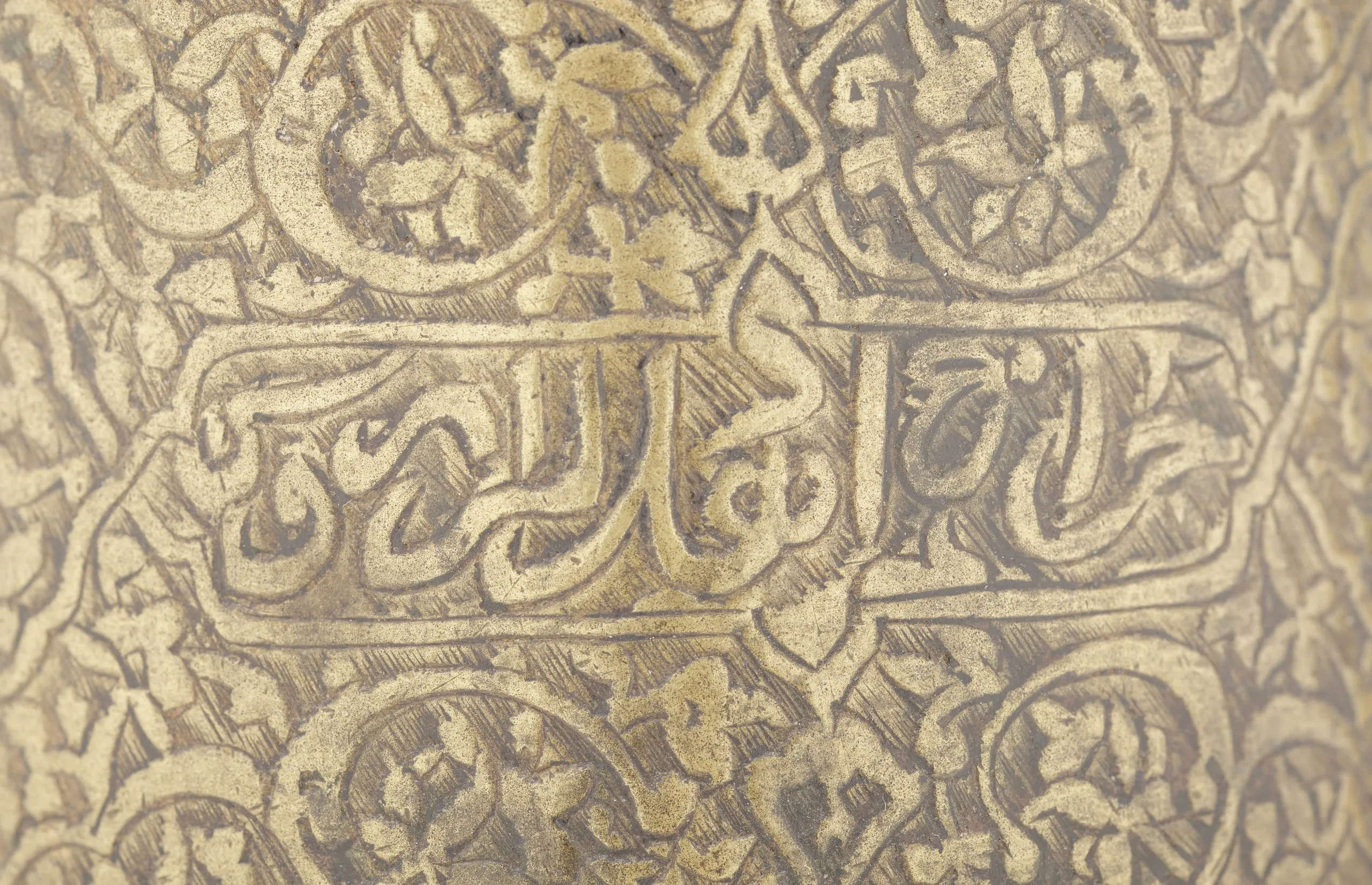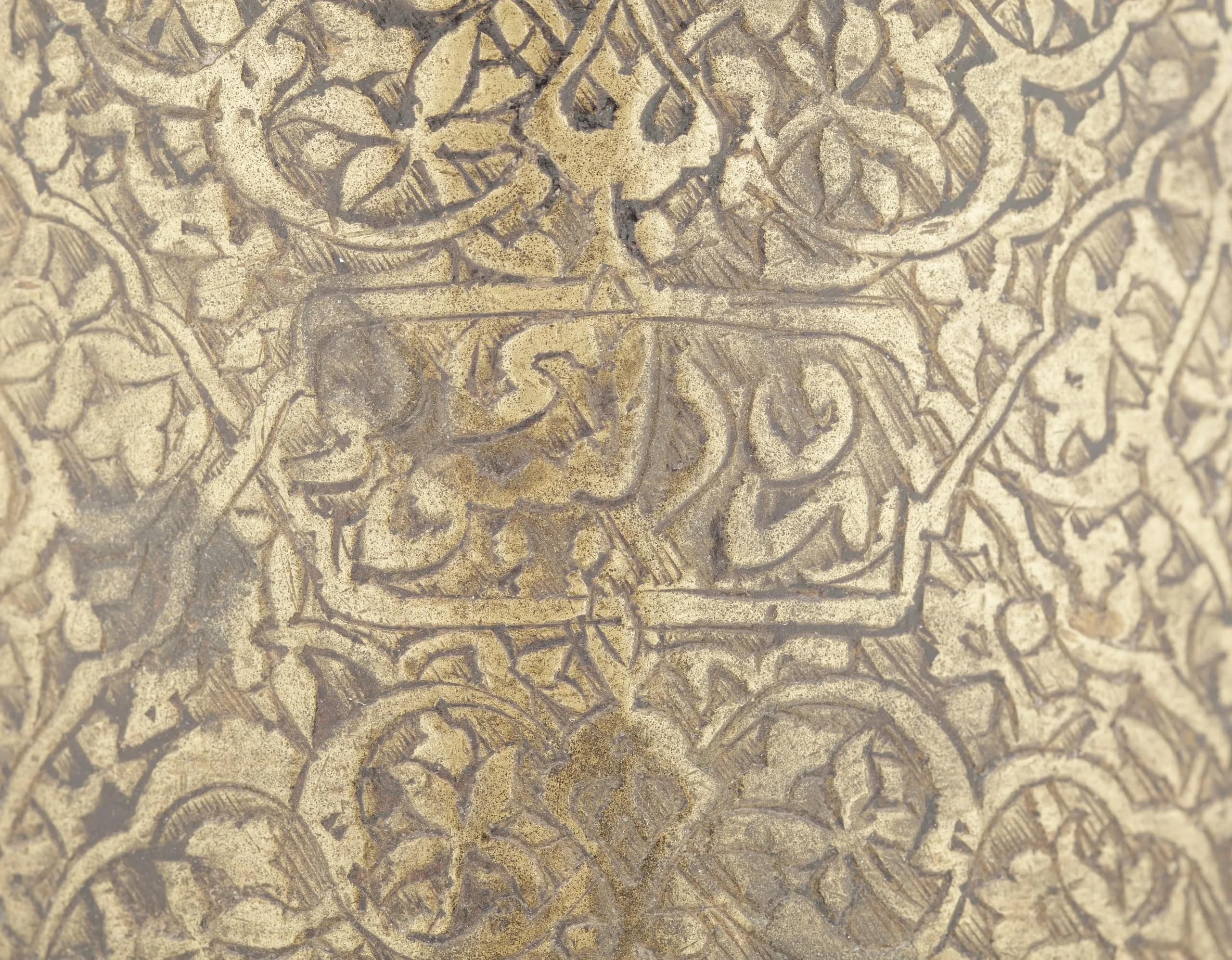 The tall lampstand, which once supported a smaller oil lamp, is one of several types of lighting devices in the Iranian world. This large and heavy columnar example is a quintessential metal form of the sixteenth and seventeenth centuries. Its surface is covered in floral and vegetal patterns, and the upper section includes verses of Persian poetry in cartouches. These verses concern illumination and include the word for lamp (chiragh), thereby perfectly complementing the object itself. This combination of functionality and literary sophistication was common for utilitarian objects produced in Iran.
