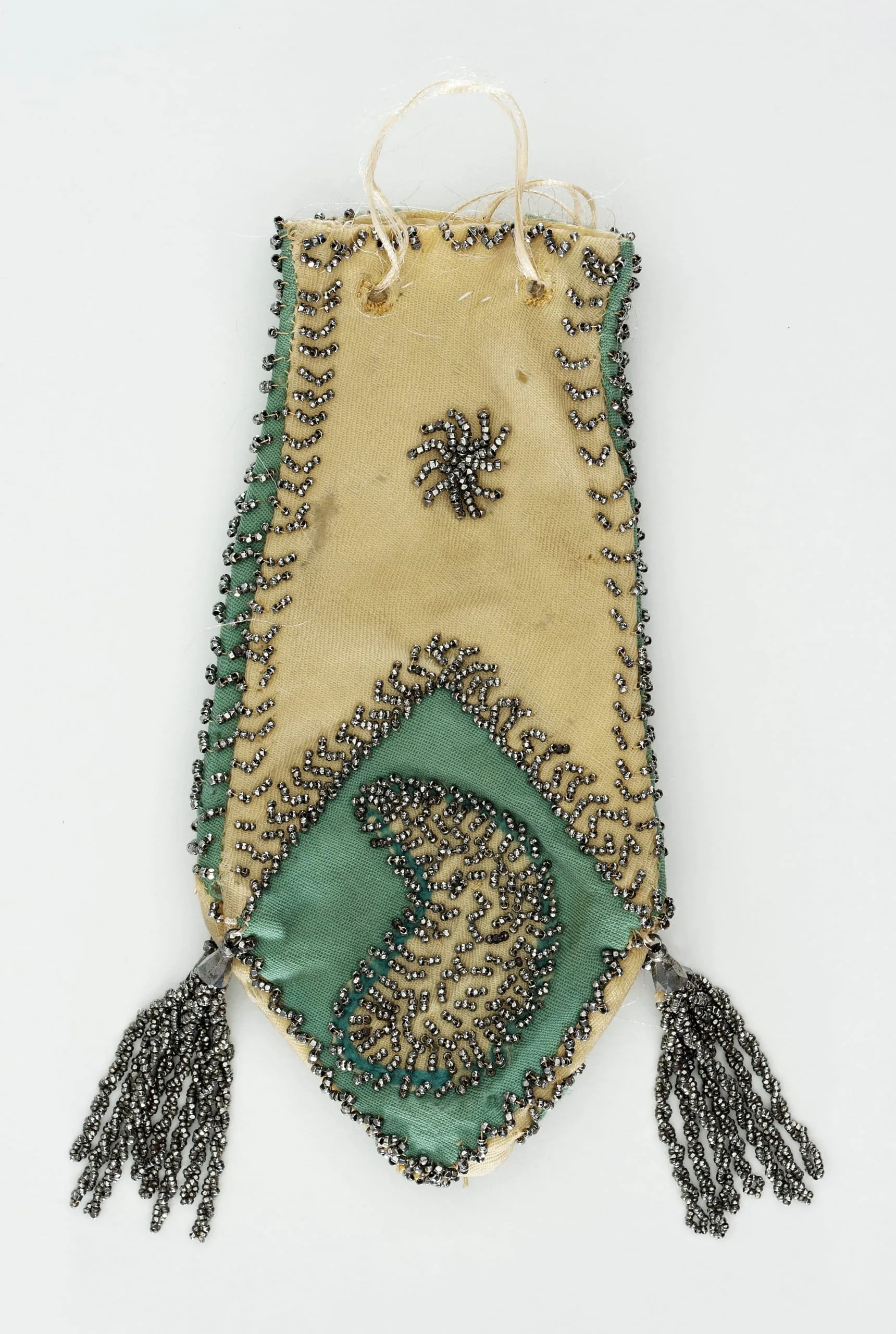 Small beaded pouch of cream fabric with teal satin trim, covered in dense gunmetal bead scrollwork and a beaded oval panel, with bead fringe tassels at the pointed lower tip
