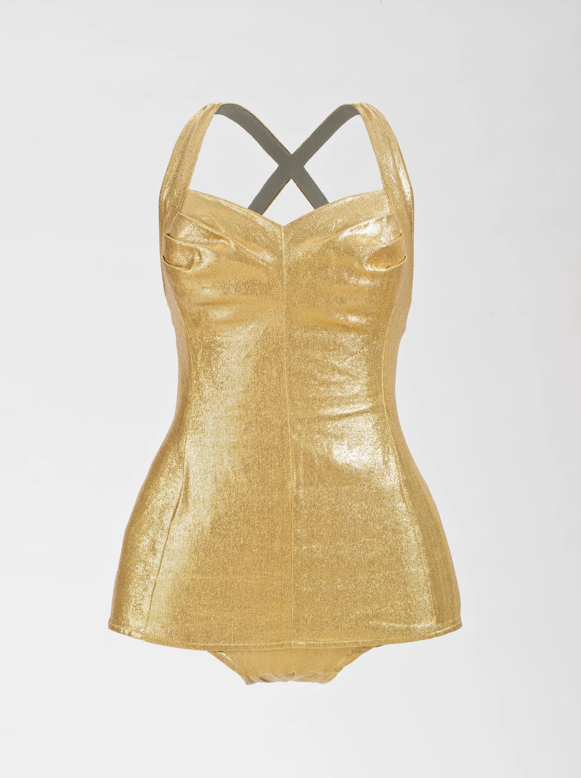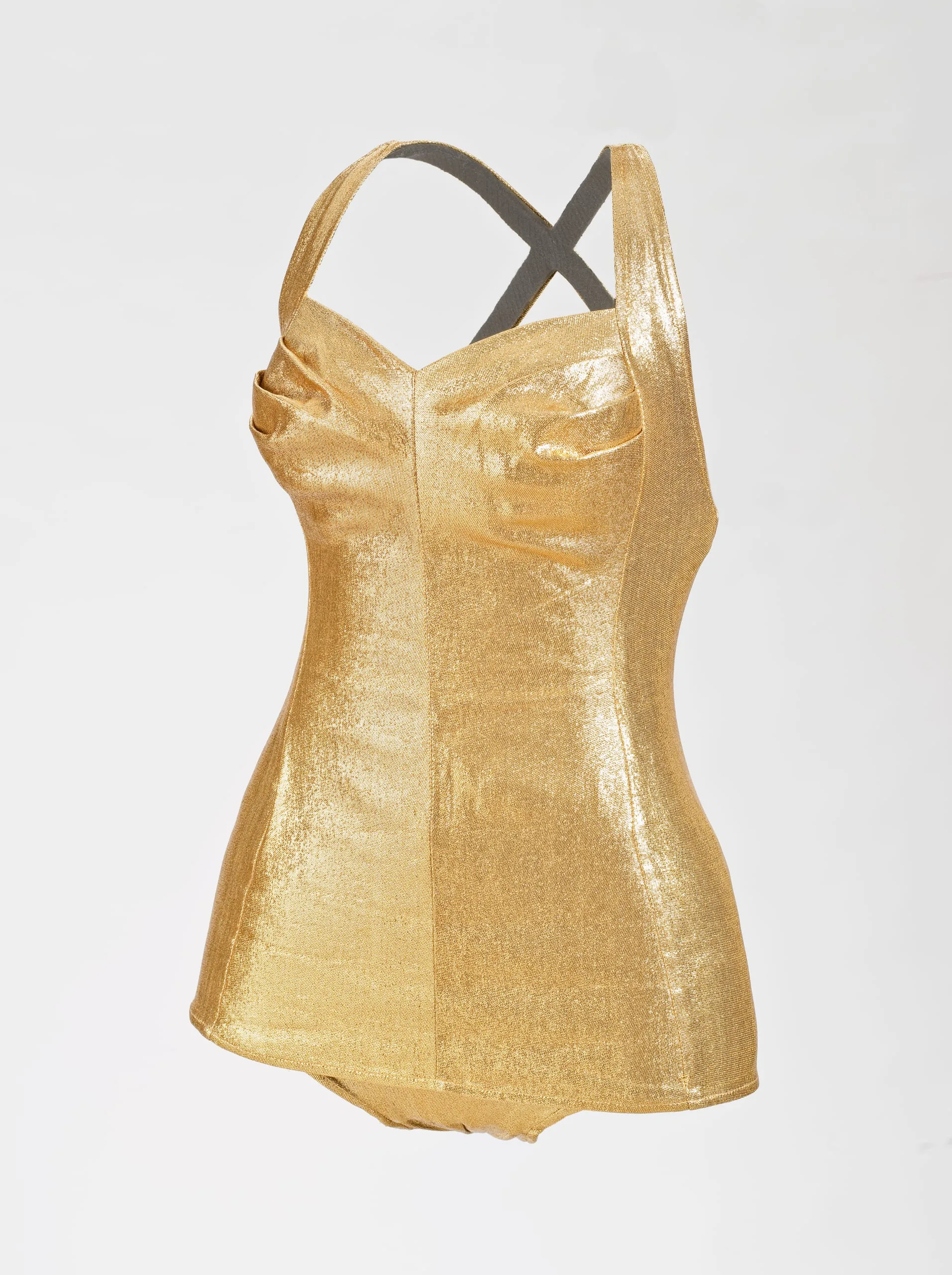 Hollywood glamour was distilled, translated, and transmitted in swimsuits such as this glittering lamé example, which was probably made as a promotion for Million Dollar Mermaid, starring cinema’s aquatic icon Esther Williams. Mutually beneficial relationships between movie stars and swimwear companies such as Cole of California and Catalina (the latter sponsored the Miss America pageants) emerged in the late 1920s and were instrumental in perpetuating the world’s perception of Hollywood as the epicenter of fame, sex, and stupendous wealth.