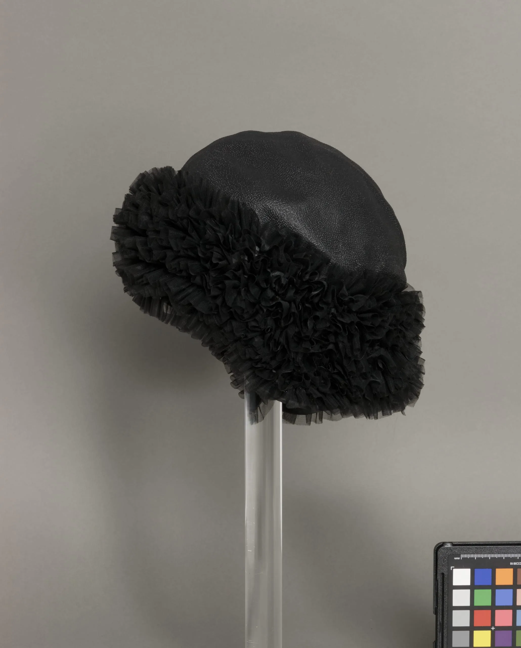 Black hat with smooth pebbled crown and wide ruffled tulle brim, displayed on a clear acrylic stand against a gray background