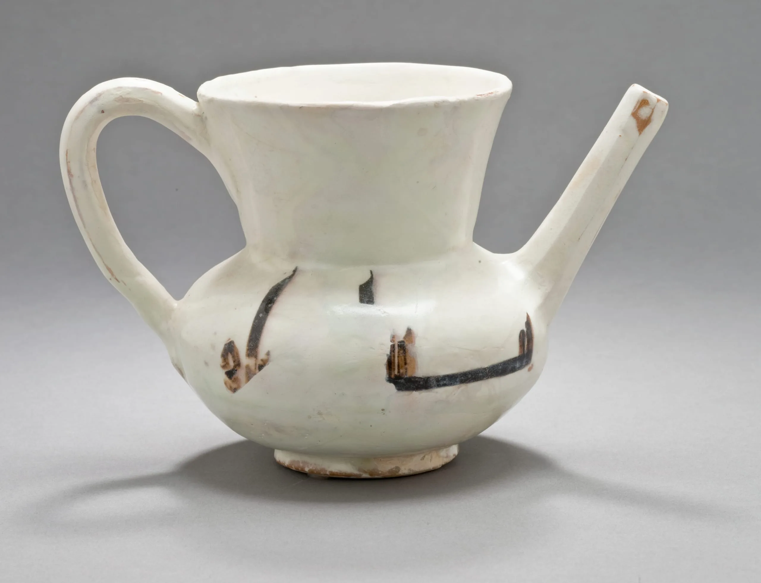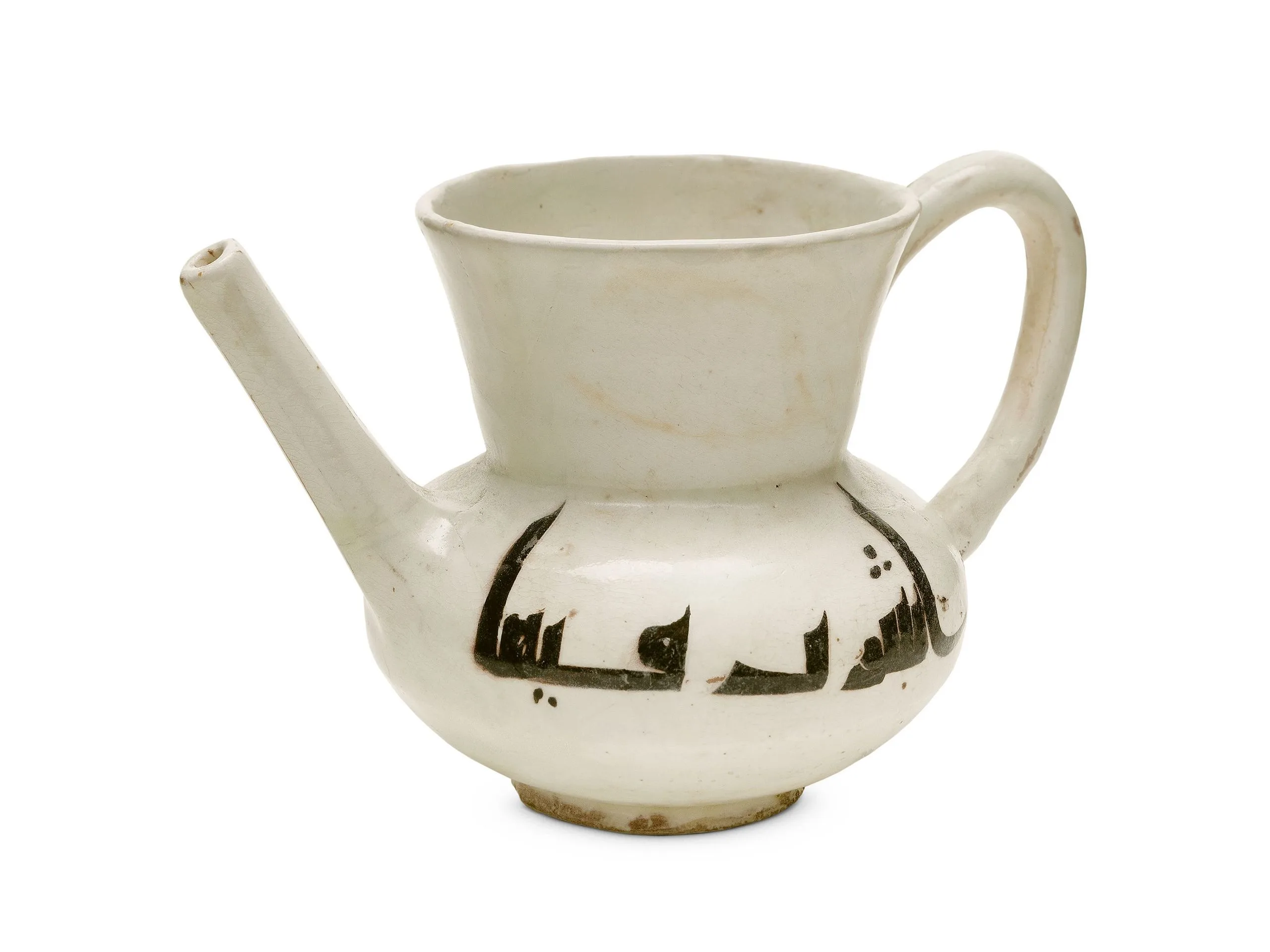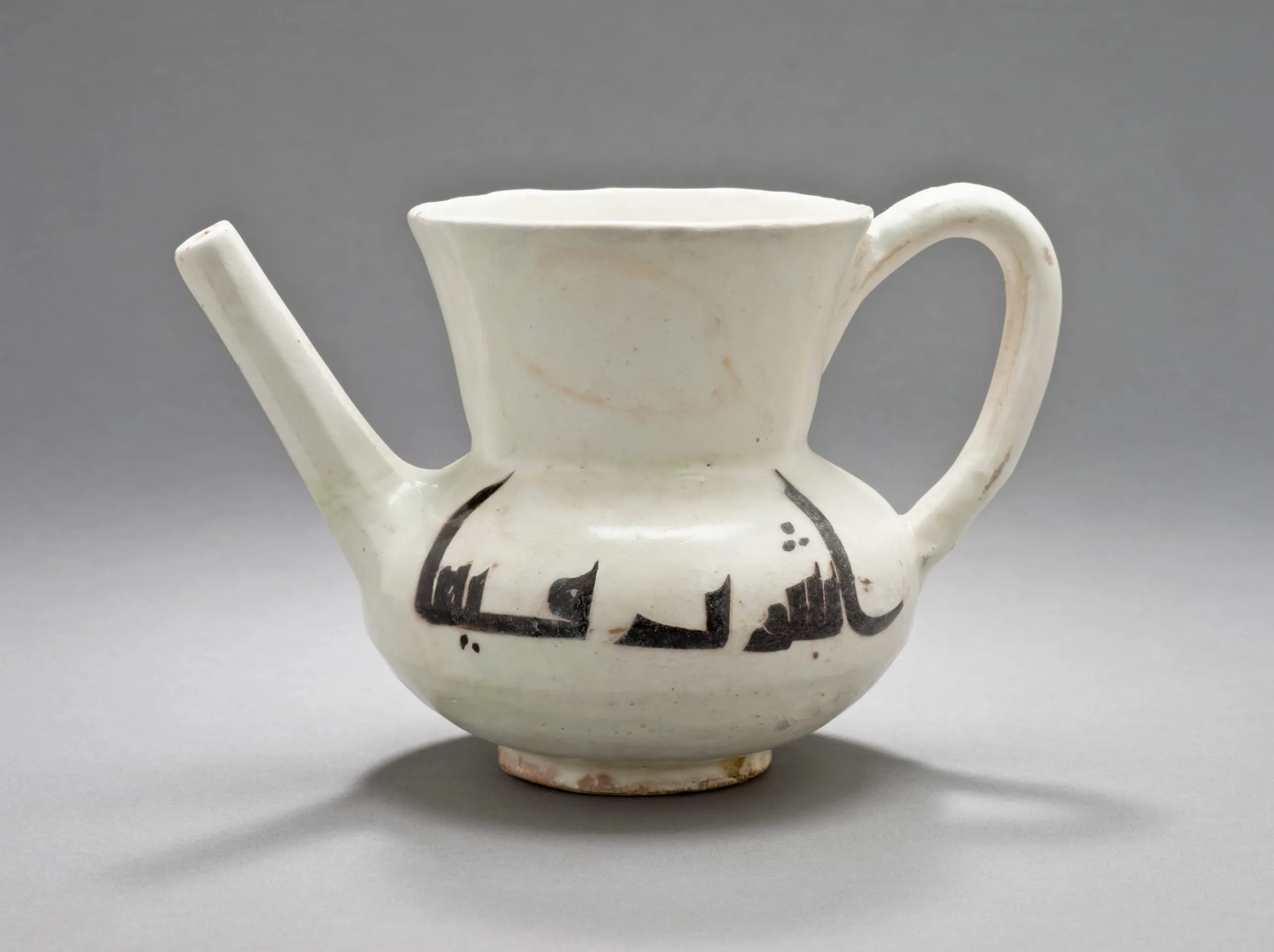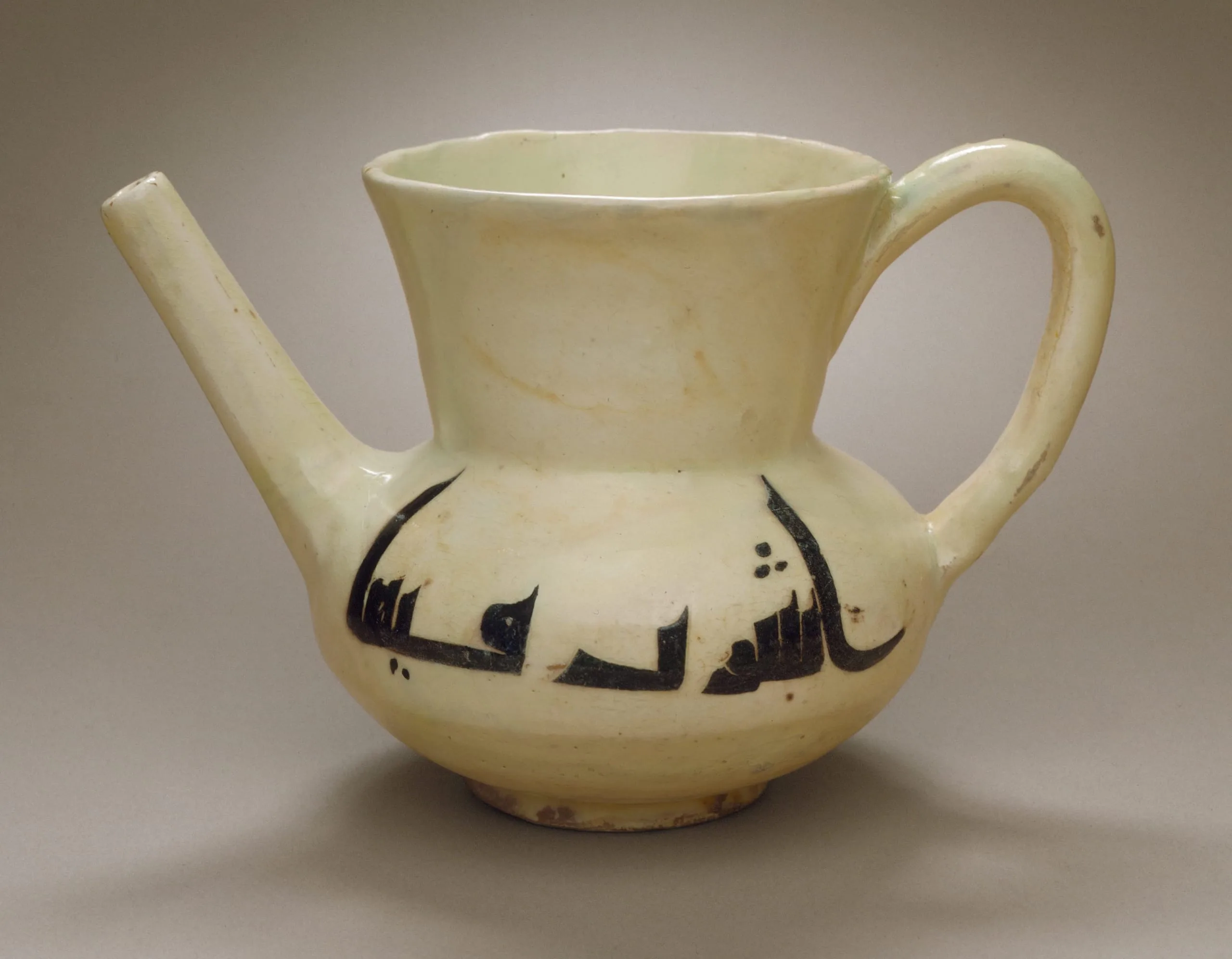Although we do not know what kind of liquid this vessel once held, we do know that it was meant for pouring but not into a cup. Rather the liquid would be poured directly into the user’s mouth without touching the lips to the spout. Arabic inscriptions on either side help establish its function and may even remind us of something in our own homes. It says: "Drink from it / Cheers" (or "To your health").