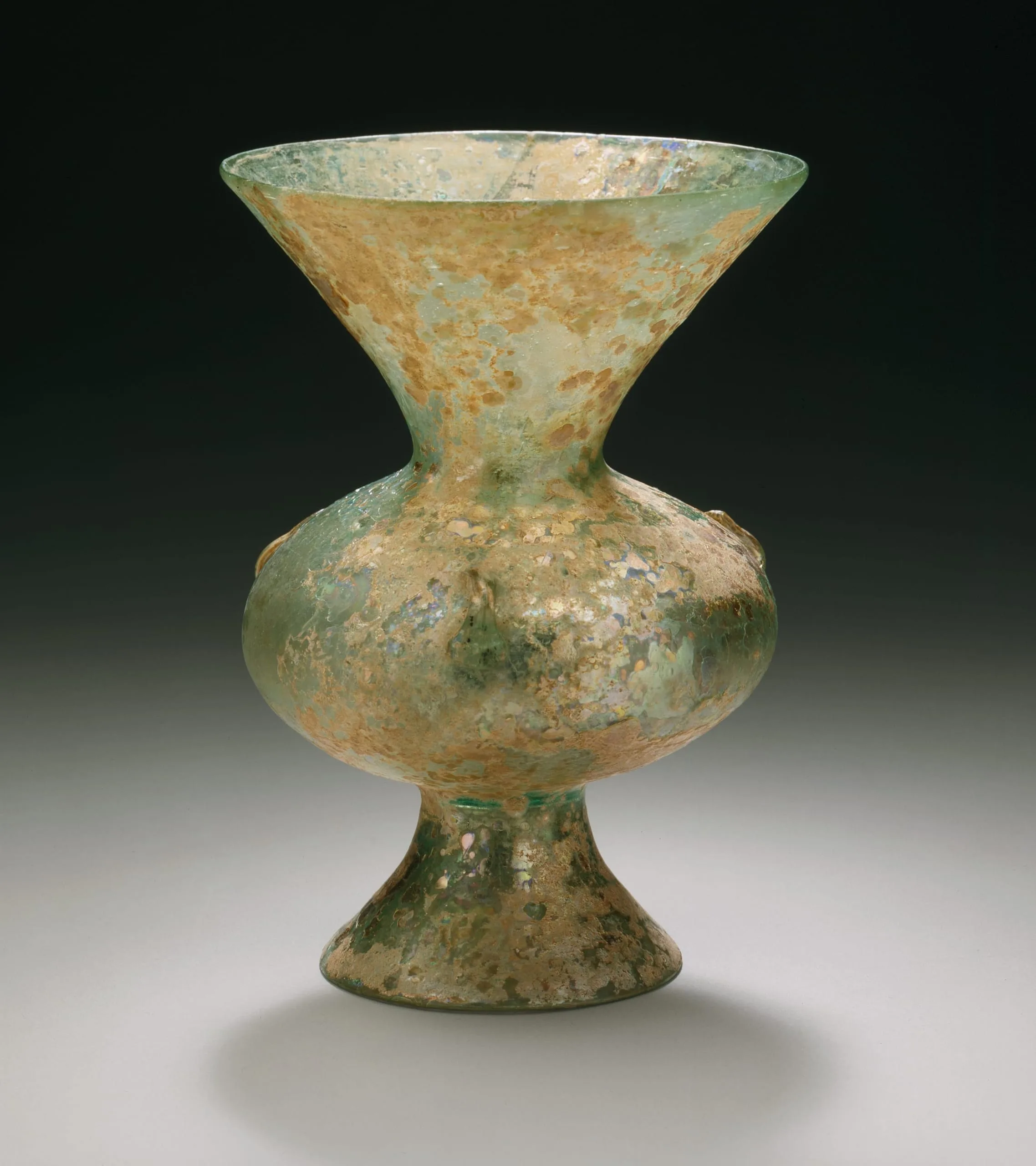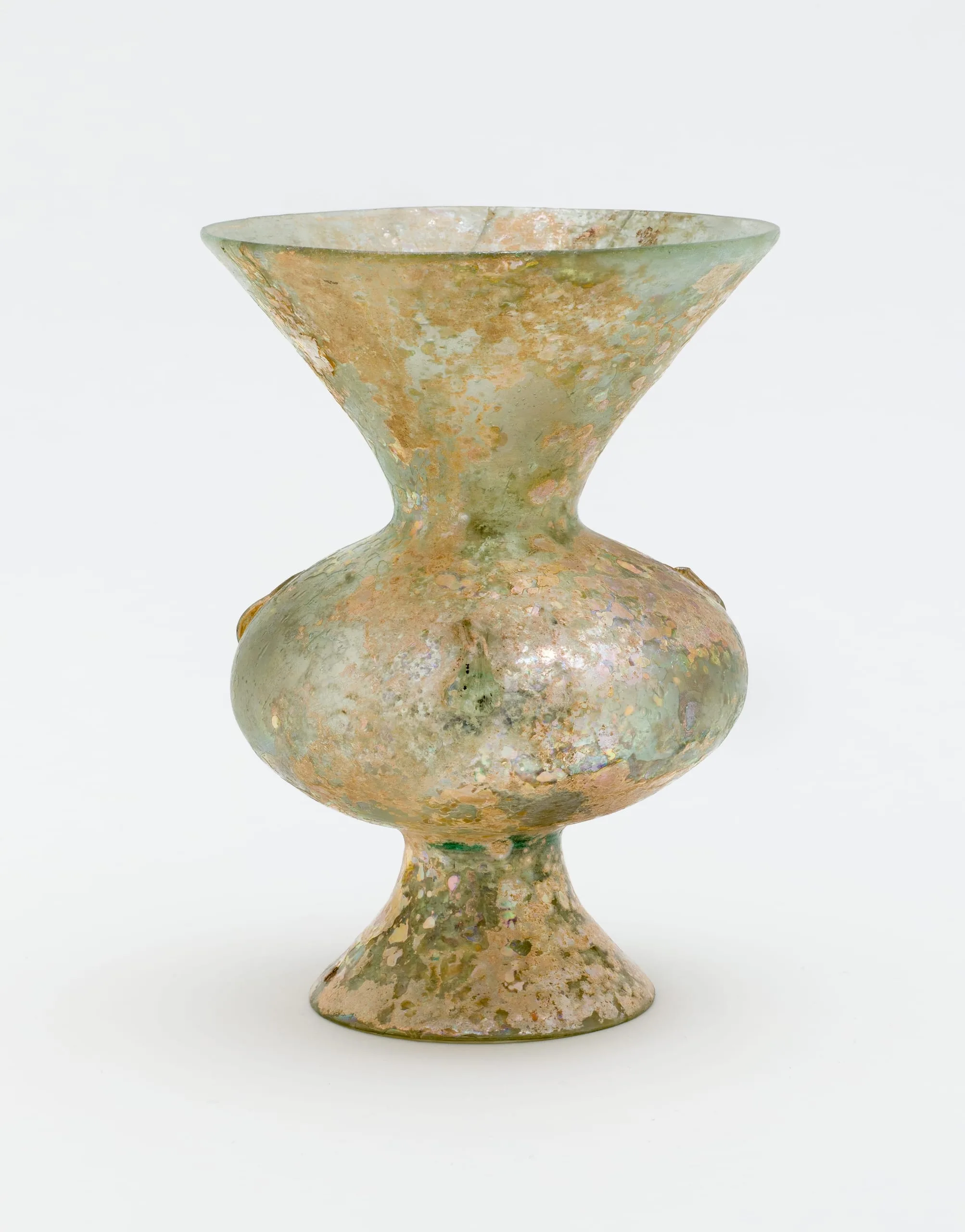 Lighting is an essential requirement of daily life in all times and places. In the early and medieval Islamic periods, glass lamps were used to illuminate small private spaces or, if grouped together, a larger public space such as a mosque. Likely intended for personal use, this lamp, with its bulbous body and flaring neck, has a distinctive shape that continued in later Islamic times and was especially popular for so-called mosque lamps from fourteenth-century Egypt, where they were enlarged and embellished with gilding and enameling, and suspended from the ceiling (see