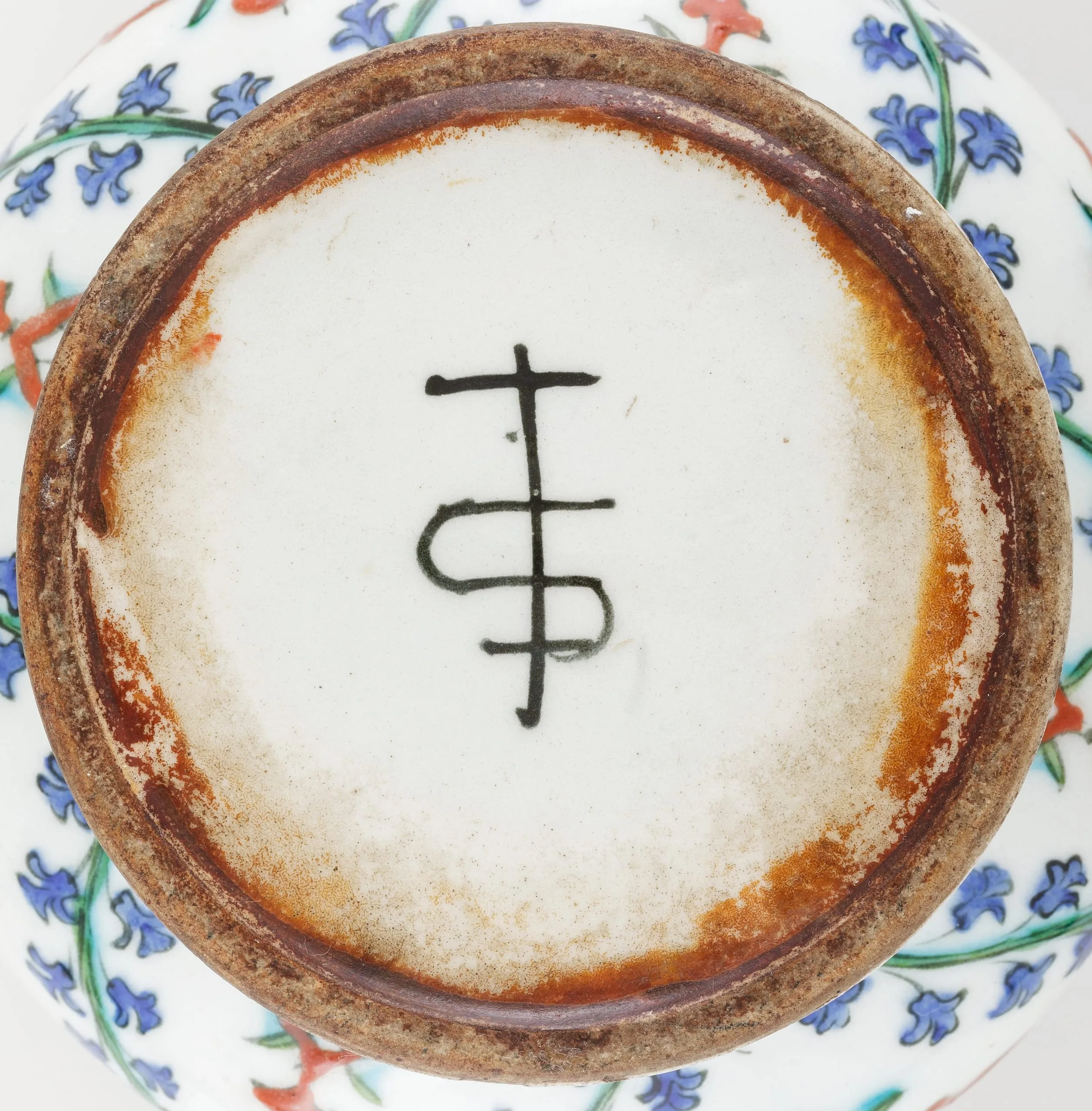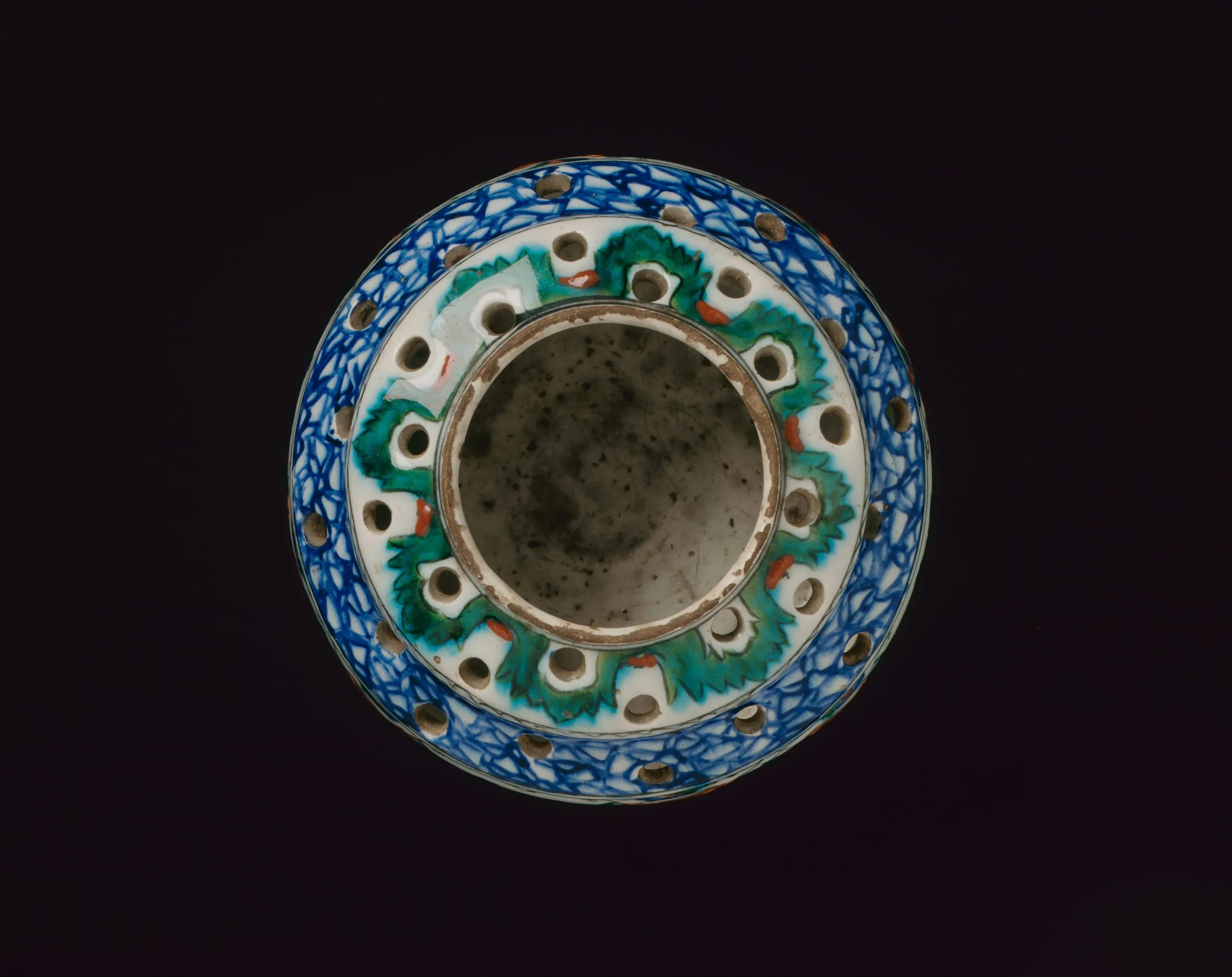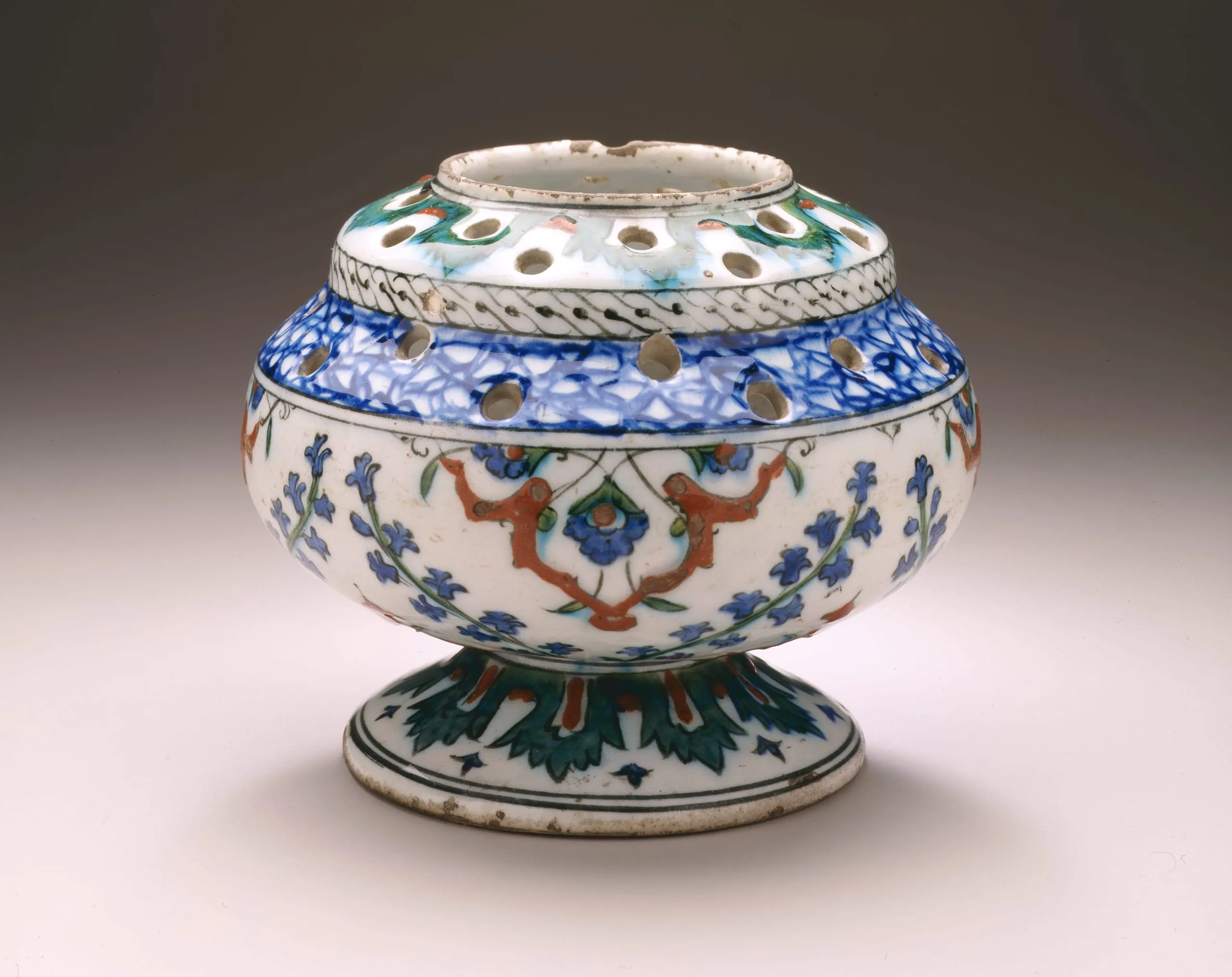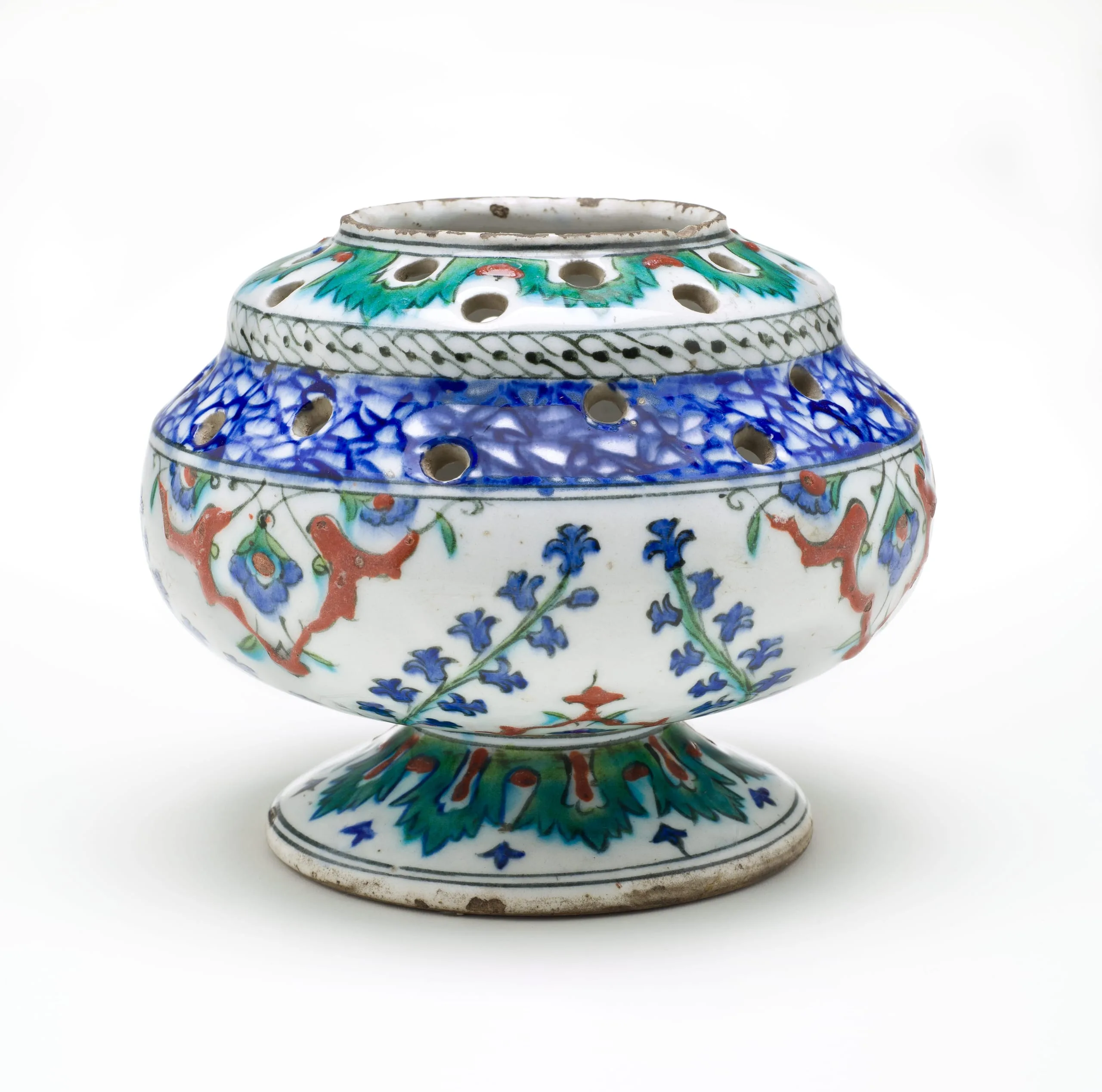 Iznik pottery, one of the most renowned and influential arts of the Ottoman period, began to be commissioned for the European market by the 1570s. Table service could include European coats of arms, while there is a group of pierced flower vases, each of which bears a distinctive black insignia on its base in the form of a long-stemmed cross intersected by the capital letter "S." Similar marks occur on maiolica apothecary jars, suggesting that the flowerpots were perhaps made for an Italian customer; more specifically, this device has been related to the SP monogram of Stefano and Piero di Filippo, who had a maiolica factory at Cafaggiolo.