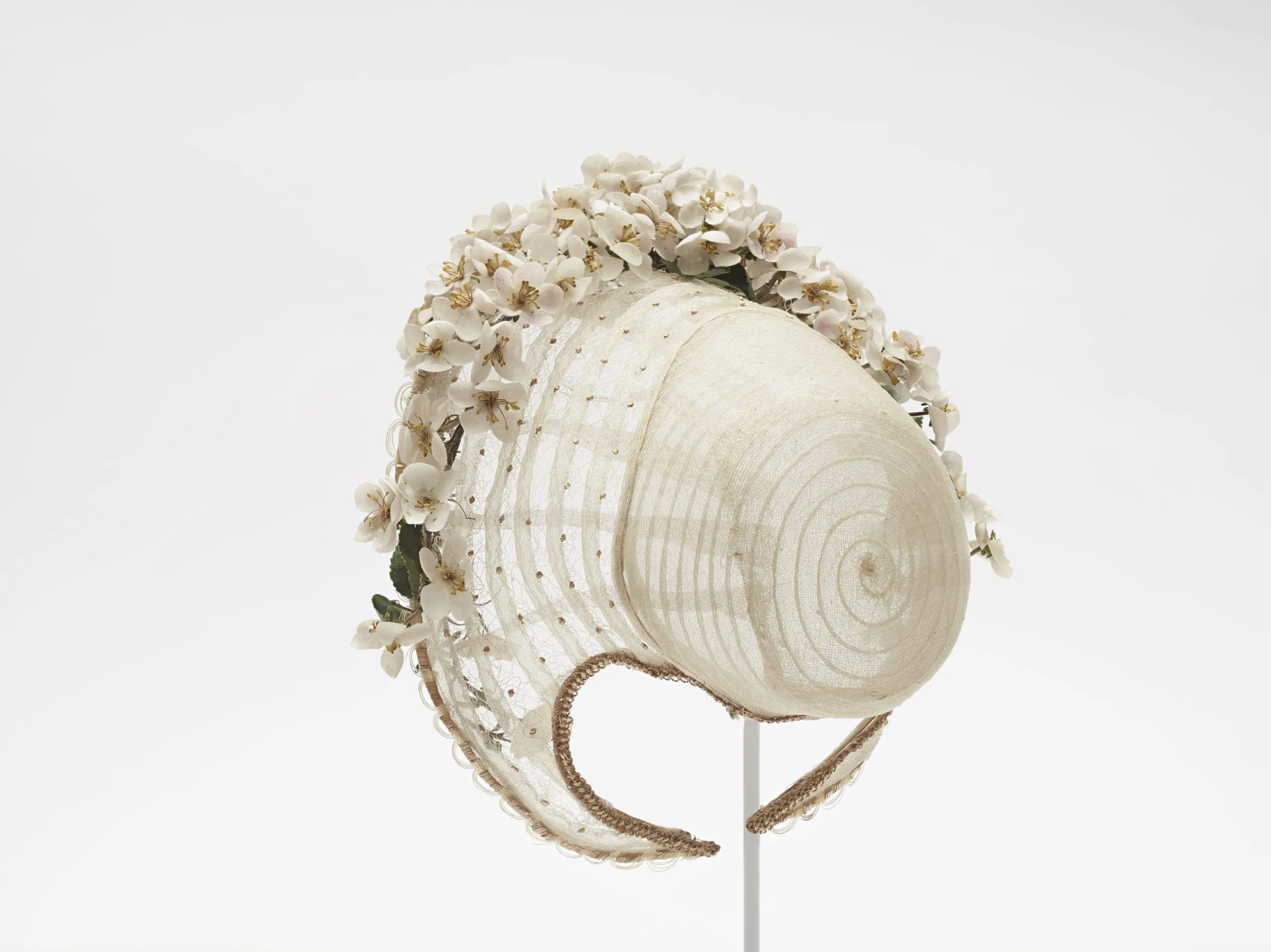 - Horsehair, plaited, and cotton plain weave with silk and cotton plain weave flowers and straw passementerie