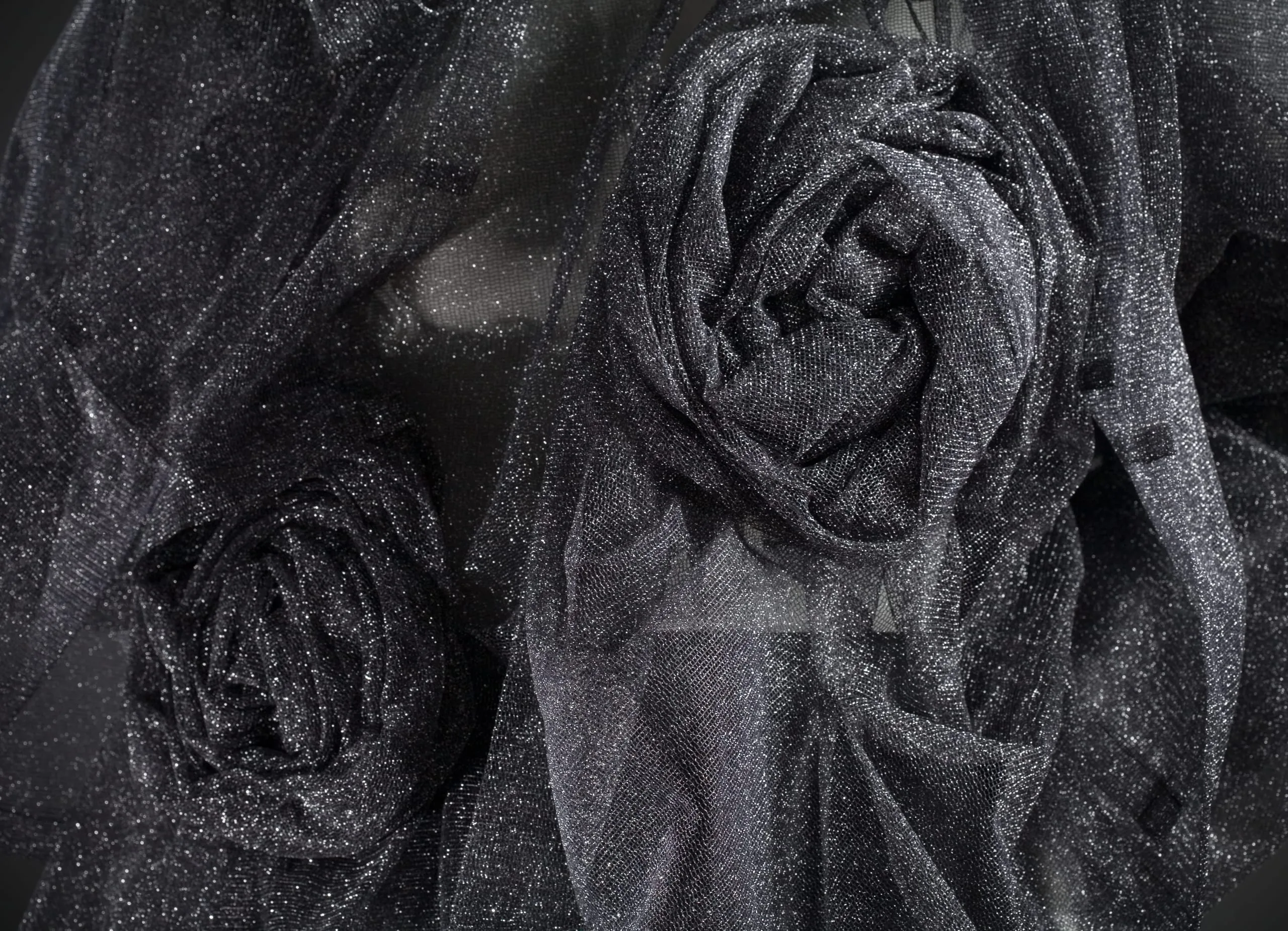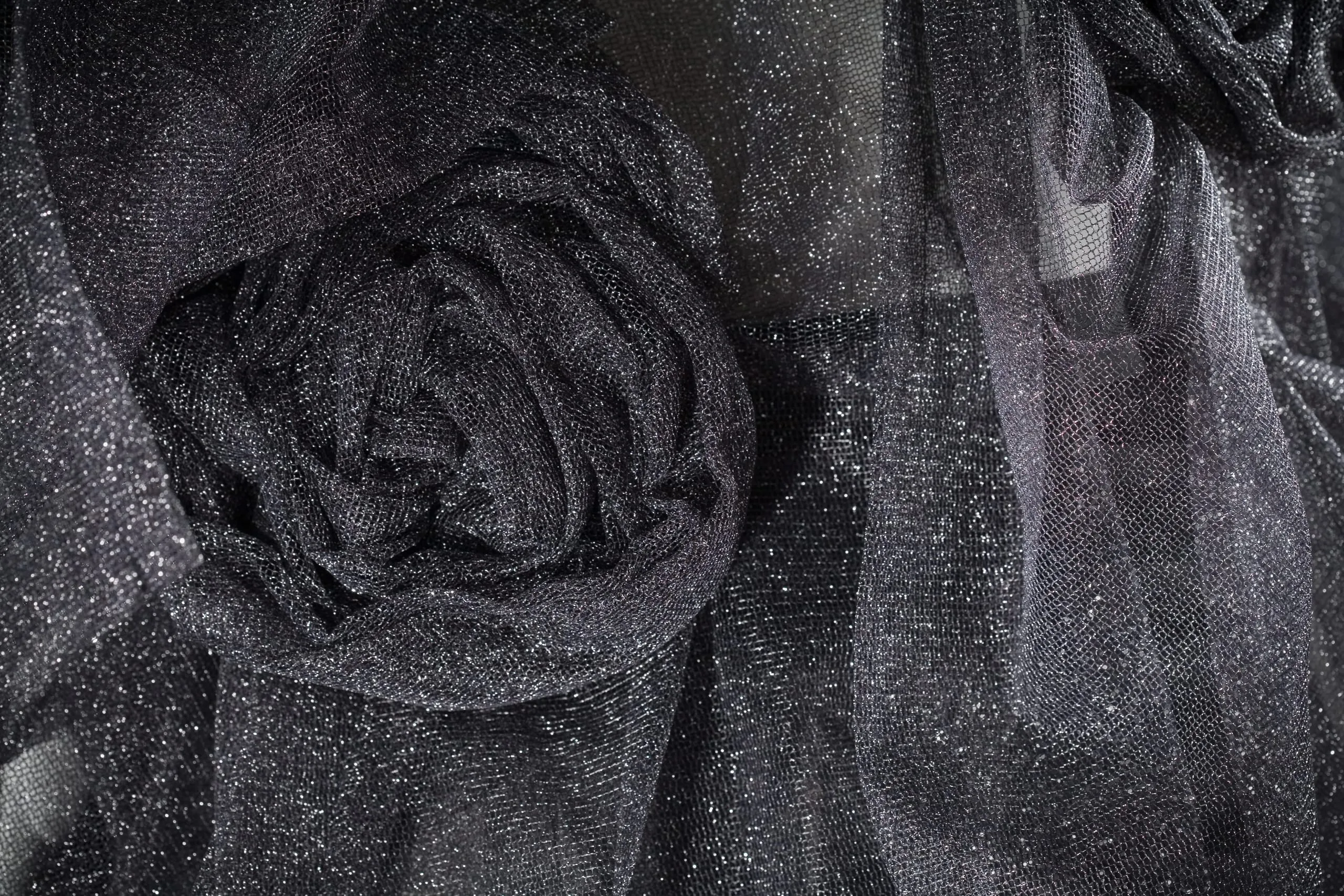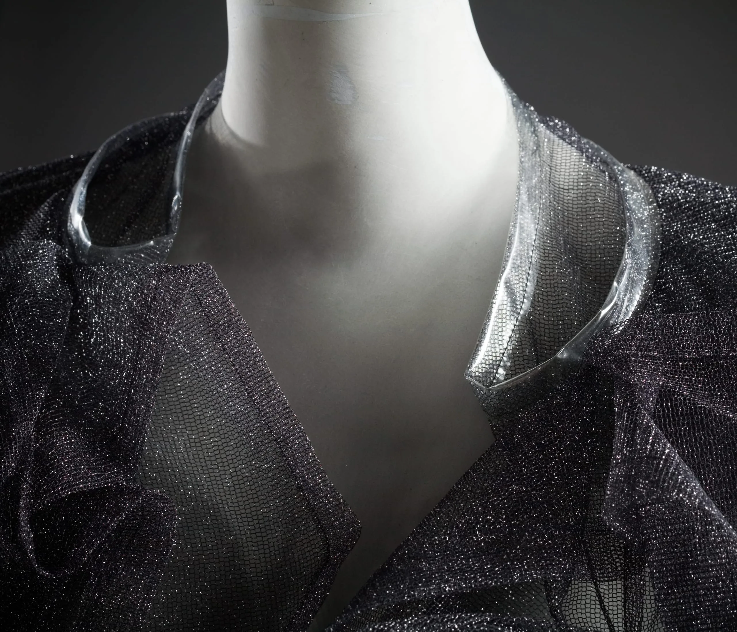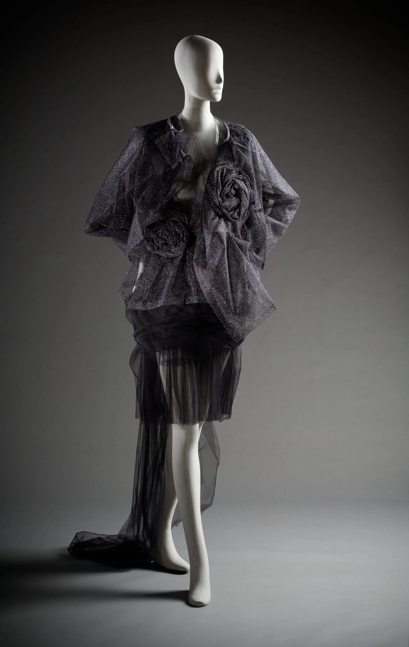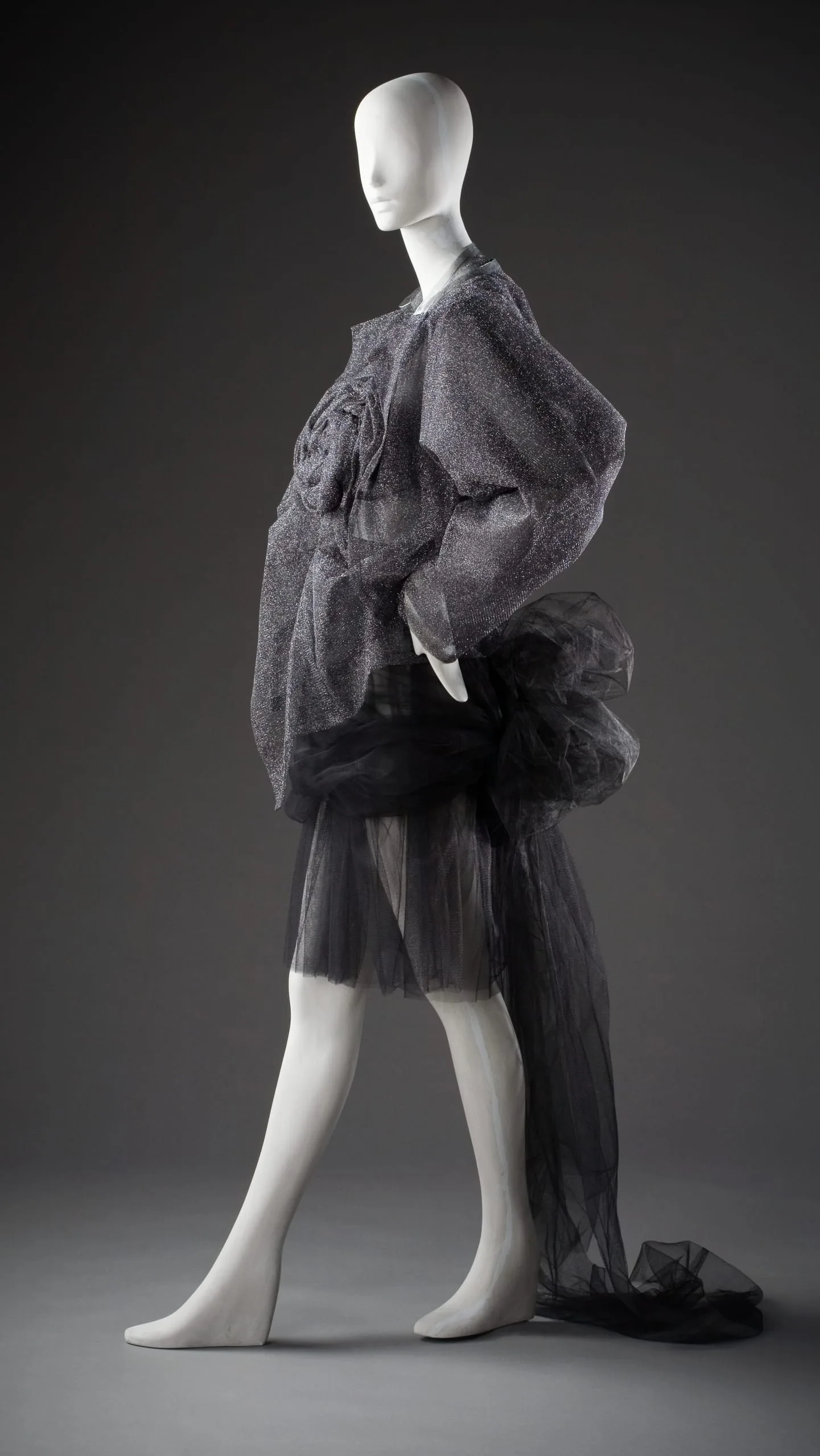- Jacket: nylon/metallic net, PVC trim; Skirt: nylon net, elastic