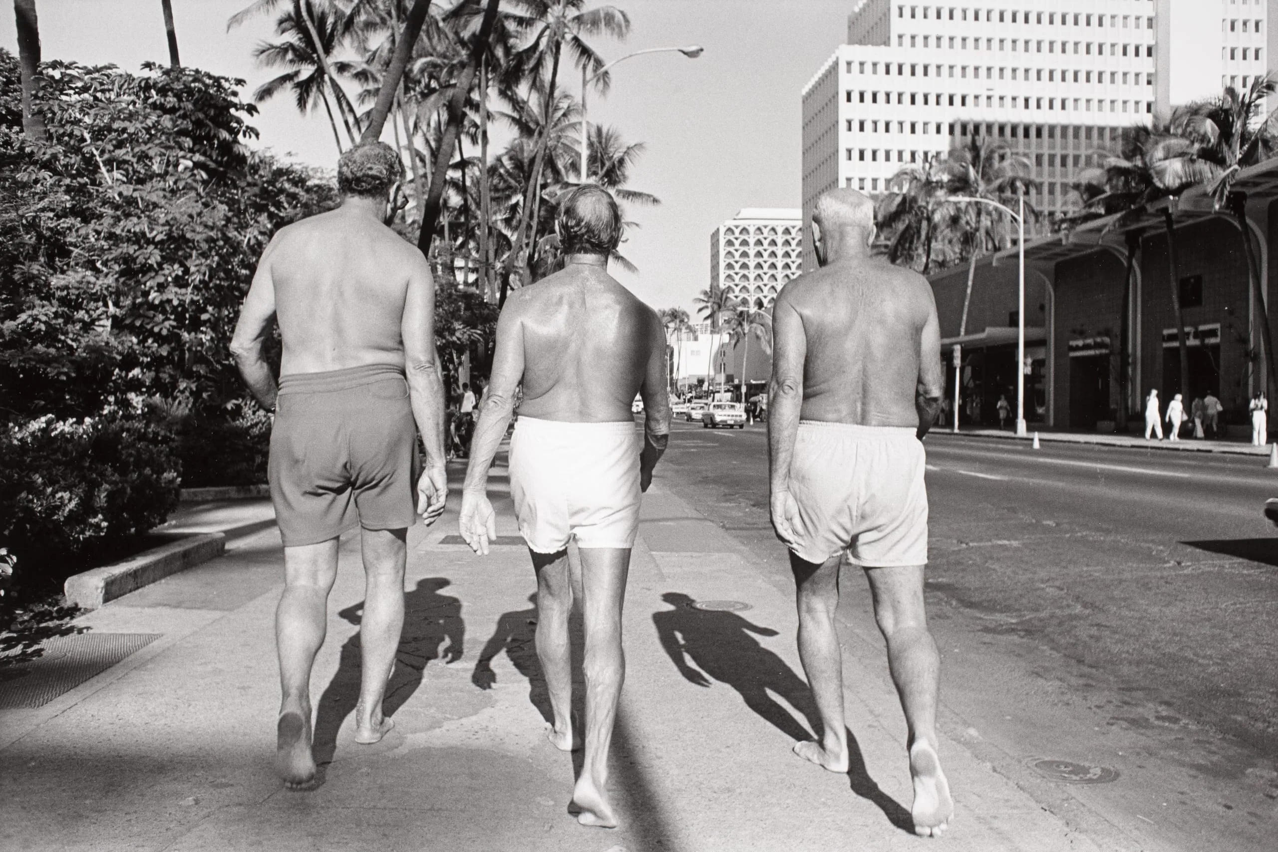 Black and white photograph of three shirtless, barefoot older men walking away from camera along a sunny urban sidewalk lined with palm trees