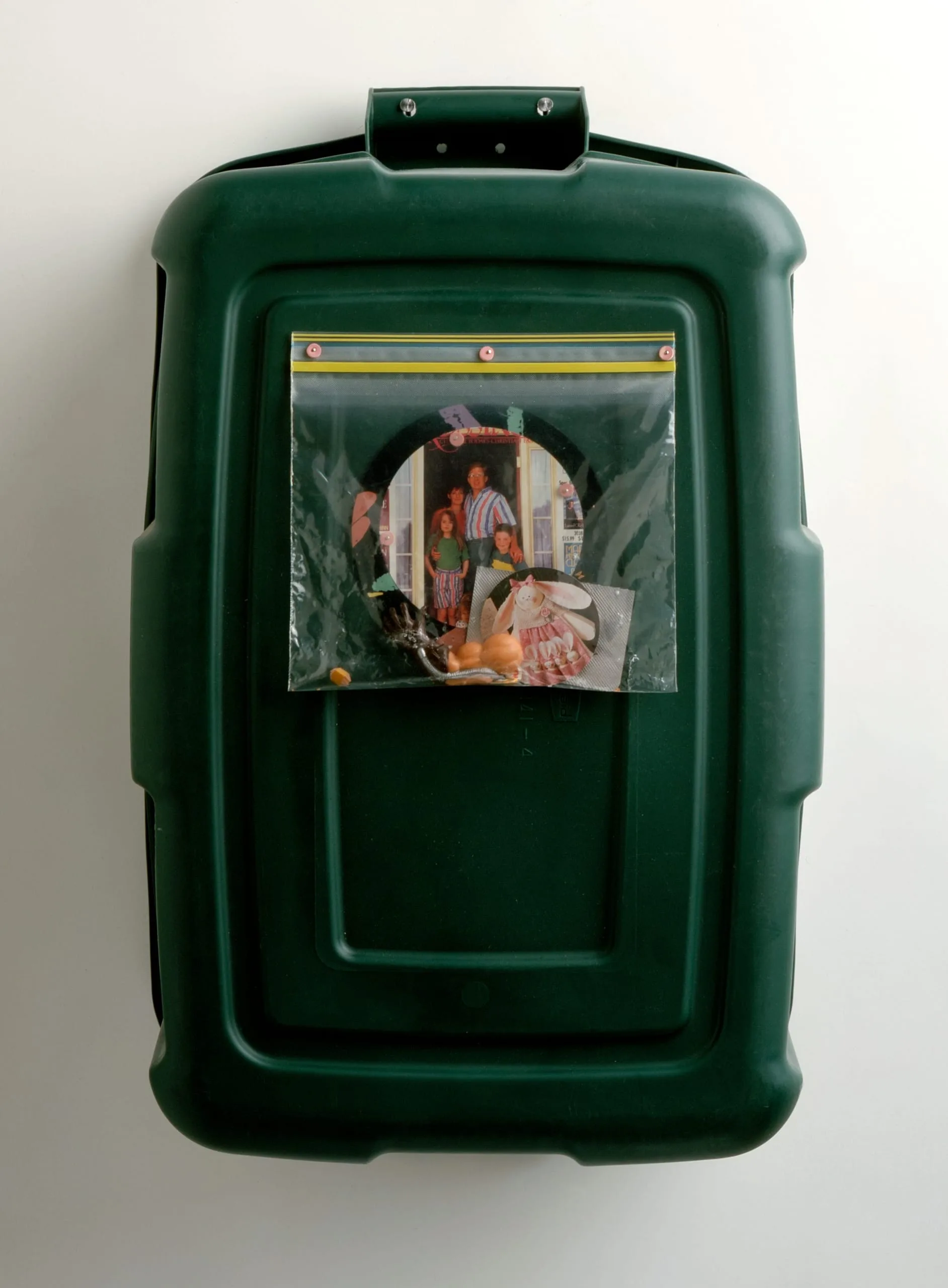 Mixed-media assemblage: a dark green plastic trash can lid mounted on a wall, with a clear zip-lock bag affixed to its center containing cut-out magazine images of figures standing in a doorway and a decorative rabbit figurine.
