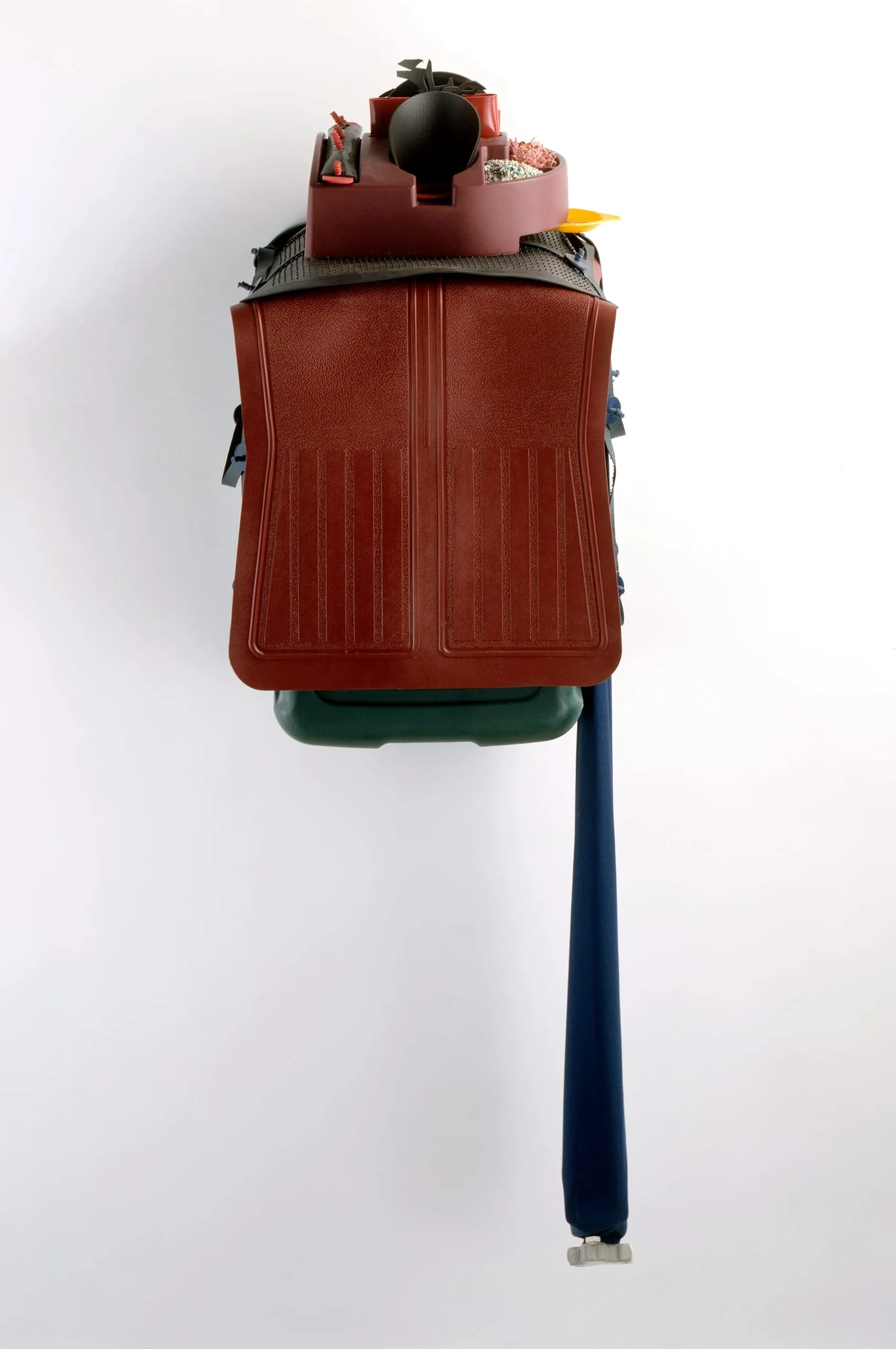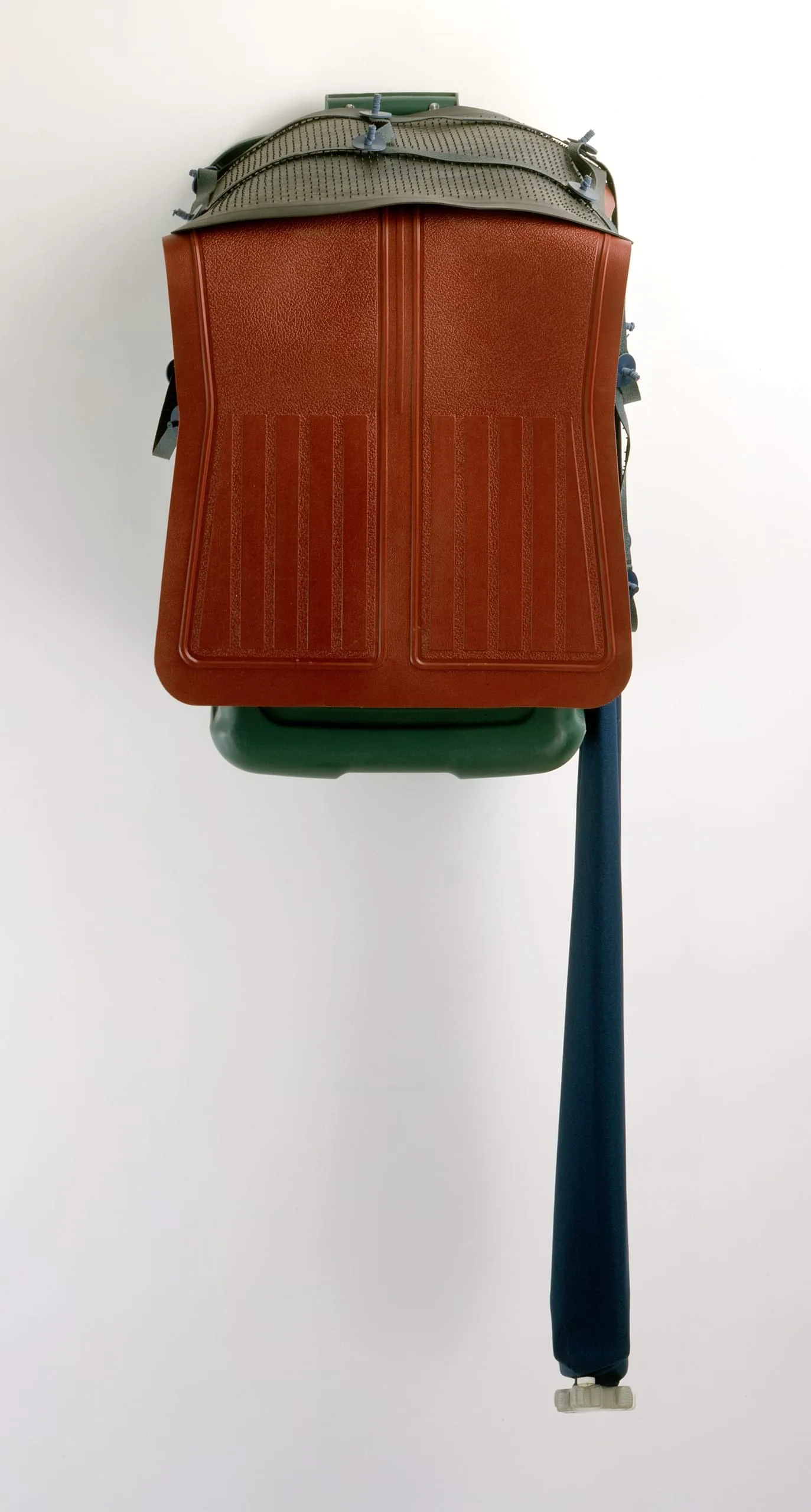 Wall-mounted assemblage of found objects: a rust-brown molded plastic car seat back secured with olive-green nylon straps over a dark green plastic container, with a long navy cylindrical tube hanging vertically from the base.