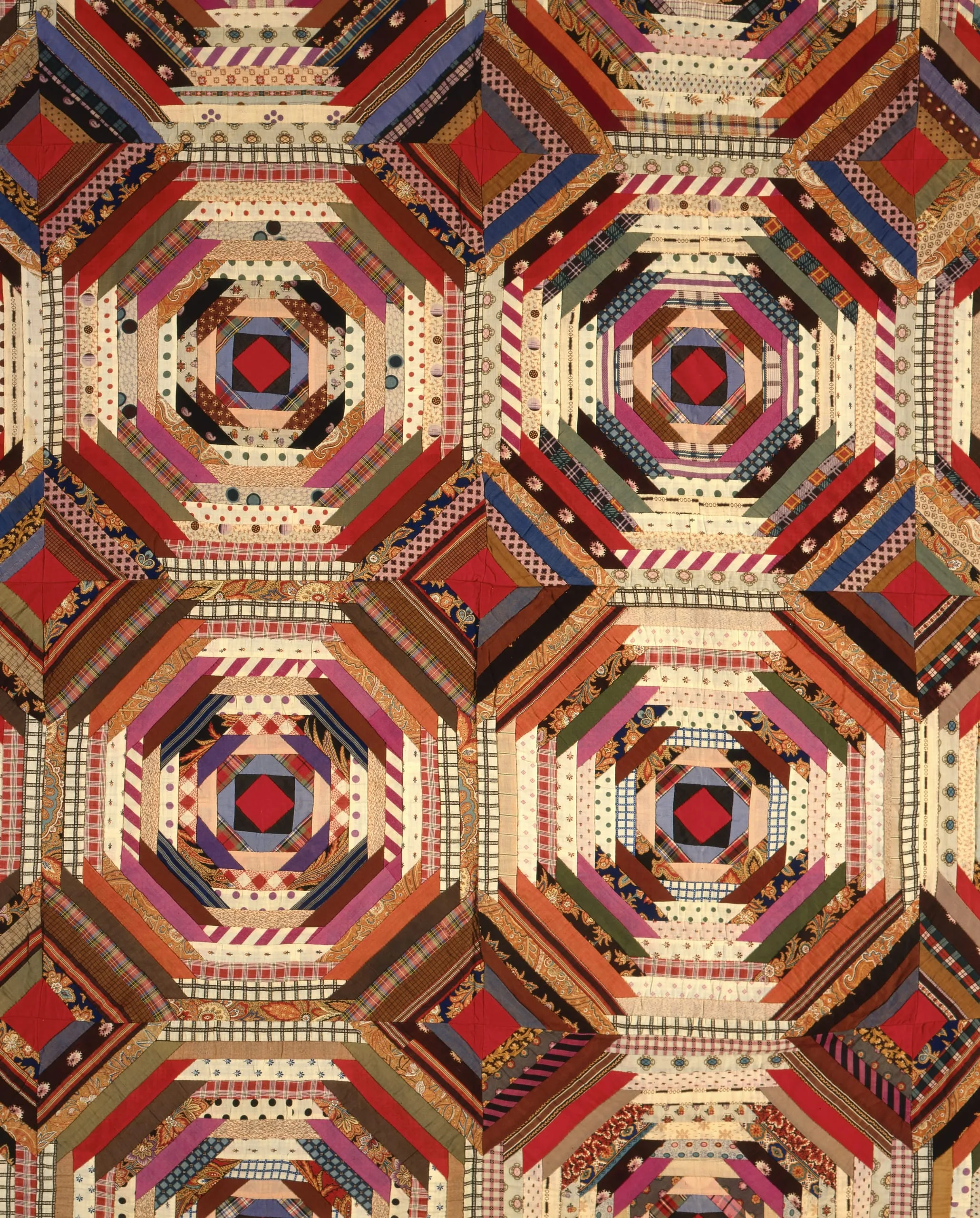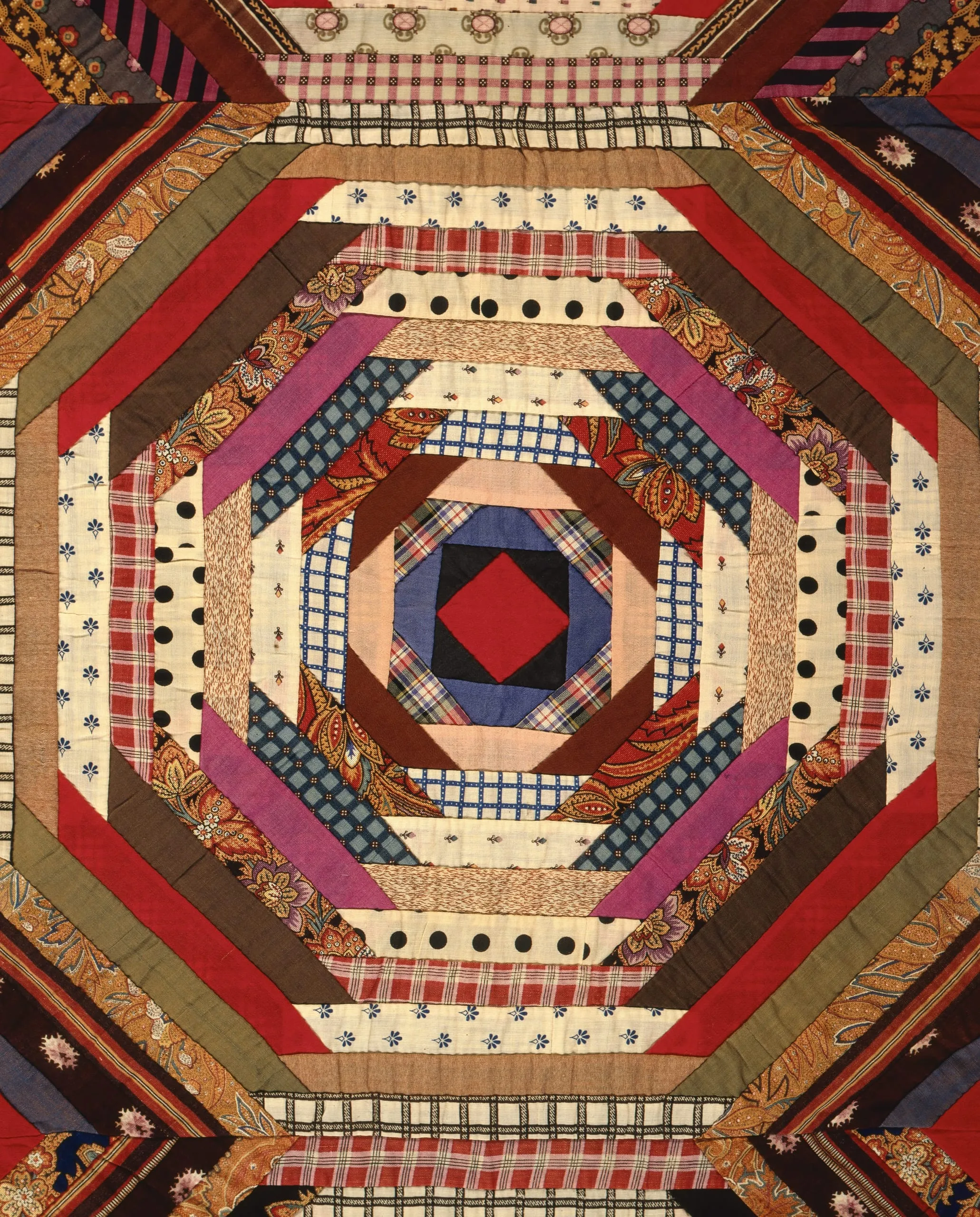 This variant of the Log Cabin pattern quilt, with its strips set diagonally across the corners of each center square, ends angled and lapped, sets up a lively visual counterpoint. The traditional alternation of light and dark segments in each component square creates spiny pineapple shapes. They advance and retreat, sometimes setting up a visual illusion of wildly spinning, spiky wheels. The center squares of Log Cabin blocks are traditionally red, although other colors are not uncommon. Here they are a mosaic of red, blue, and black triangles.