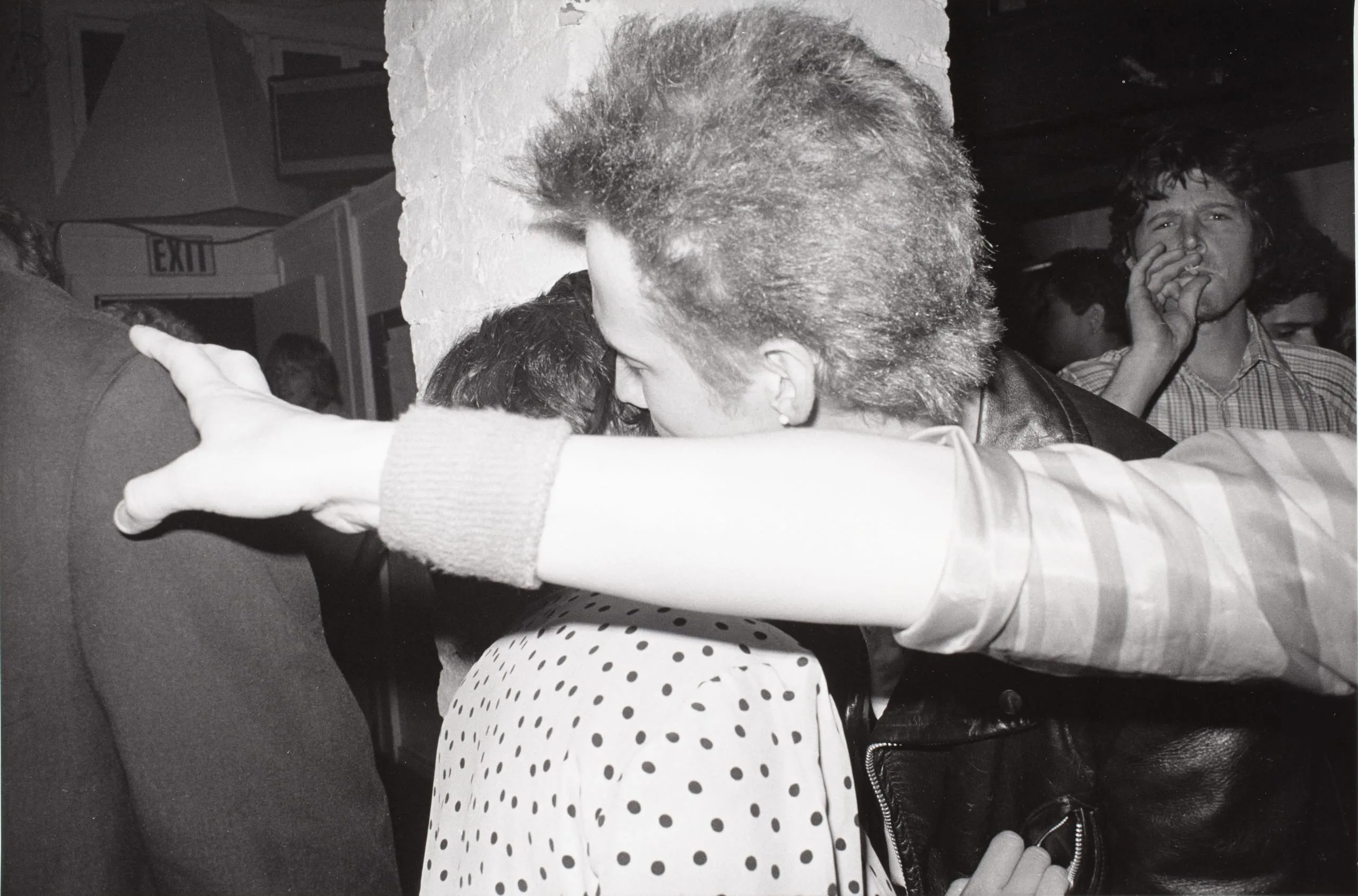 Black and white photograph of two people embracing near a pillar in a crowded indoor space, with an illuminated EXIT sign visible in the background