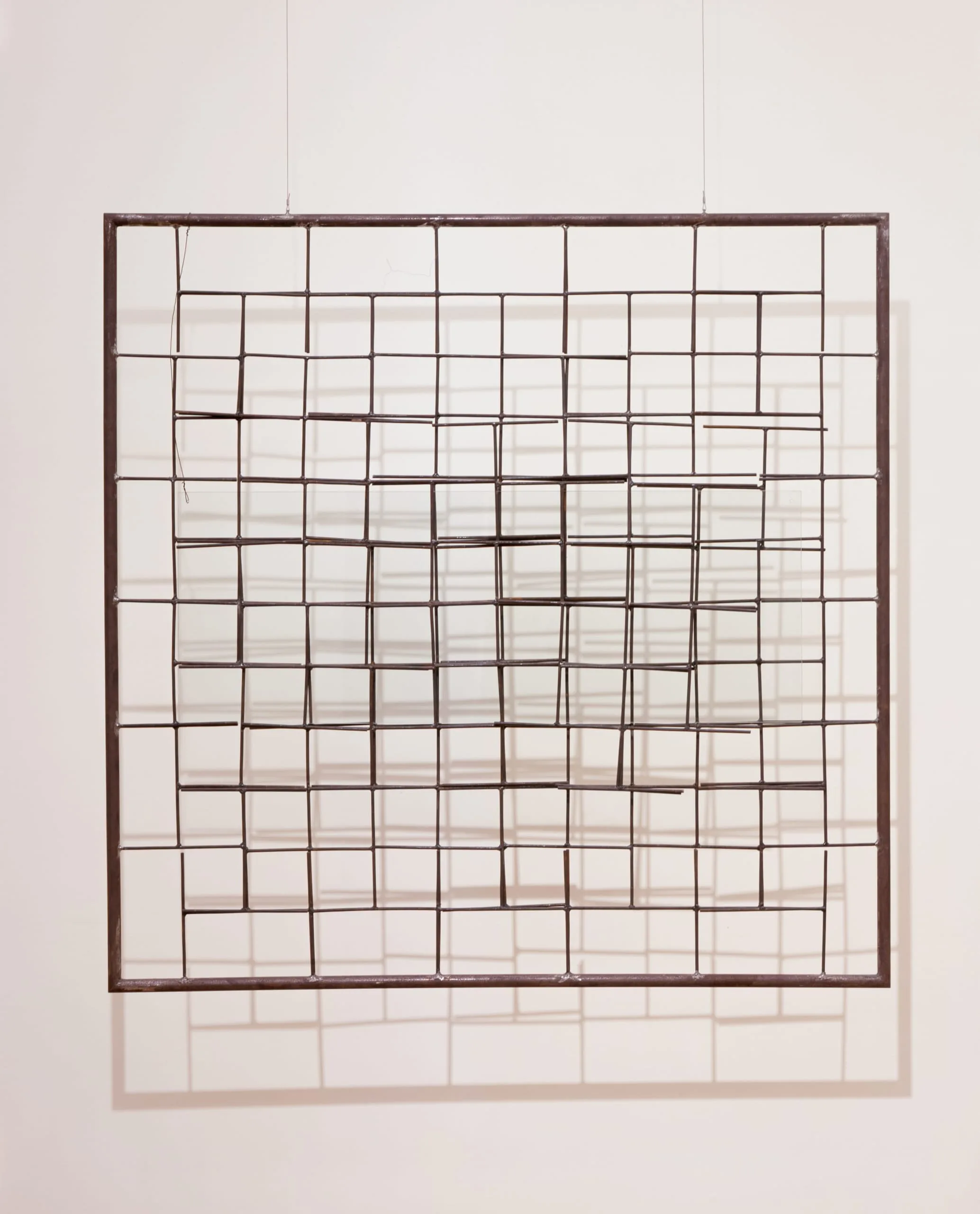 Webs of Freedom (Malhas da liberdade) was constructed by using the same linear element repeatedly. In theory, this work could extend indefinitely across a single plane and continue to grow volumetrically. Separate elements hanging on the wall behind the metal grid represent its alphabet or building blocks. Despite its apparent order, the spiky angularity of the grid, with a rectangular sheet of glass trapped in its structure, has more disturbing connotations. Conceived at the height of Brazil's twenty-year dictatorship (1964-84), the work is an indictment of that regime and a statement about the nature of existence.