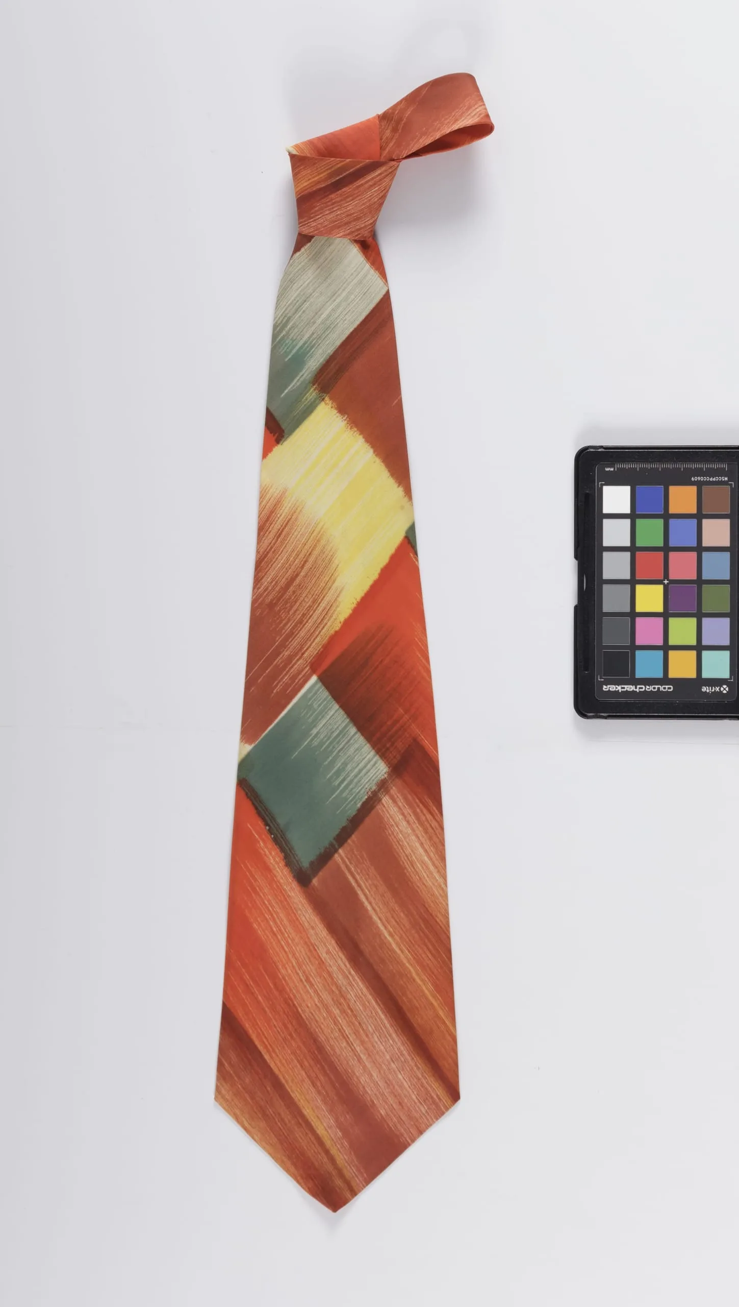 Woven silk necktie in terracotta orange with diagonal sage green and canary yellow diamond shapes, displayed hanging against a gray background