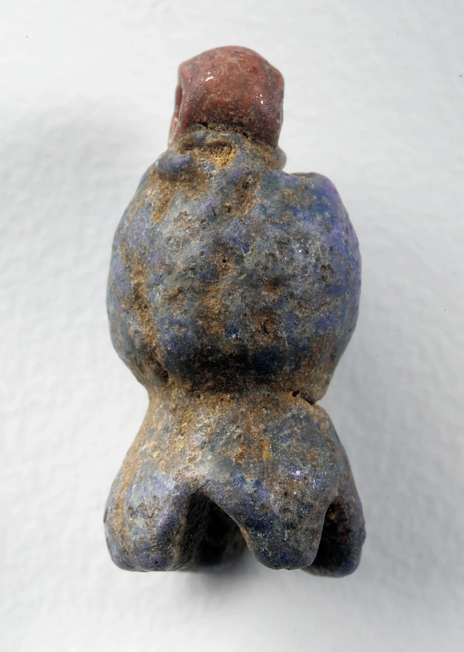 Small ceramic or stone figurine seen from above and behind, with rough blue-violet pigmented surface and a red-coated block-like head, seated form with bent legs