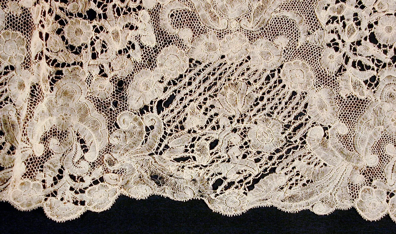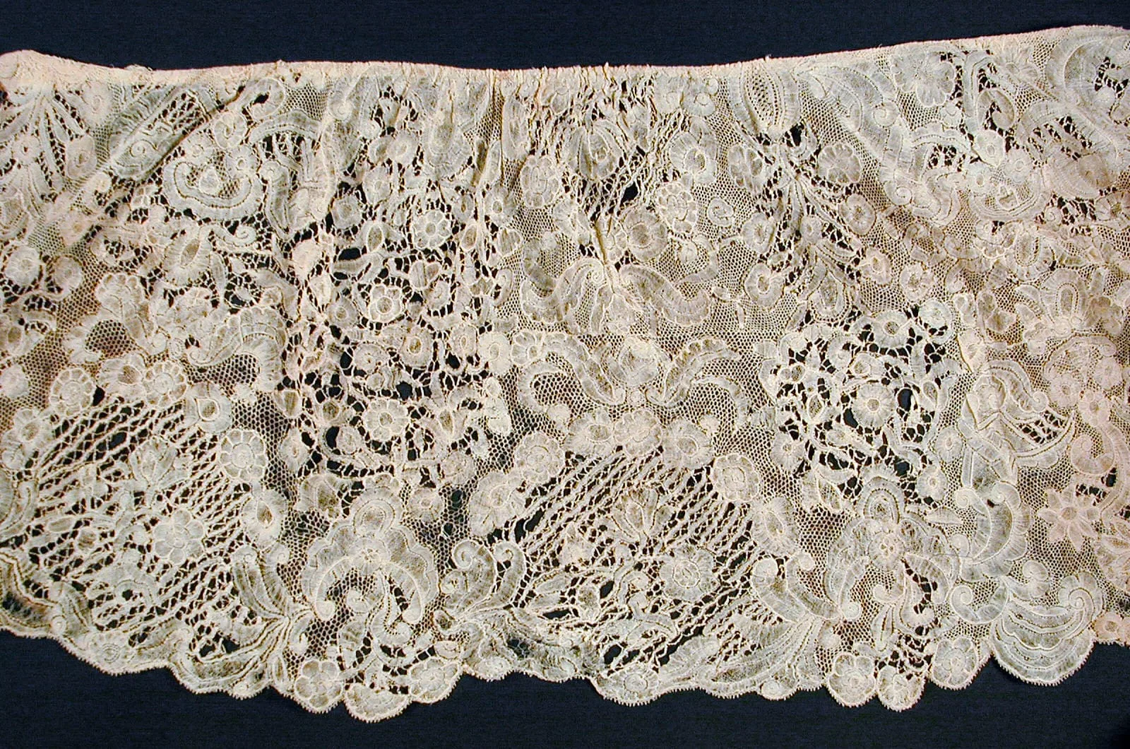 Horizontal strip of cream-colored bobbin lace with allover floral and scrolling motifs, scalloped lower edge, photographed against a navy blue background