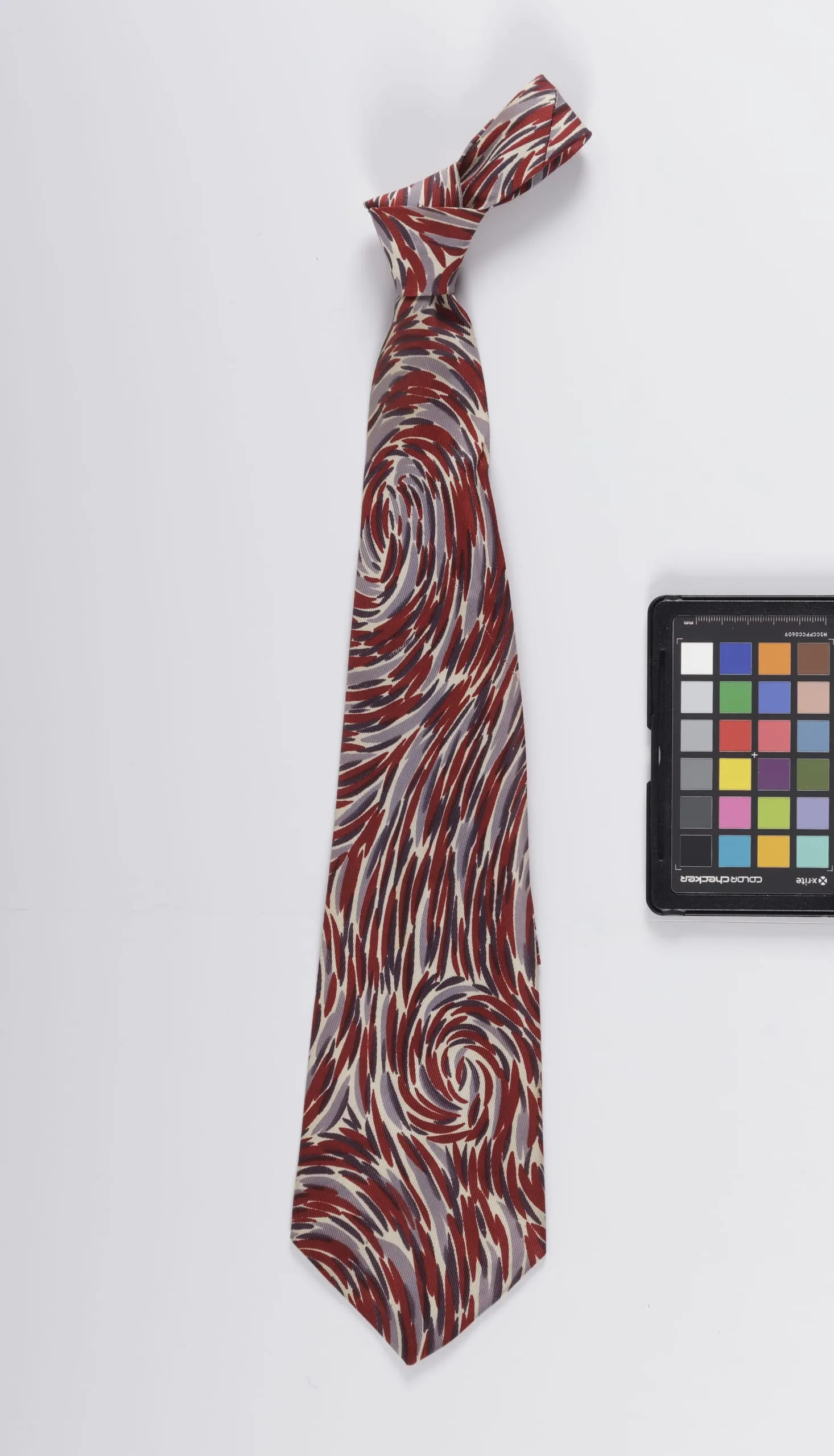 Neckties with a swirling allover pattern of crimson red, silver-gray, and cream curved brushstroke-like marks, knotted at top, against a pale background