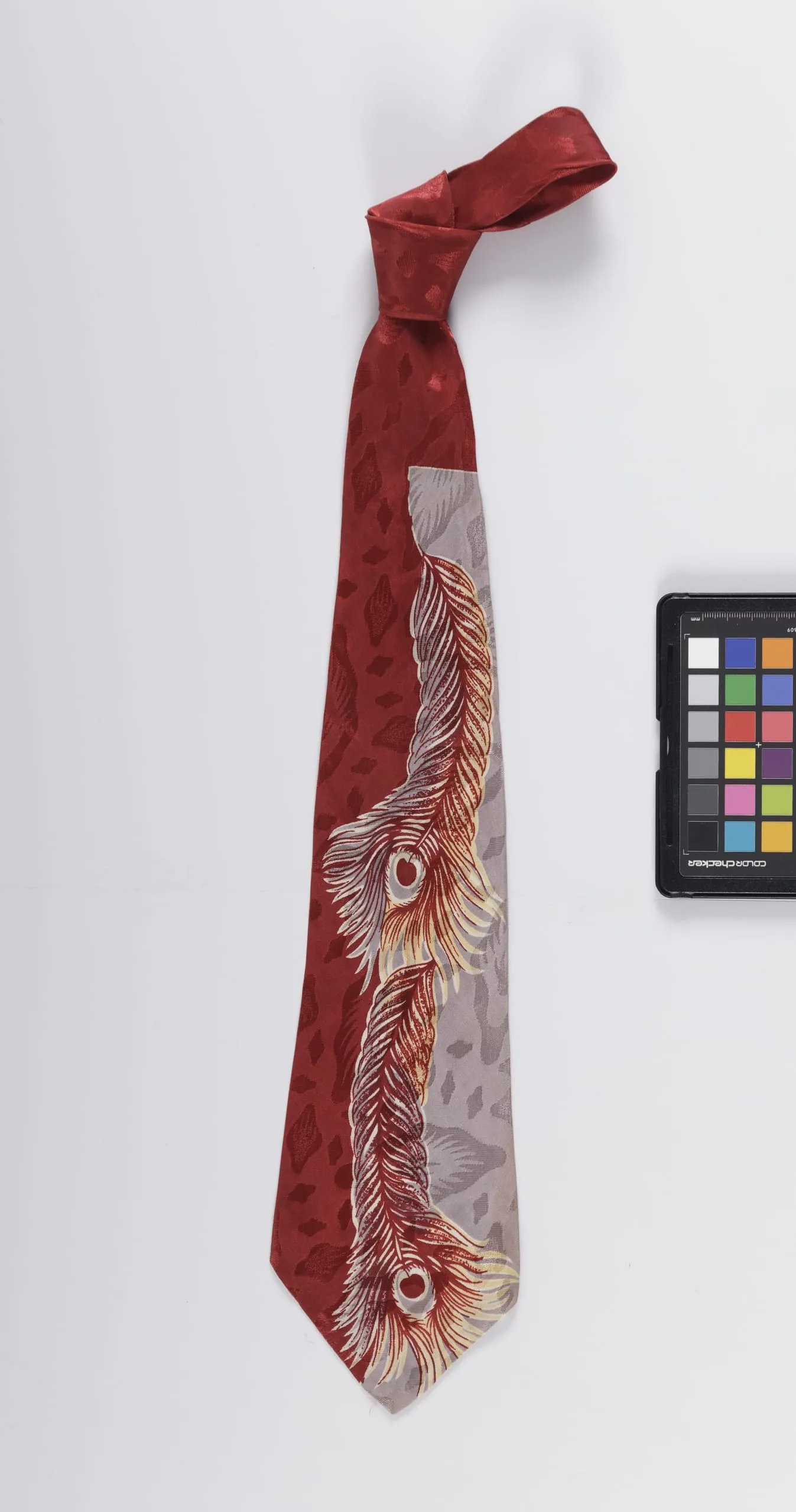 Wide silk necktie with crimson and silver-gray panels divided diagonally, decorated with a large peacock feather motif in rust, cream, and gold