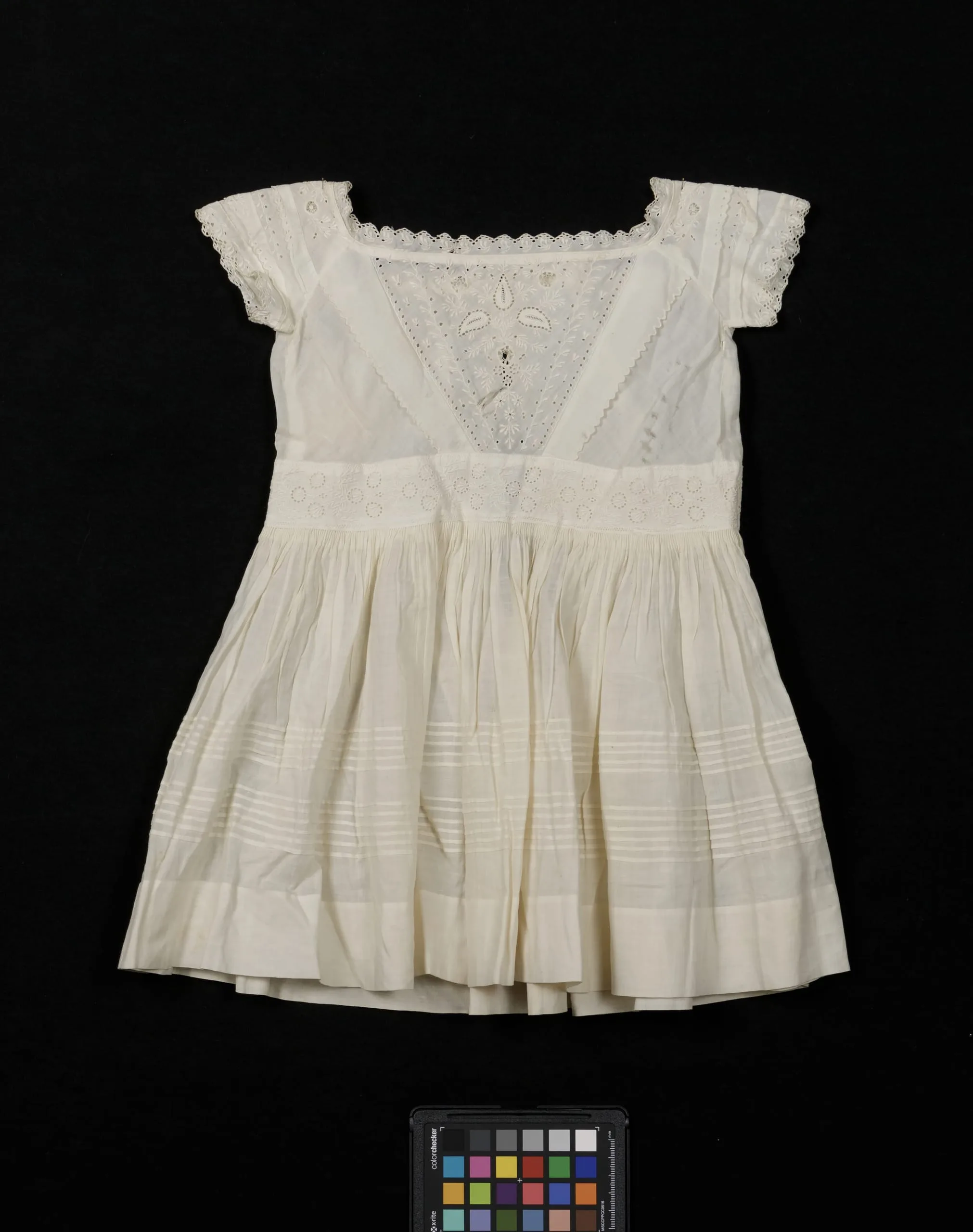 Small child's white cotton dress displayed flat, with broderie anglaise lace trim, eyelet bodice inset, embroidered waistband, and tucked skirt