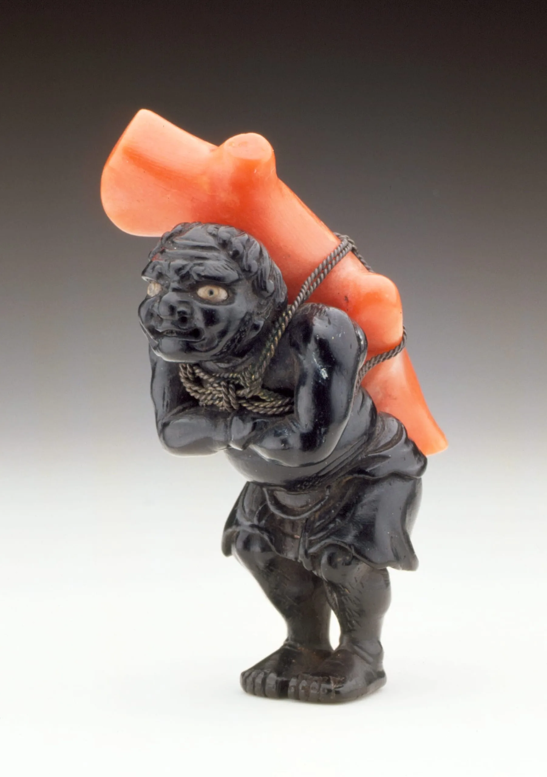 - Umimatsu (black coral or sea pine), coral, woven metal cord, inlays