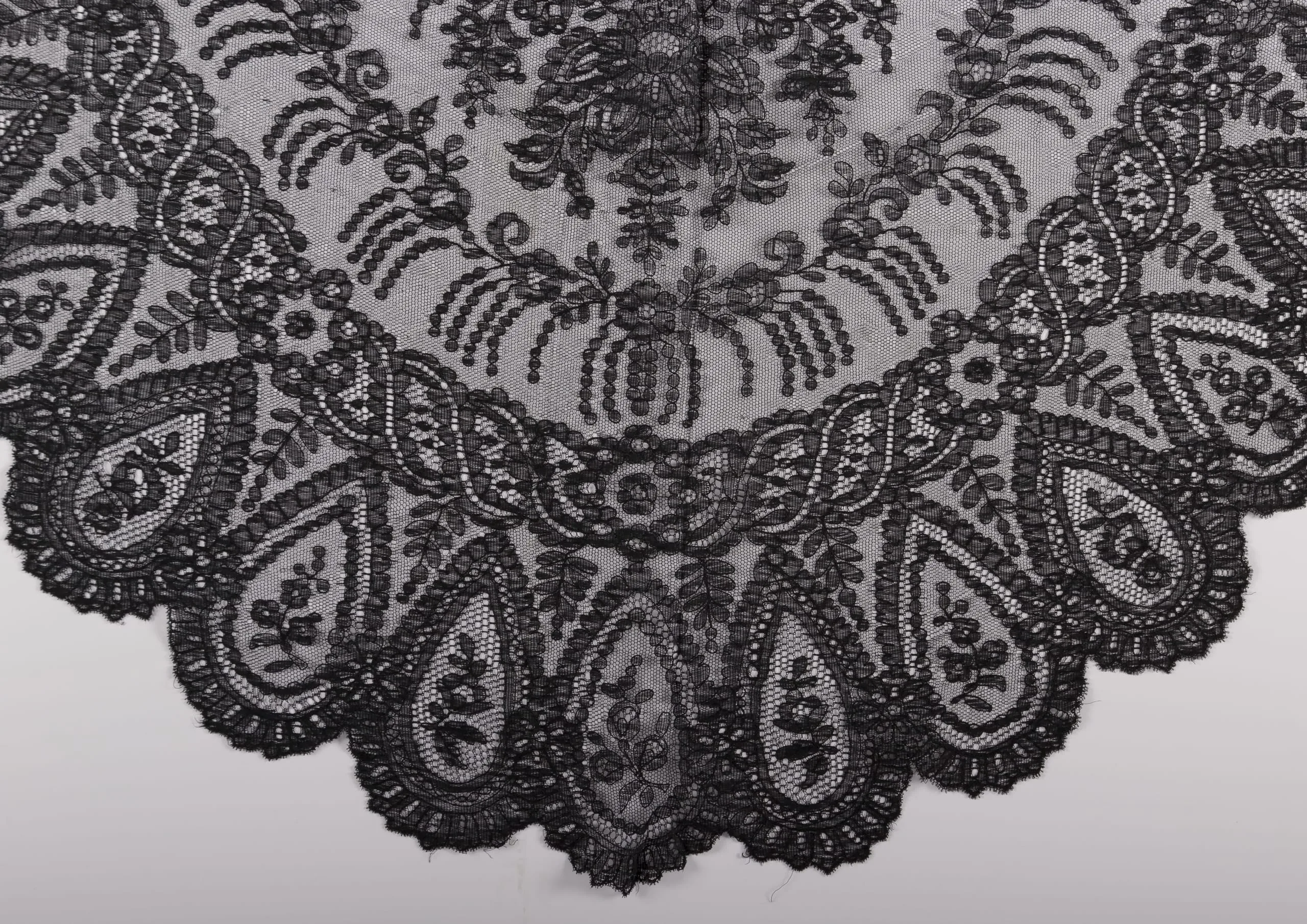Black lace textile fragment with scalloped lower border of paisley medallions and repeating floral and botanical motifs on an open net ground