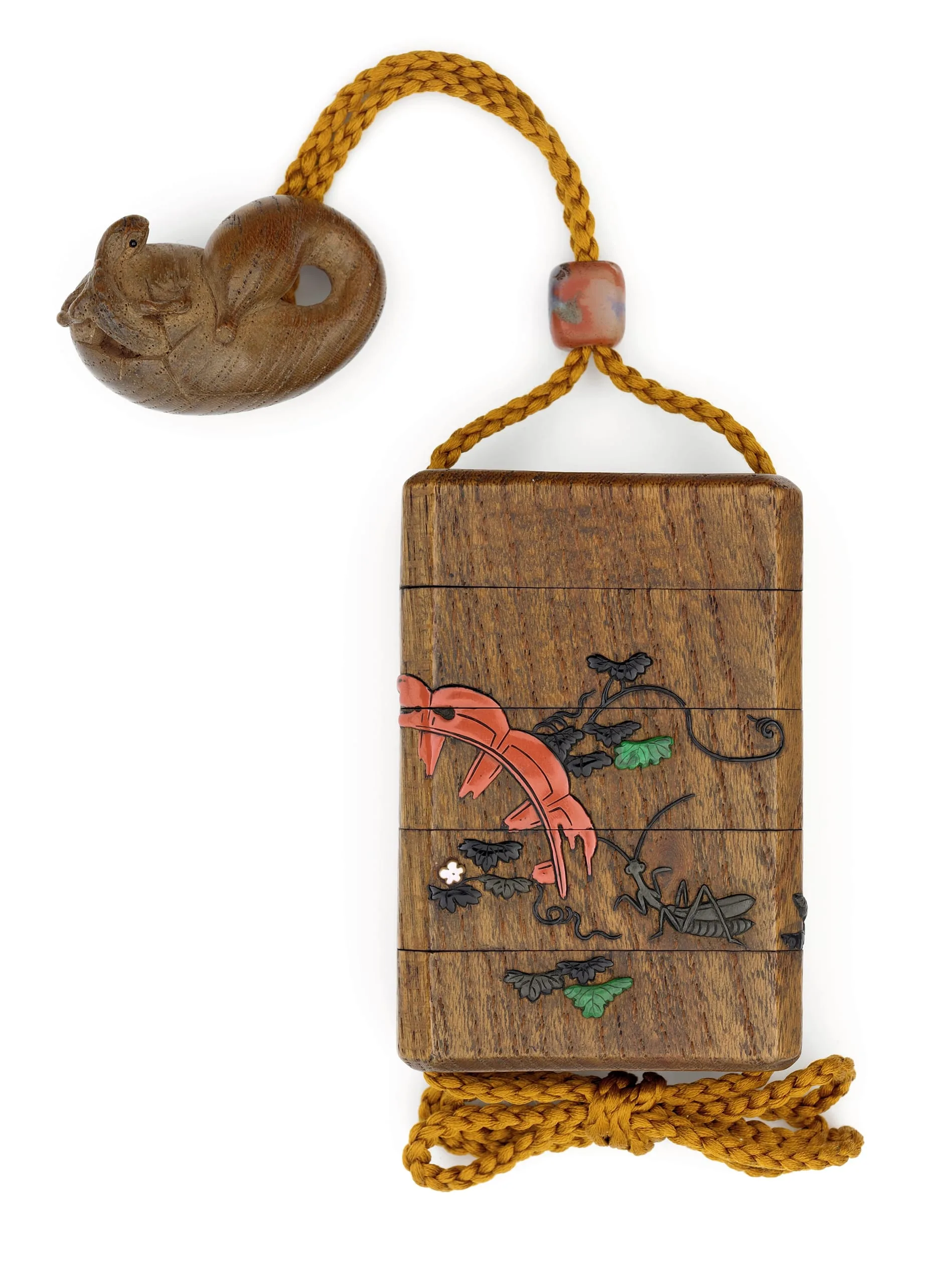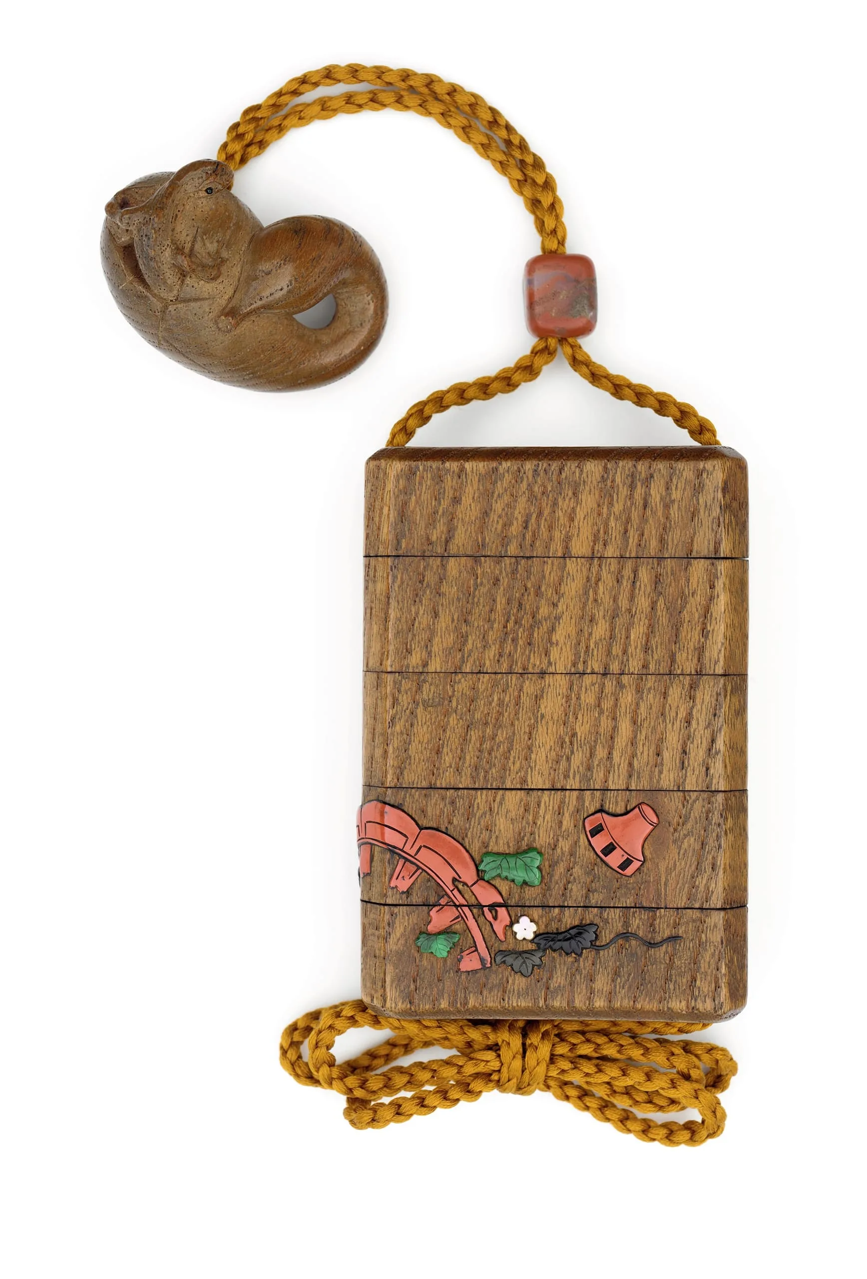 - Inrō: Keyaki wood with lacquer, simulated inlays, and mother-of-pearl; Ojime: agate; Netsuke: paulownia wood