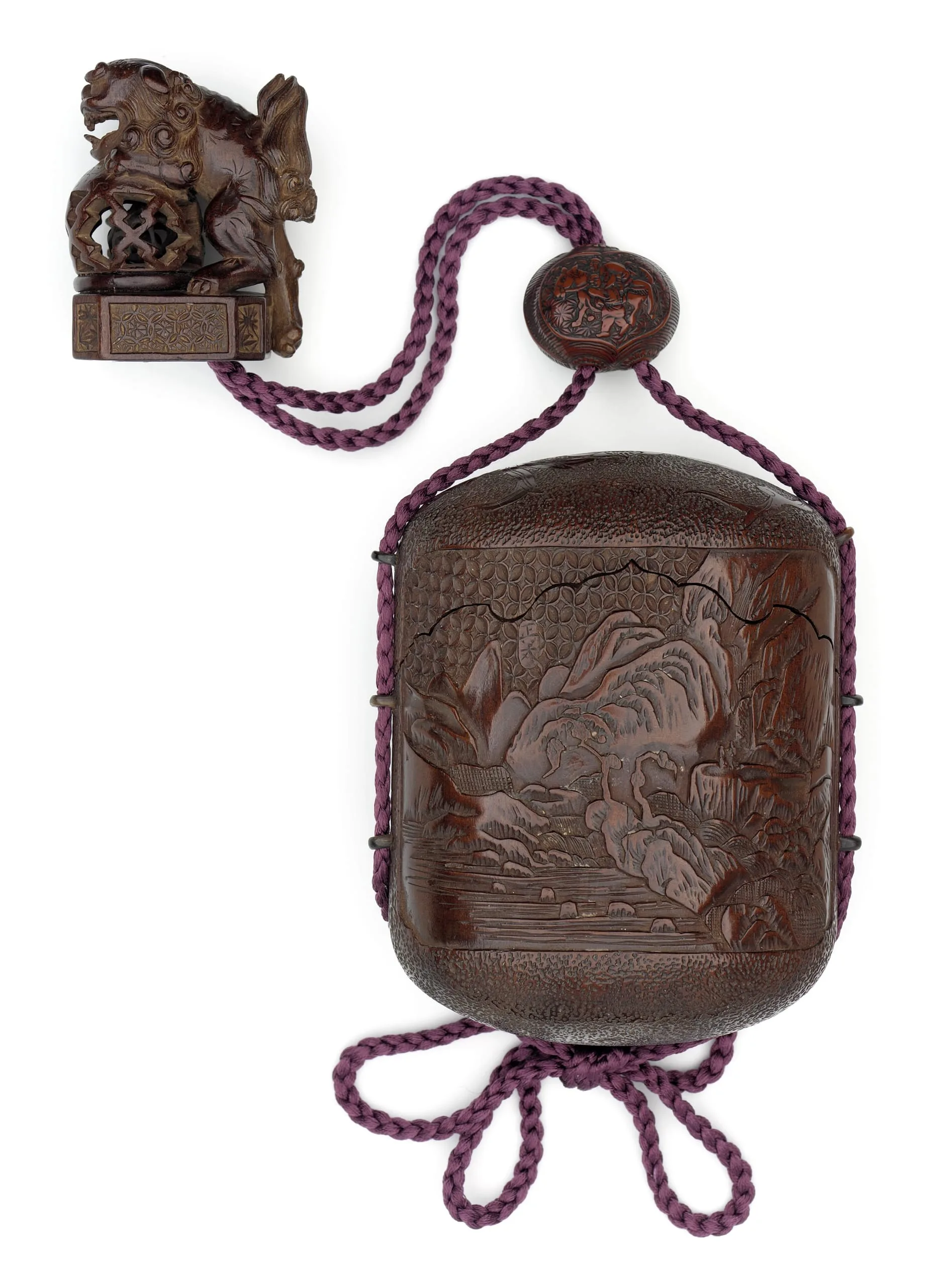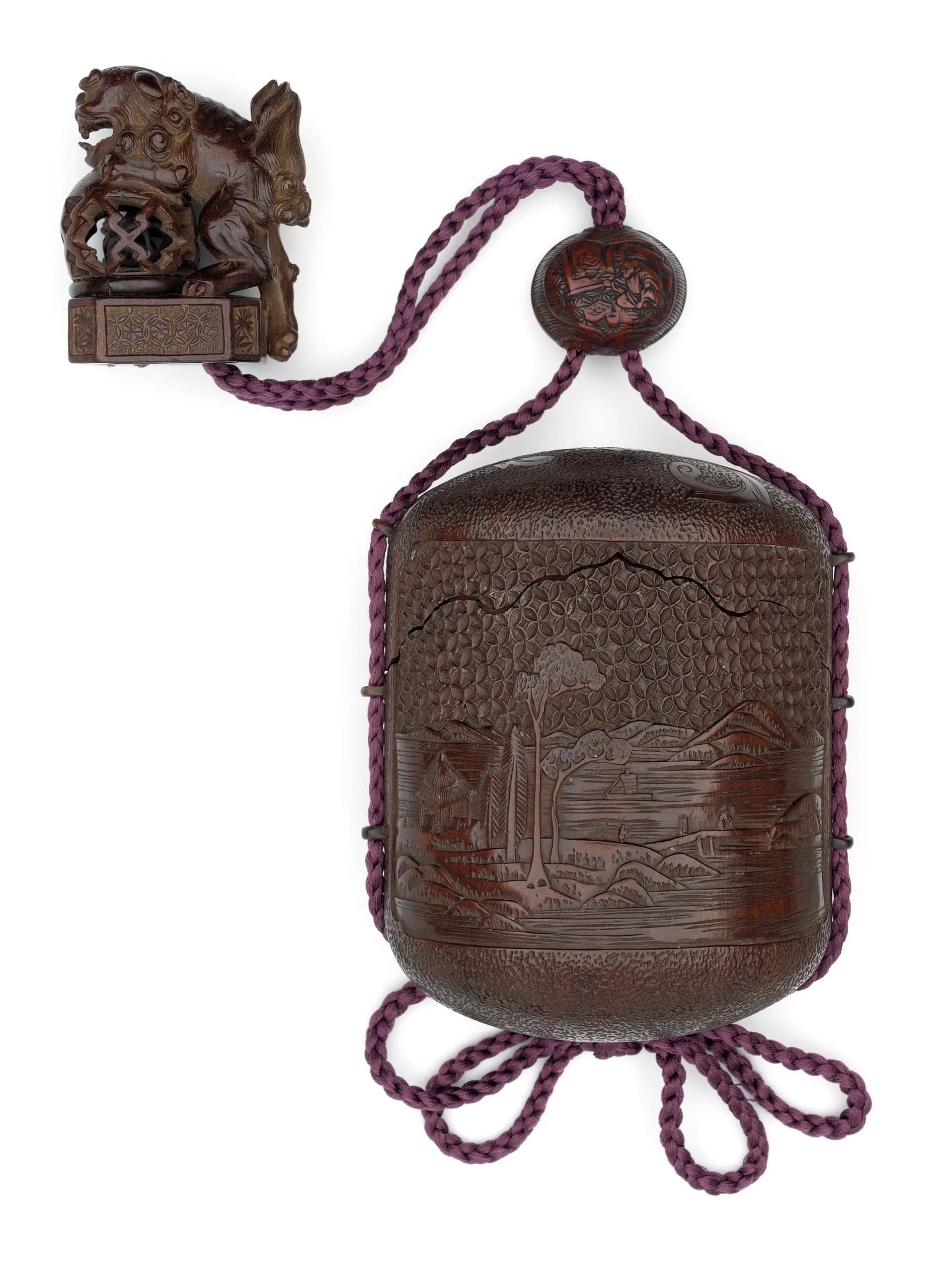 - Tonkotsu: cherry wood (sakura) cut from a single block and buffalo horn (suigyu) loops; tonkotsu type; Ojime: carved nut; Netsuke: wood