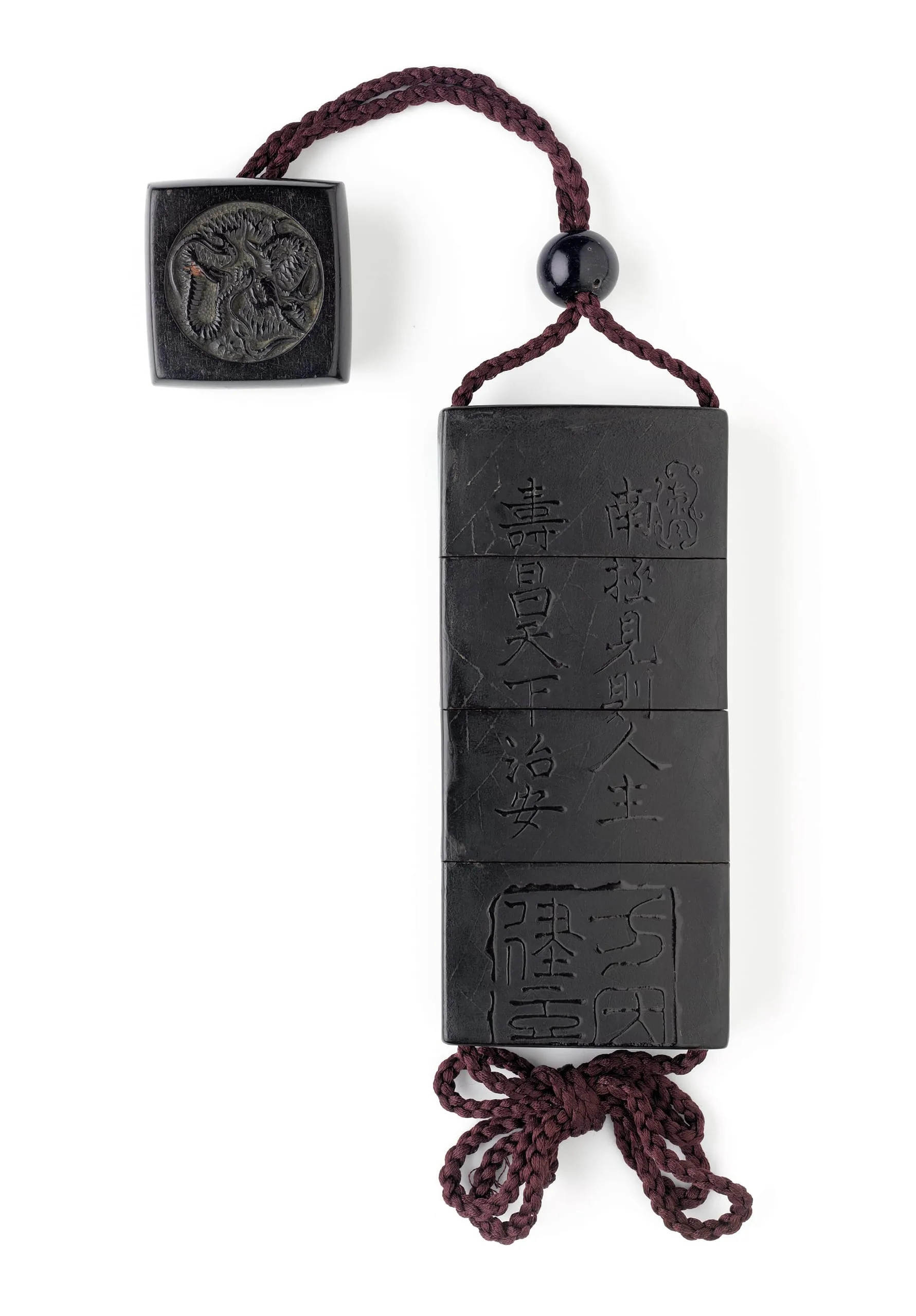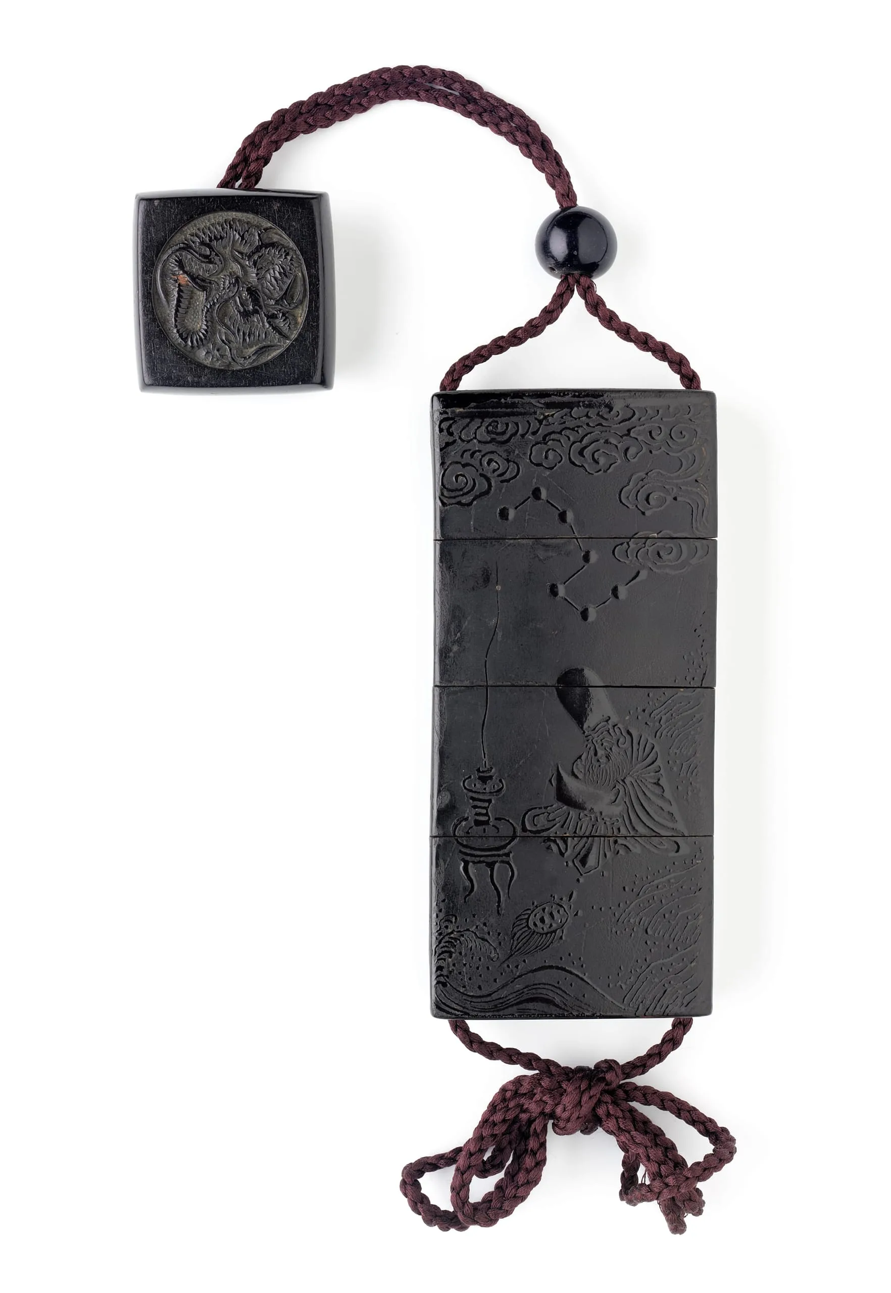 - Inrō: black lacquer on substrate; Ojime: black hardstone or glass; Netsuke: ebony; manjū type