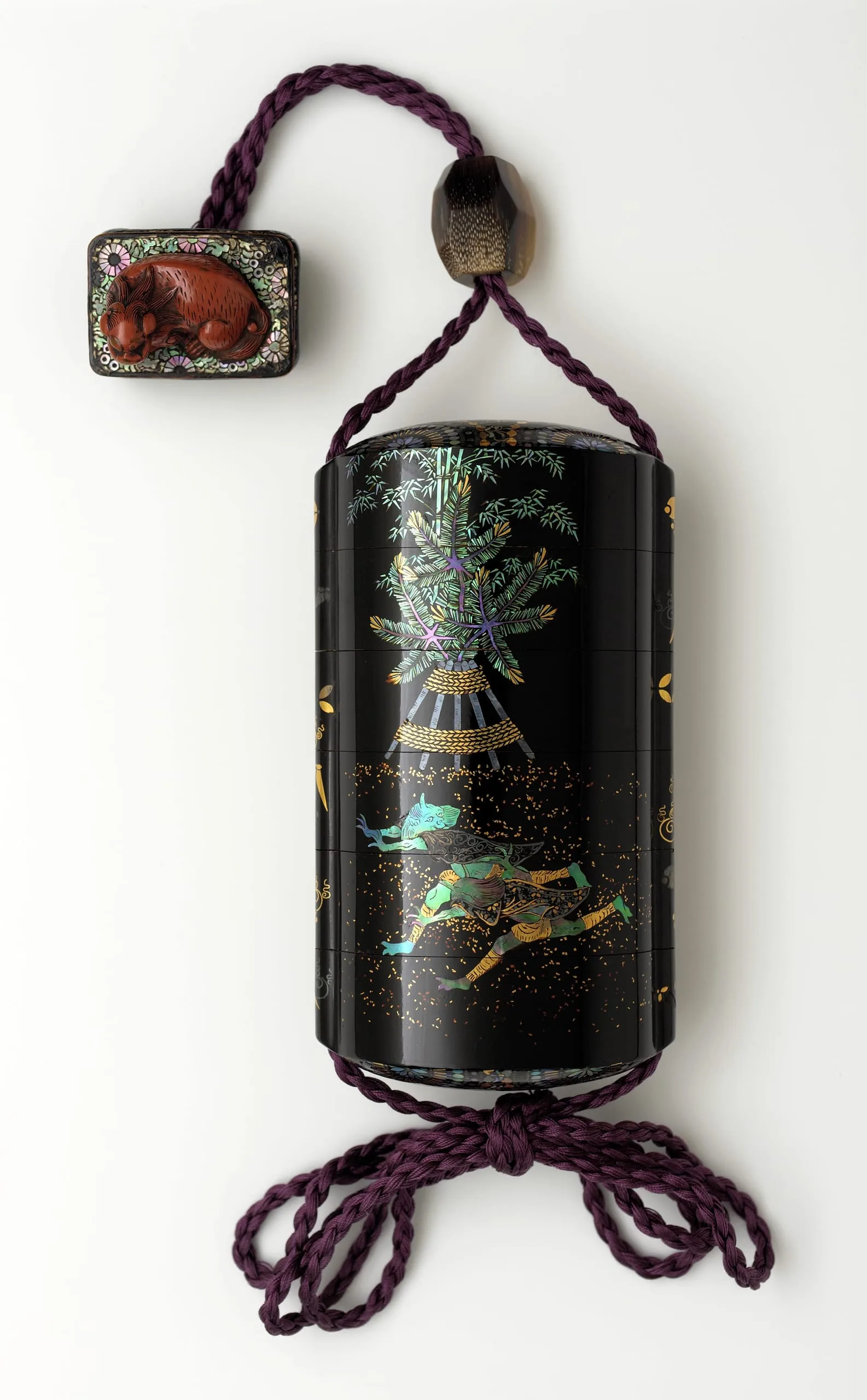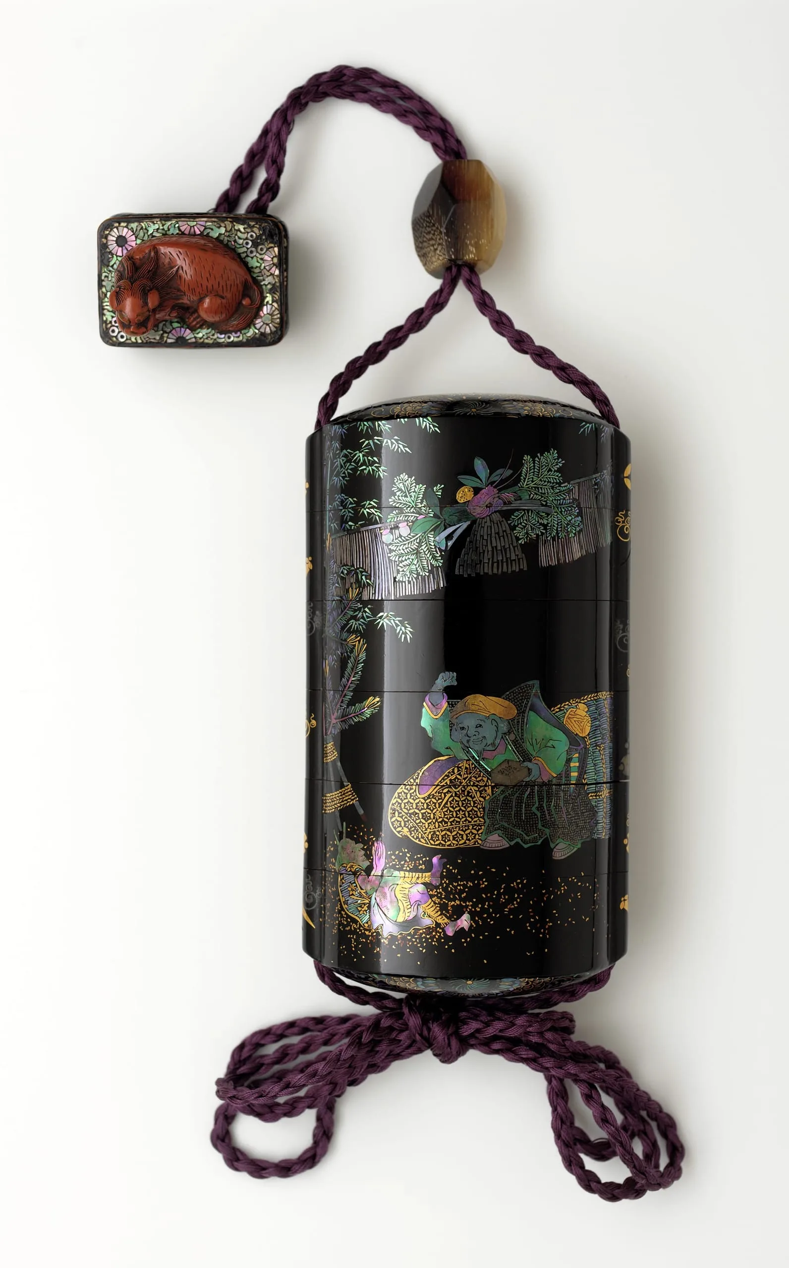 - Inrō: lacquer on substrate, sprinkled gold flecks, inlaid mother-of-pearl; Ojime: buffalo horn; Netsuke: vermilion and black lacquer on wood with mother-of-pearl inlay