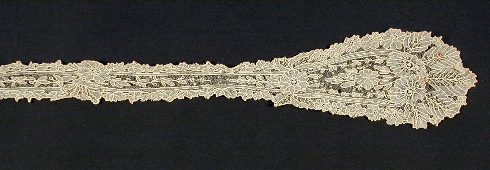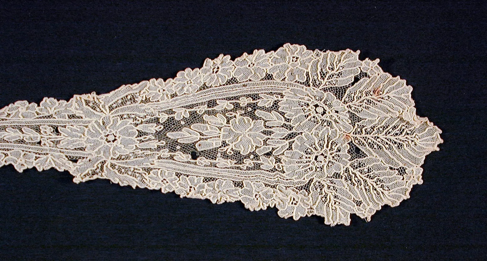 Cream-colored lace piece, long and narrow with a wide pointed terminal, decorated with raised floral and leaf motifs on a fine mesh ground