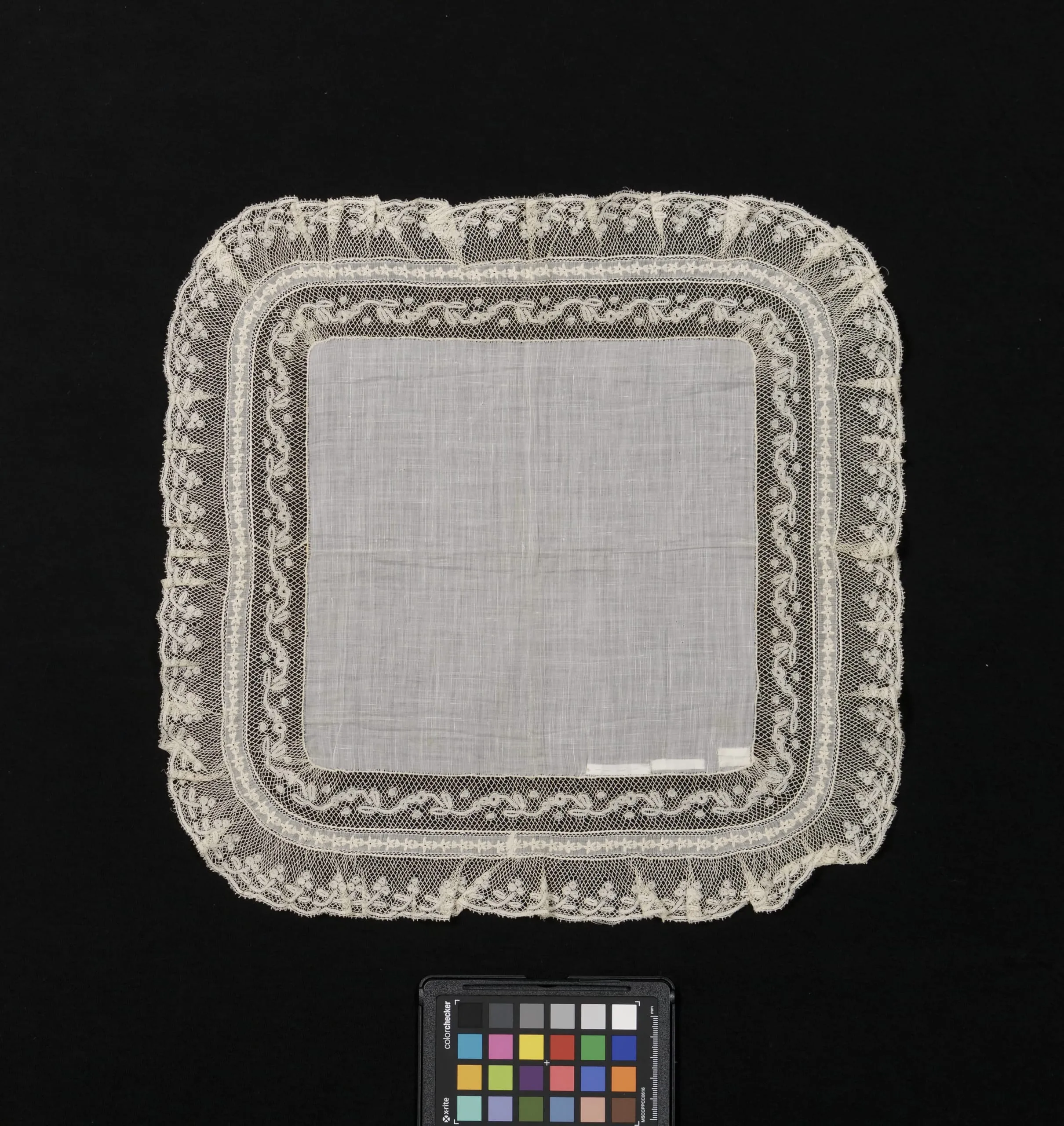 - Linen plain weave with drawn threadwork, cotton embroidery, and cotton machine lace