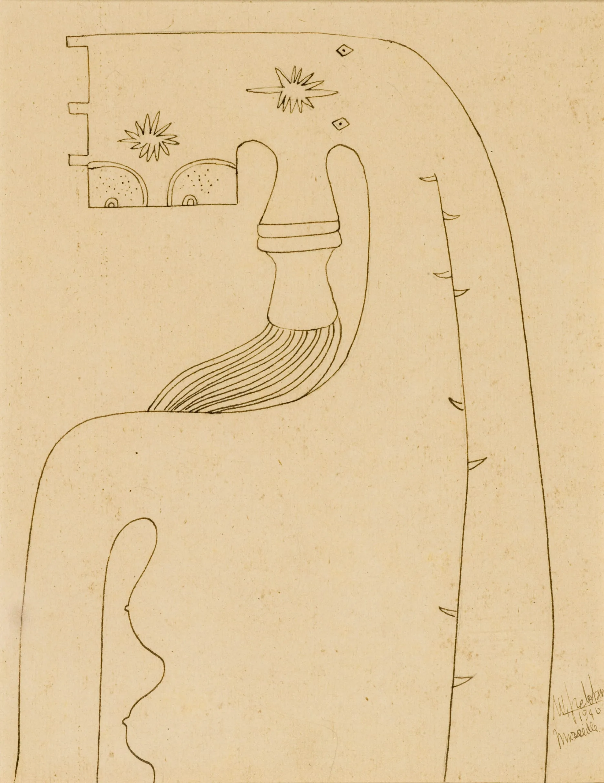 During Wifredo Lam's stay in Marseille from 1940 to 1941, while he awaited passage out of France, the artist produced four or five drawings a day. Conceived as studies for André Breton's poem Fata Morgana, they fuse cubist and surrealist styles. The drawings document the enormous anxiety of other artists also waiting to escape France. In them, Lam developed the motif of the femme cheval, or horse-headed female, the curious hybrid being that would become one of Lam's signature images, and which derives from his interest in the Afro-Cuban religion Santería and in the work of Picasso and Matisse.