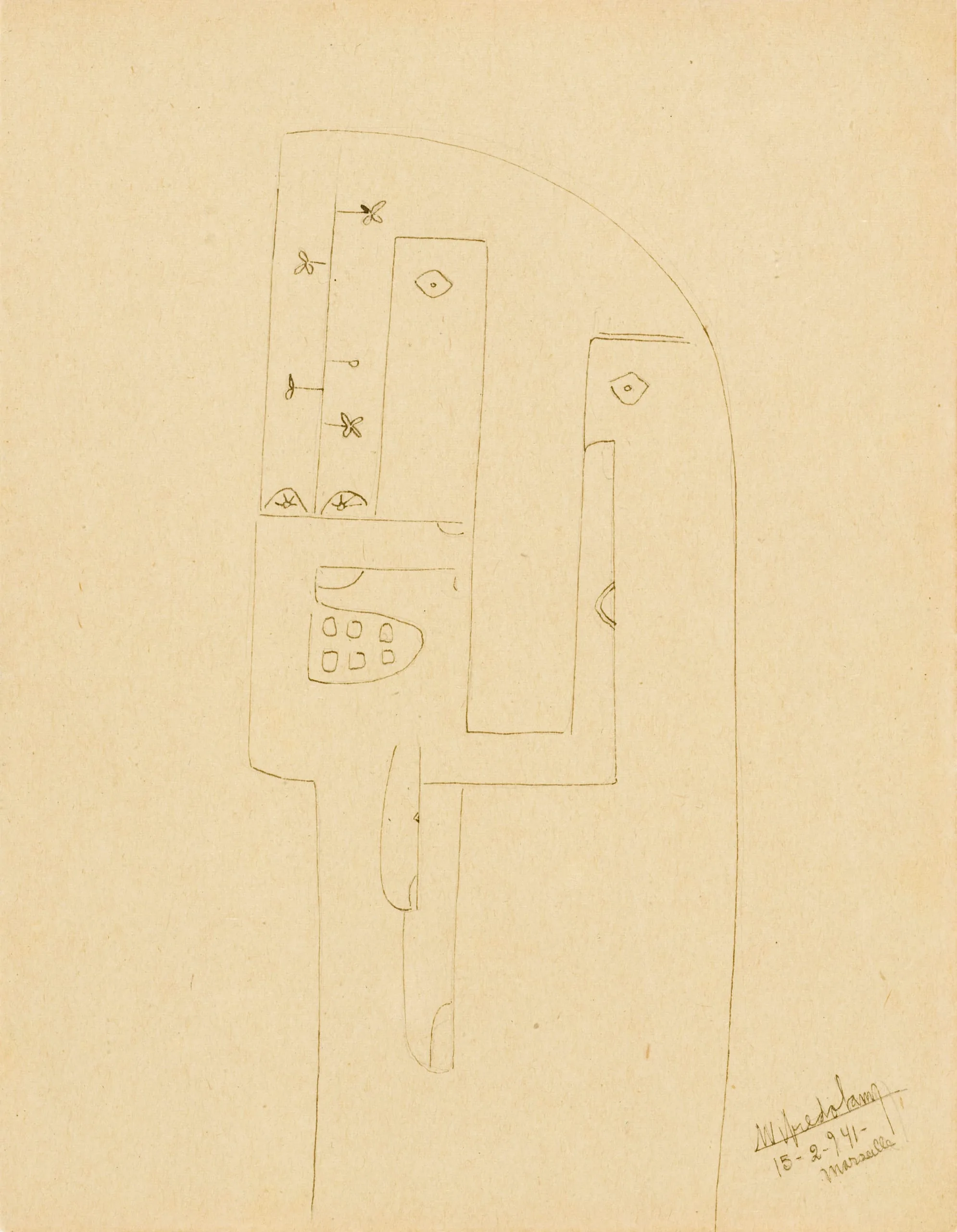 During Wifredo Lam's stay in Marseille from 1940 to 1941, while he awaited passage out of France, the artist produced four or five drawings a day. Conceived as studies for André Breton's poem Fata Morgana, they fuse cubist and surrealist styles. The drawings document the enormous anxiety of other artists also waiting to escape France. In them, Lam developed the motif of the femme cheval, or horse-headed female, the curious hybrid being that would become one of Lam's signature images, and which derives from his interest in the Afro-Cuban religion Santería and in the work of Picasso and Matisse.