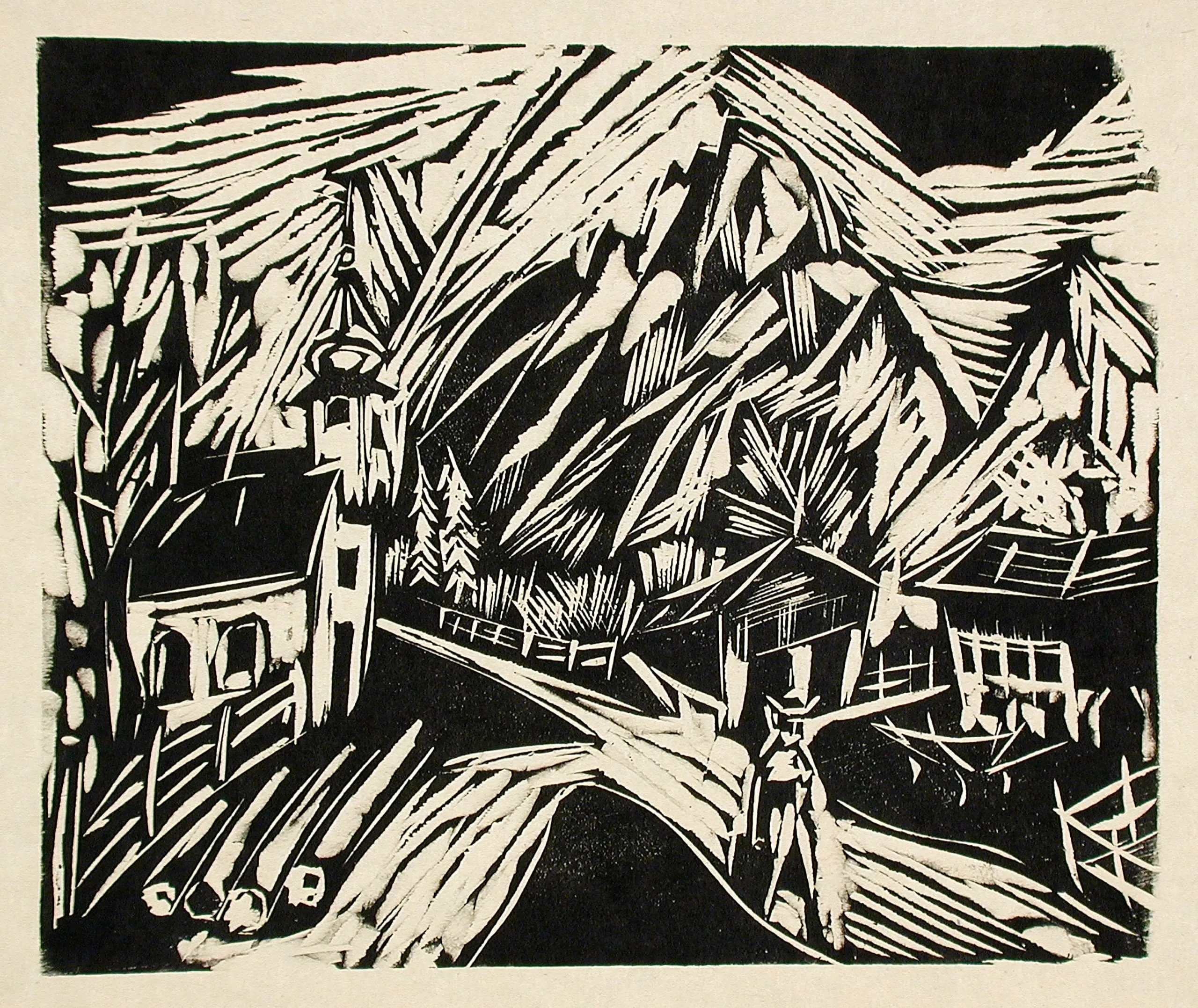 Woodcut print in black ink on cream paper, alpine village with church, mountains, and a lone standing figure, rendered in bold, angular lines