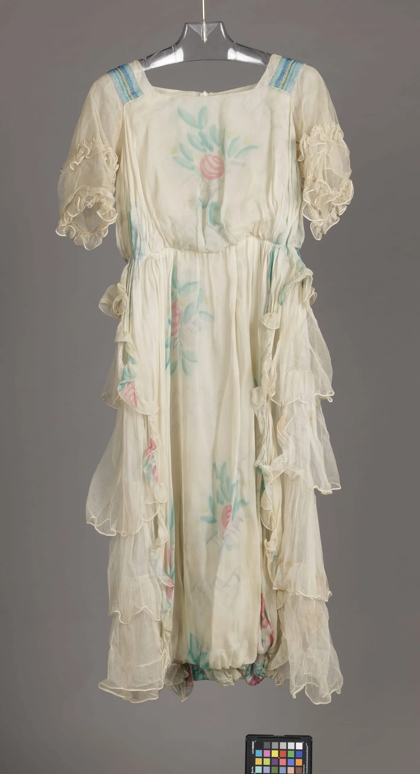 - Silk plain weave (chiffon), painted, and silk net with glass beads