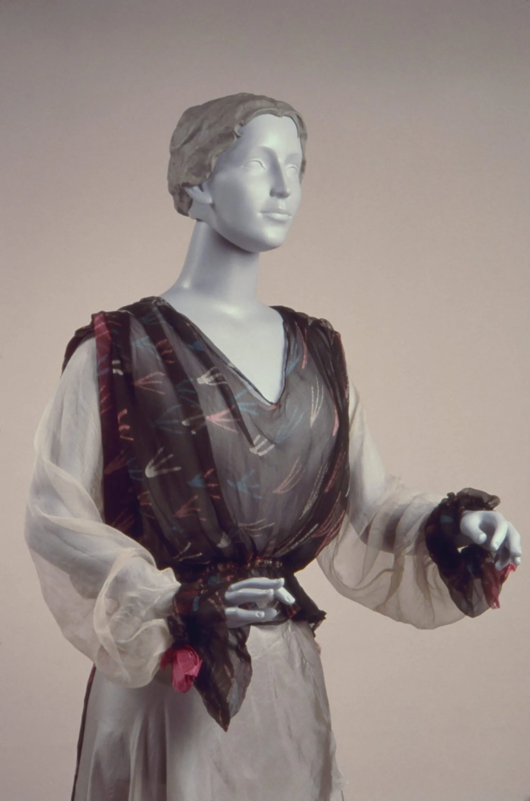 Museum display of layered costume on a gray mannequin: sheer white billowing sleeves beneath a dark printed drape with burgundy trim, tied at the waist