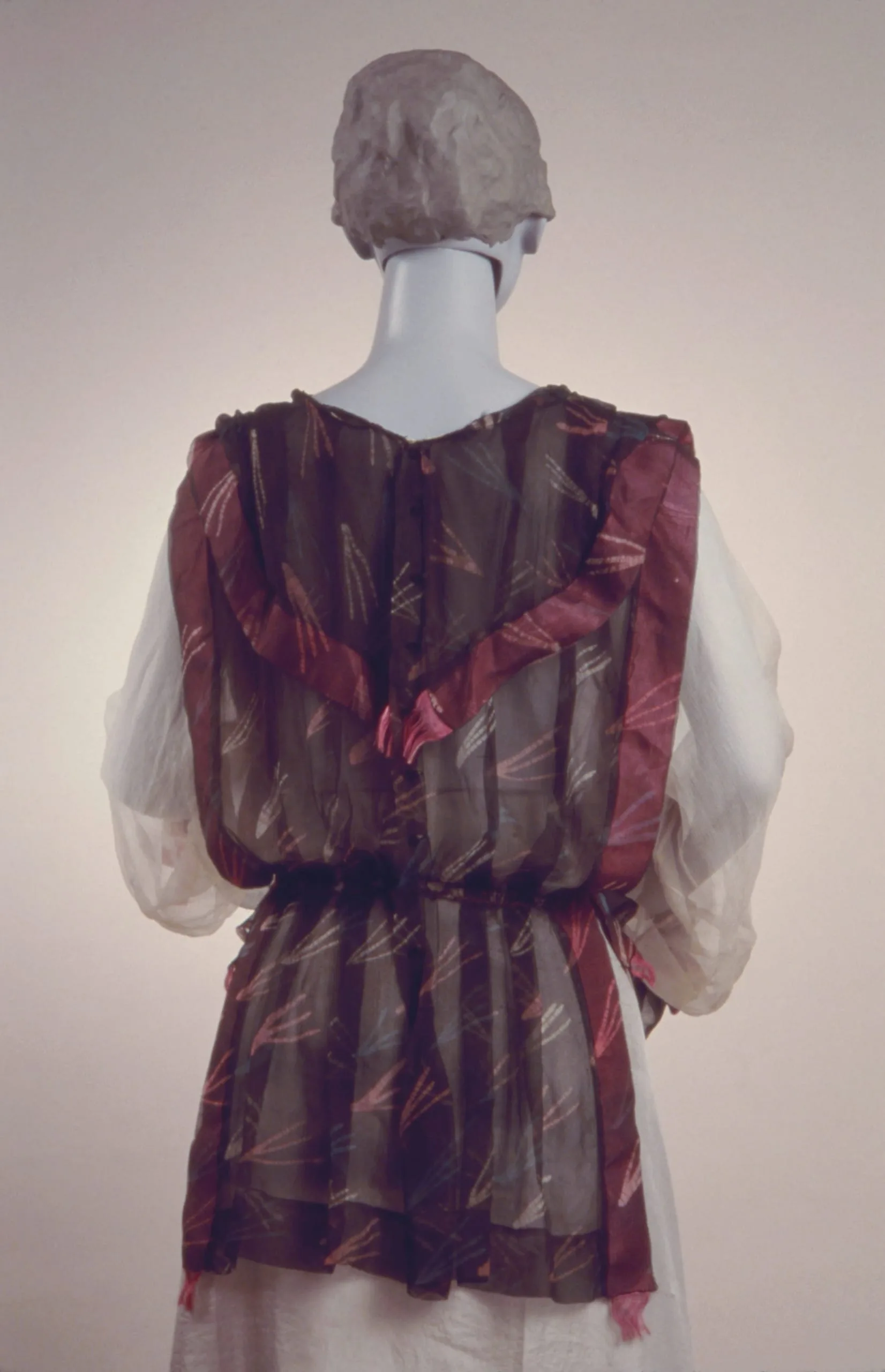 Photograph of a mannequin shown from behind, wearing a semi-sheer dark brown and burgundy patterned tunic with abstract diagonal motifs in pink and gold, draped over a white garment with loose sleeves, cinched at the waist.