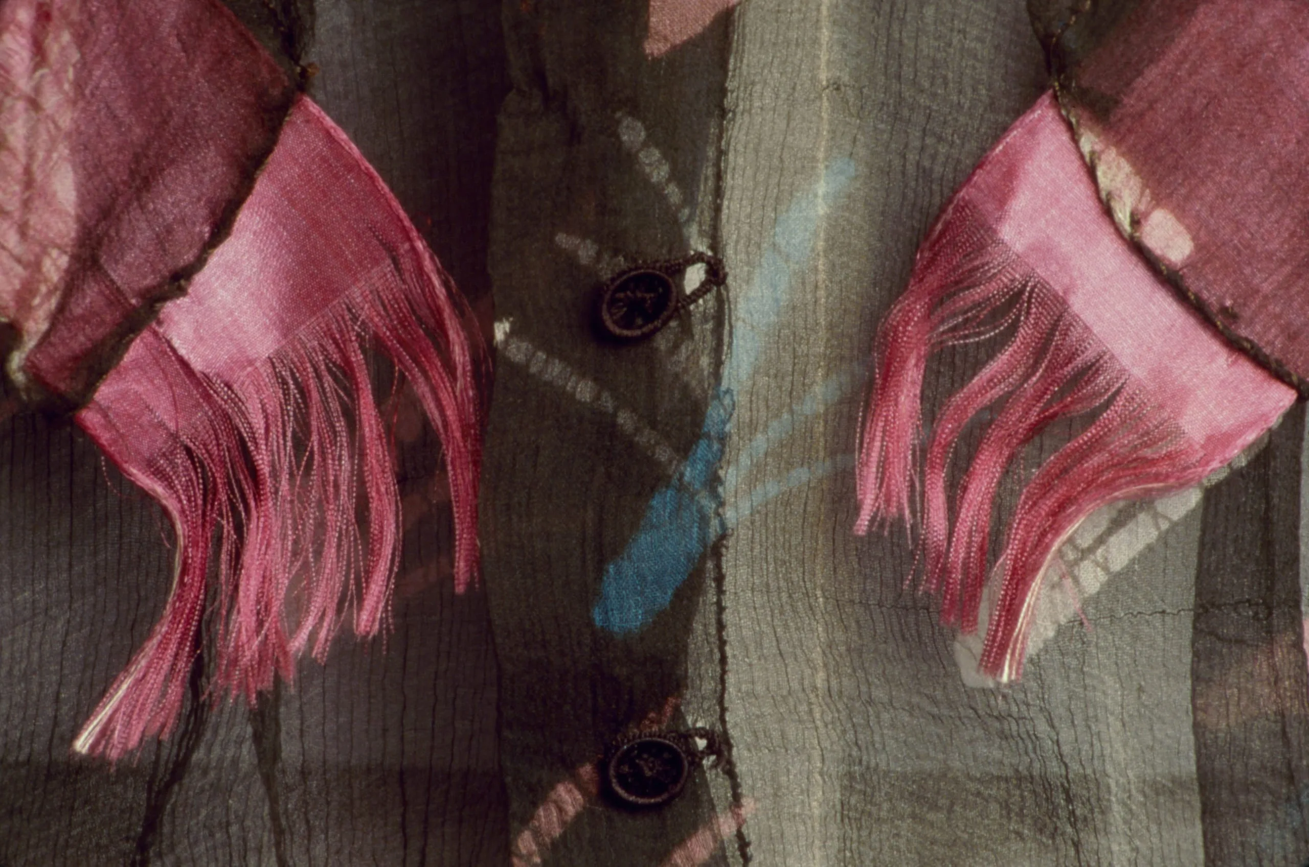 Close-up detail of a textile garment; olive green and gray patterned fabric with two pink silk cuffs trimmed in long fringe, flanking a center front placket with small dark buttons.